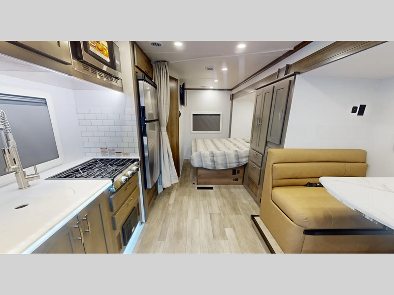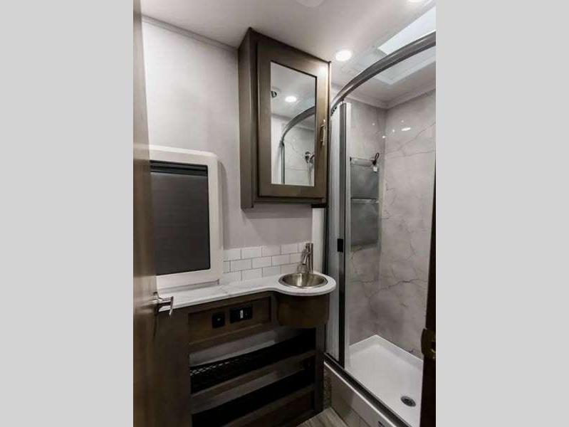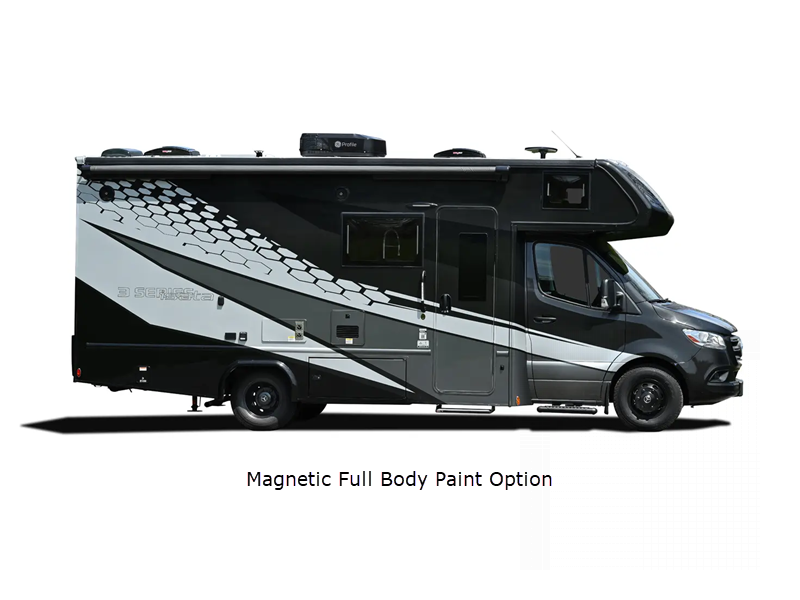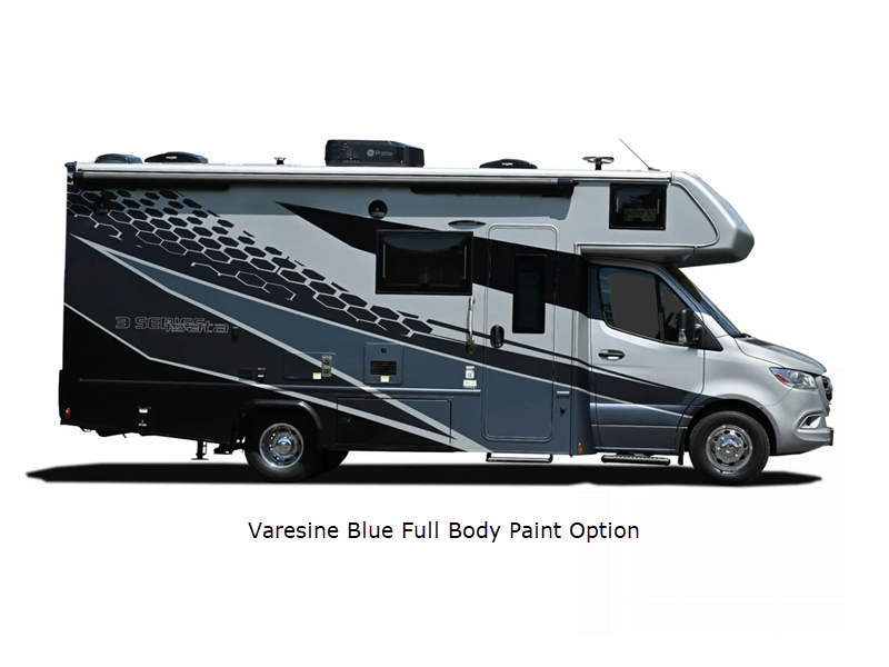 Sleeps 3 Slides 1 Length 24 ft 7 in Ext Width 7 ft 10 in Ext Height 11 ft 5 in Int Height 6 ft 9 in Interior Color Saddle, Milano II Exterior Color Full Body Paint; Magnetic, Varesine Blue, Titanium Hitch Weight 5000 lbs GVWR 11030 lbs Fresh Water Capacity 35 gals Grey Water Capacity 32 gals Black Water Capacity 32 gals Tire Size 16" Furnace BTU 20000 btu Generator Flex Power™ 4000i LP Fuel Type Diesel Engine 2.0L I-4 Chassis Mercedes Benz Sprinter Horsepower 208 hp Wheelbase 170 in Available Beds Queen Torque 332 ft-lb Refrigerator Type 12V Two Door Compressor Driven Refrigerator Size 8 cu ft Convection Cooking Yes Cooktop Burners 3 Number of Awnings 1 Axle Weight Front 4410 lbs Axle Weight Rear 7720 lbs LP Tank Capacity 20.3 gals Water Heater Type Truma Aqua Go Comfort On Demand AC BTU 15000 btu TV Info LR 32" LED Smart TV, BR 32" LED Smart TV Awning Info 16' Armless w/LED Lighting and Motion Activated Retraction Gross Combined Weight 15250 lbs Shower Type Standard Electrical Service 30 amp Similar Floorplans