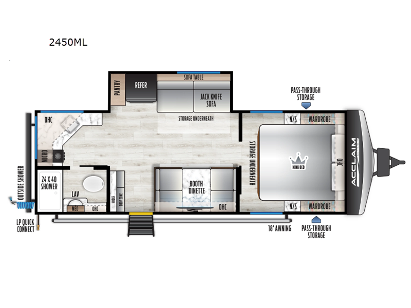 EAST TO WEST Acclaim travel trailers feature an enclosed and heated underbelly, ensuring a cozy and dry space no matter the weather. The 81" interior ceiling height throughout provides ample space to move around, while our residential-inspired kitchen and living spaces make you feel right at home. Our tankless on-demand water heater provides endless hot water, while the power awning with adjustable legs offers the perfect outdoor retreat. The LP quick connect for outdoor grill makes it easy to cook up a storm, whether you're parked in the mountains or by the lake. Plus, with a 7-way plug and chain holder, you'll be ready to hook up and go. We know that pets are part of the family, which is why our trailers are designed with pet-friendly features like D-Ring tie-downs and a pet-friendly layout.