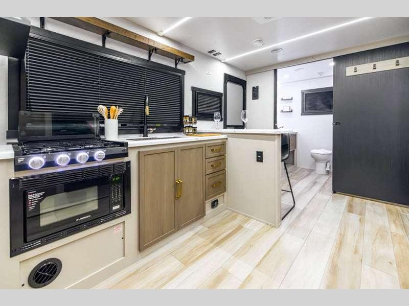 The Weather Shield one-piece fiberglass roof is ultra durable and the enclosed underbelly will help with better temperature control. There is also a shaded pet tether outside, along with a 2" accessory hitch receiver for more camp gear, and an awning with LED lights to name a few more conveniences. Head inside to enjoy Temple Cherry cabinetry with matte gold hardware, painted hardwood interior trim, and 60" x 80" bed for a comfortable stay!