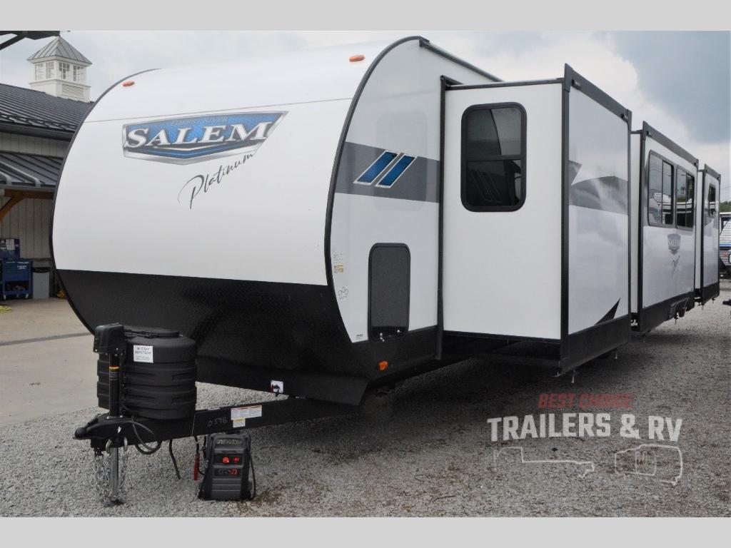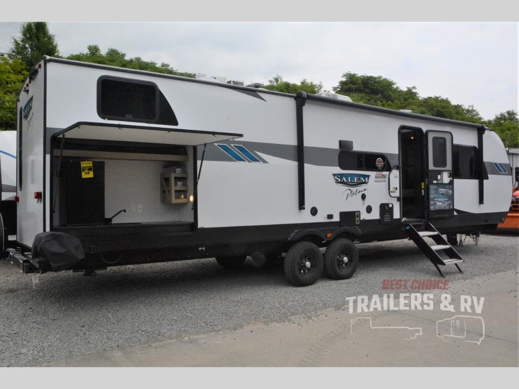 It's time to check out this exciting and full-featured Salem Platinum Edition travel trailer! This unit provides two separated sleeping spaces; a rear private bunkhouse and a front private bedroom. Another feature that is just as helpful as the one in your own home is the kitchen. With an 11 cu. ft. frost free refrigerator, a three burner cooktop, a double sink, and abundant cabinet storage, you will be able to create delicious meals for the entire family. Plus, if you prefer to have a sunrise breakfast, you can simply take your preparations outside to the outdoor kitchen!