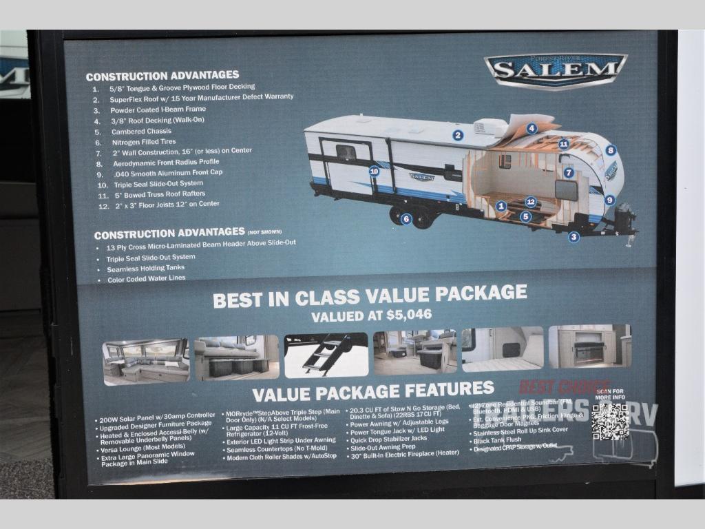 Enjoy years and years of memories with any one of these Forest River Salem travel trailers! They are built with a one piece SuperFlex roof, a powder coated I-beam frame, and an aerodynamic front radius profile for an easier tow. The triple seal slide out system prevents water from seeping inside and keeps it outside where it belongs. The Salem Best In Class Value Package includes upgraded designer furniture, seamless countertops with no T-mold, and two zone residential soundbars with FM, Bluetooth, HDMI and USB. You will also appreciate the heated and enclosed Accessi-Belly with removable underbelly panels, the power tongue jack with an LED light, and the designated CPAP storage. Some new upgraded features include: kitchen backsplash, fireplaces with mirror fronts, bedroom bedding, 12V refrigerator, now with glass doors, and so much more!