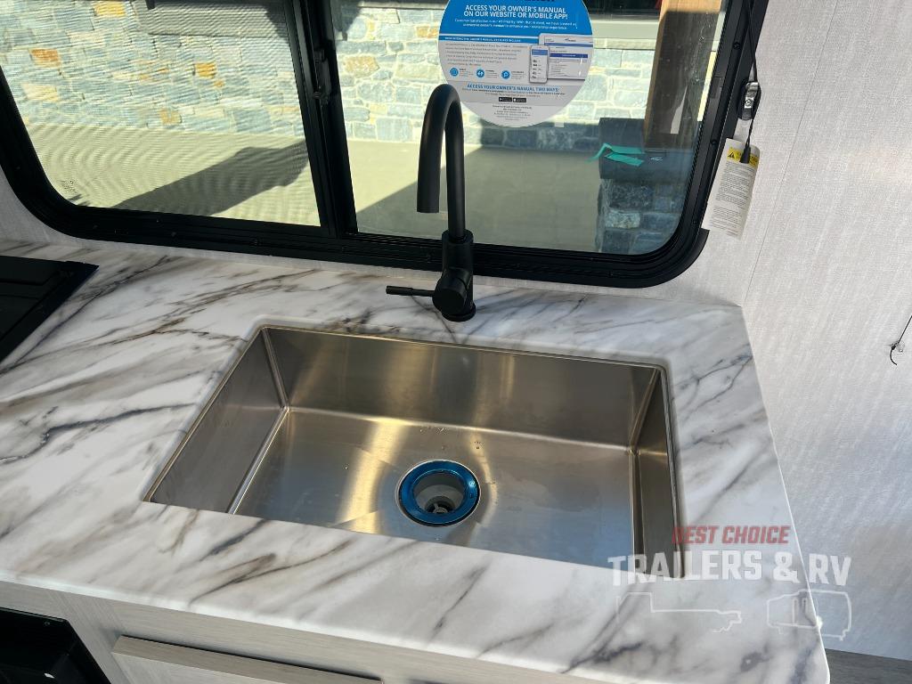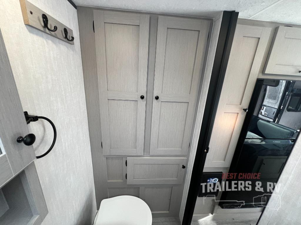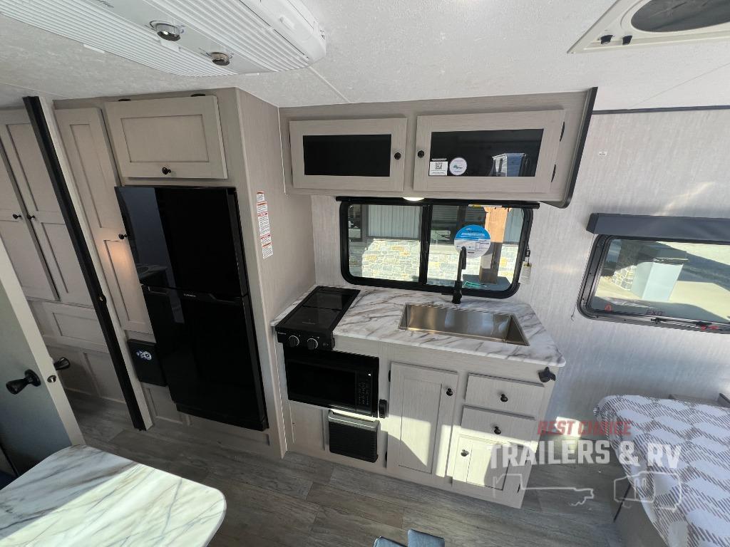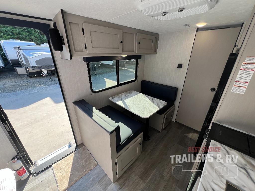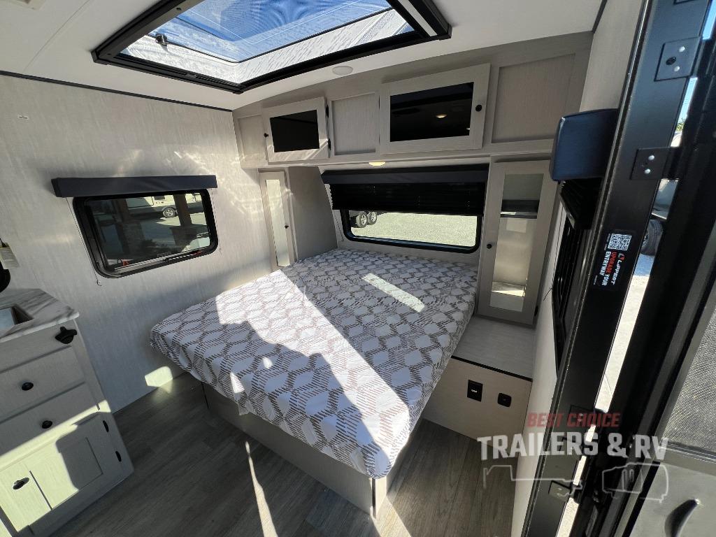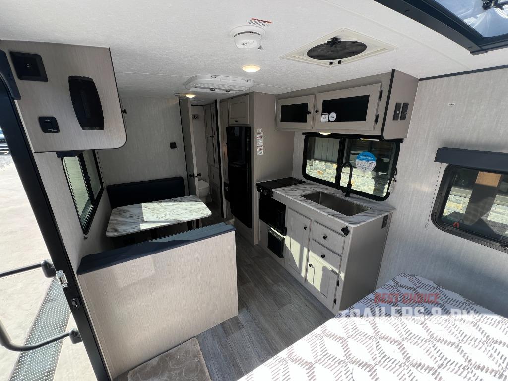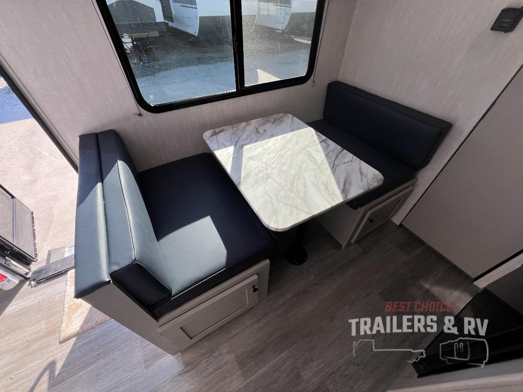Easily head out to the campgrounds with this easy to tow trailer that offers indoor amenities to keep you fed, cleaned and relaxed! The galley kitchen provides a microwave, two burner cooktop and a pantry, plus an 8 cu. ft. 12V refrigerator all at your fingertips, and the rear full bathroom gives you a shower, wardrobe and more! You can eat your meals inside at the booth dinette which also provides sleeping space for one, and the walk-around queen-size bed up front with two wardrobes will allow you to sleep well while away from home.