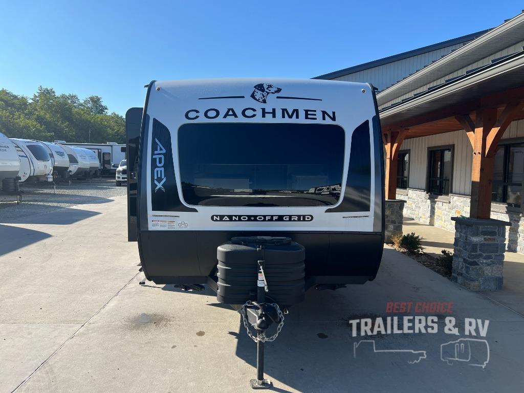 You will find comfort, convenience, and a sturdy construction with each of these Coachmen RV Apex Nano travel trailers! They are held together with an aluma-cage construction, an I-beam chassis, plus vacuum-bonded laminated dual Azdel fiberglass walls for double the protection against the elements. The 200-watt solar panel with a 30 amp control charger is included within the Off-Grid Package, along with two 20 lb. LP tanks, a high velocity power roof vent, plus 12V outlets to keep you powered up. More exterior feature include a hot/cold shower, four stabilizer jacks, a power awning with LED lighting, and magnetic baggage door catches to easily pack and unload your gear. You will love the interior of your Apex Nano with Congoleum residential flooring, one-piece seamless edge countertops, matte black hardware in the galley, and a hand-crafted wood medicine cabinet in the bath.