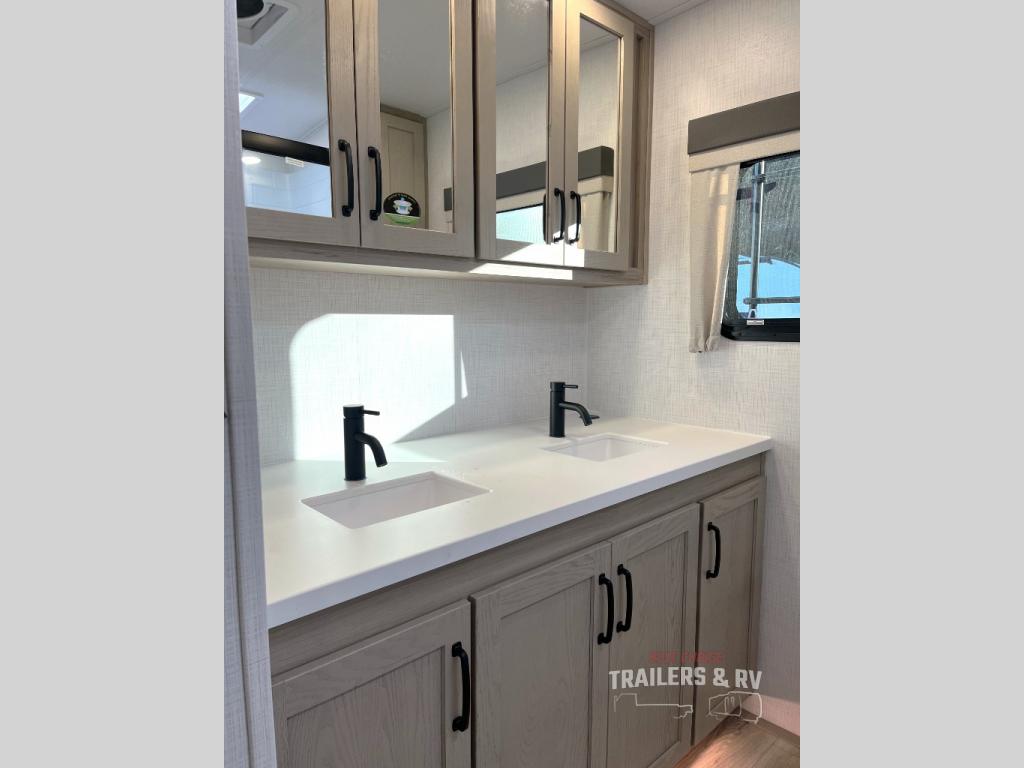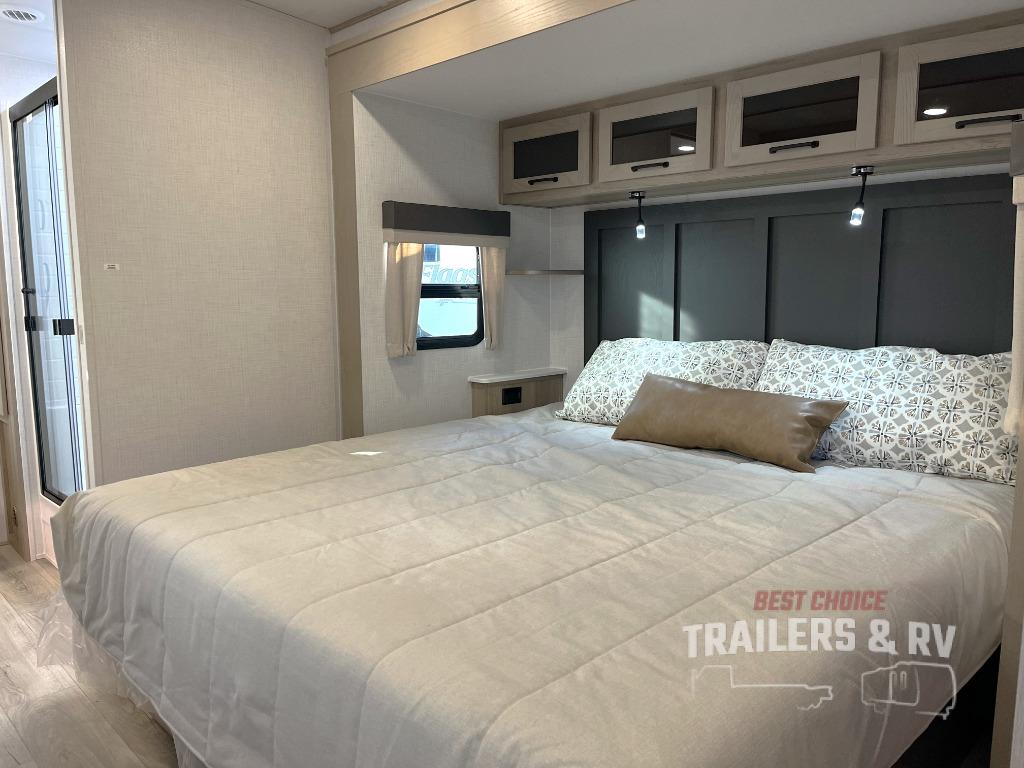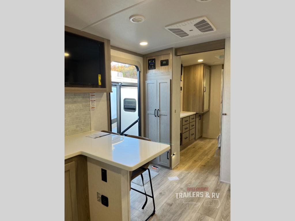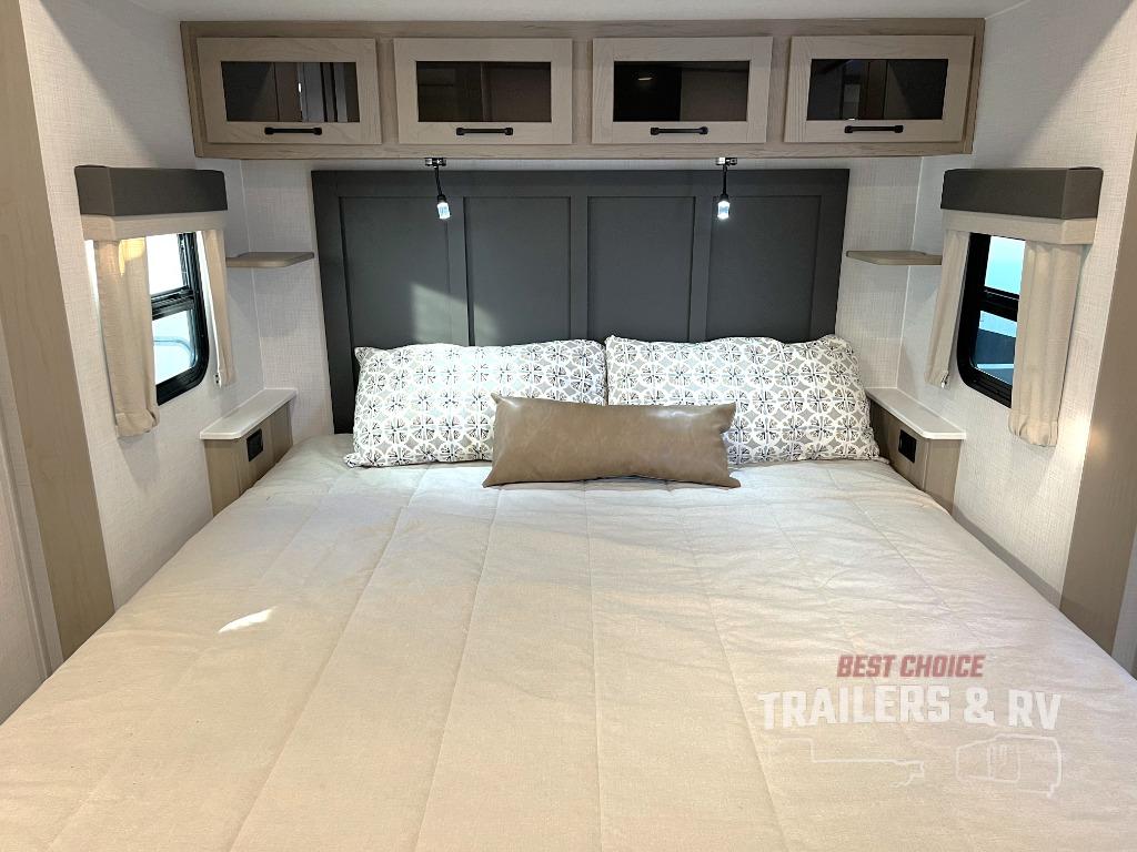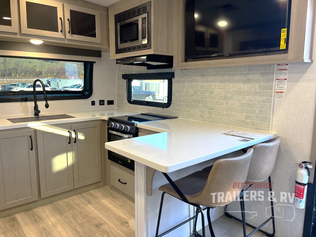 You will love how open this travel trailer will feel with the large front window that you can look out from the two-person bar top seating! The front kitchen has plenty of countertop space for you to prepare your best meals. Your nights will be spent in true relaxation with a 67" theater seating and king bed slide in the bedroom for a great night's rest. The full rear bathroom has a shower with a seat to take a nice, hot shower before bed, and a dual-sink vanity for two to get ready at once in the mornings!