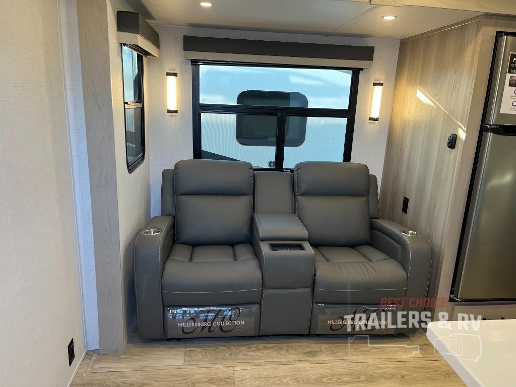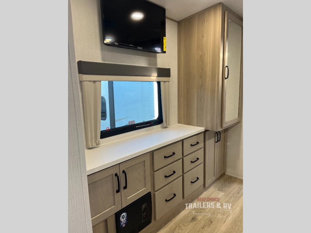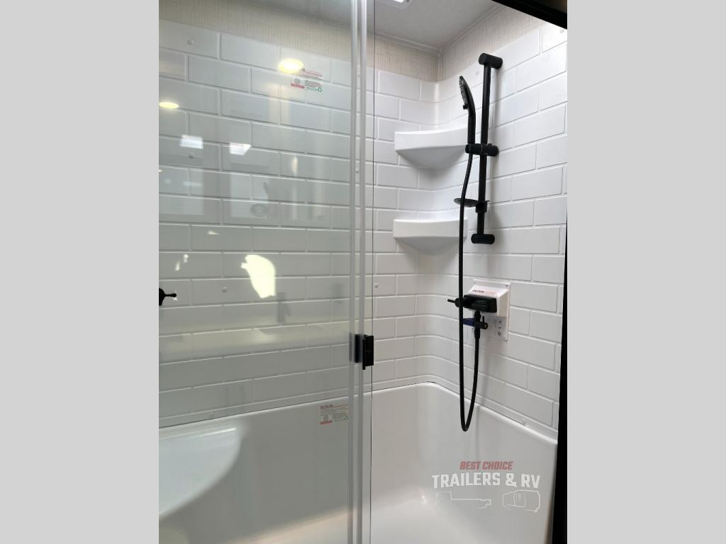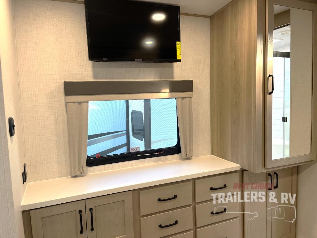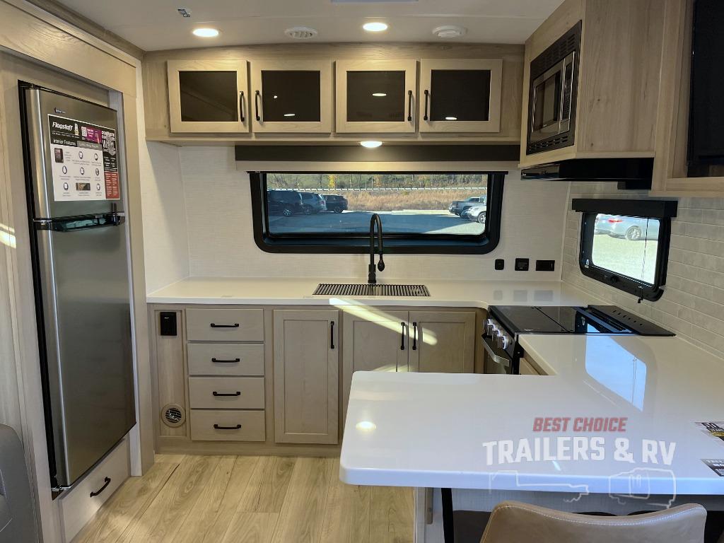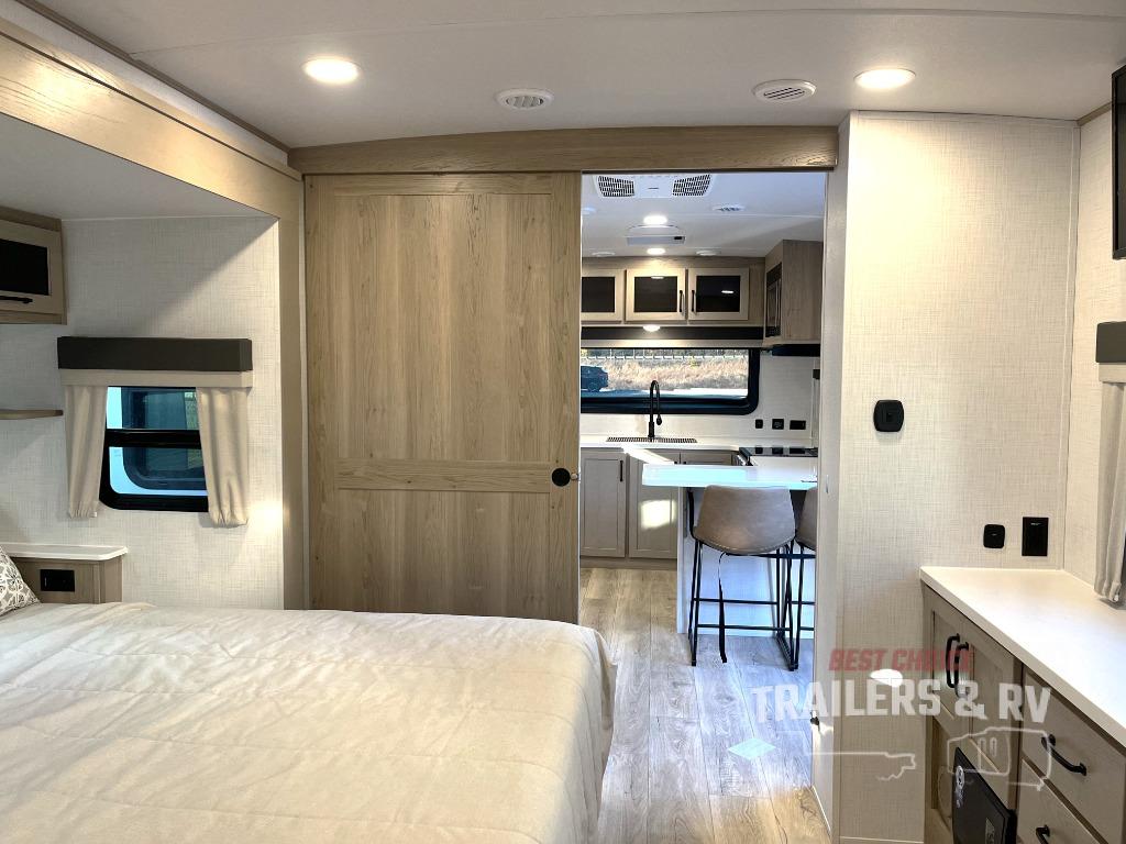 You will love how open this travel trailer will feel with the large front window that you can look out from the two-person bar top seating! The front kitchen has plenty of countertop space for you to prepare your best meals. Your nights will be spent in true relaxation with a 67" theater seating and king bed slide in the bedroom for a great night's rest. The full rear bathroom has a shower with a seat to take a nice, hot shower before bed, and a dual-sink vanity for two to get ready at once in the mornings!