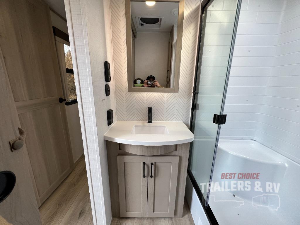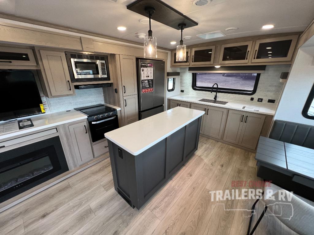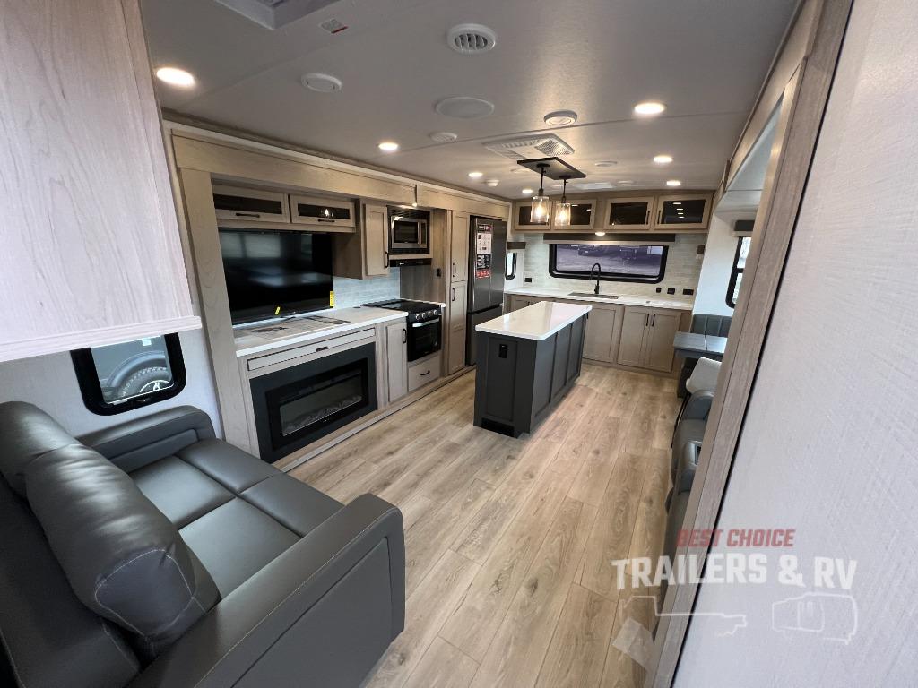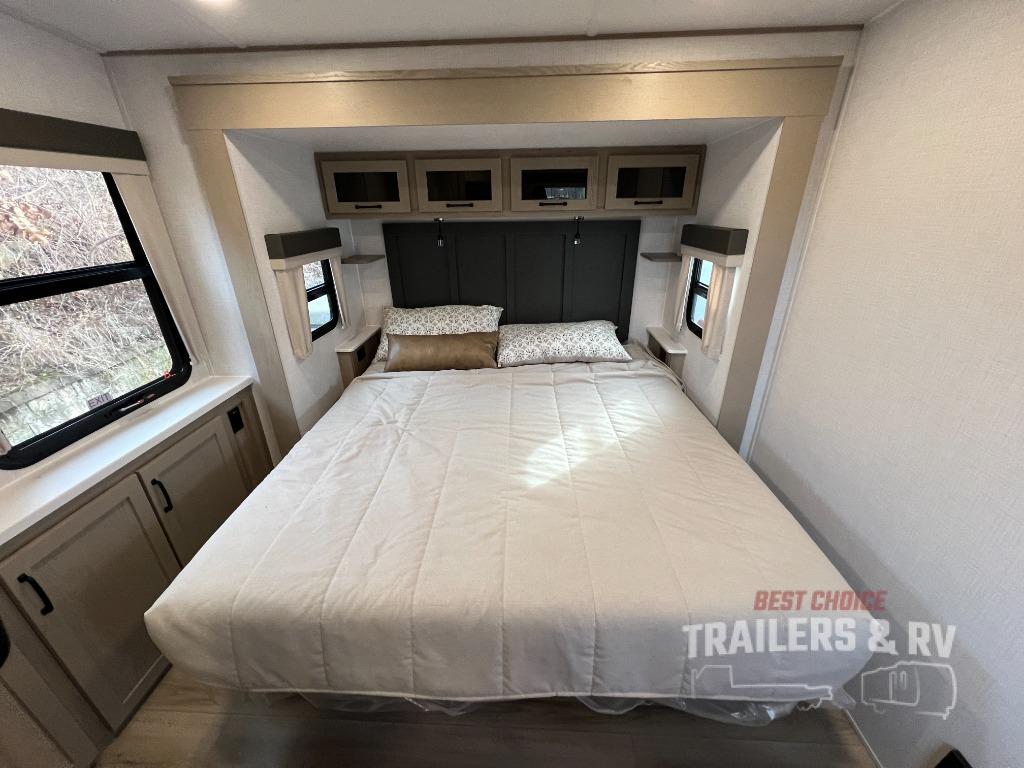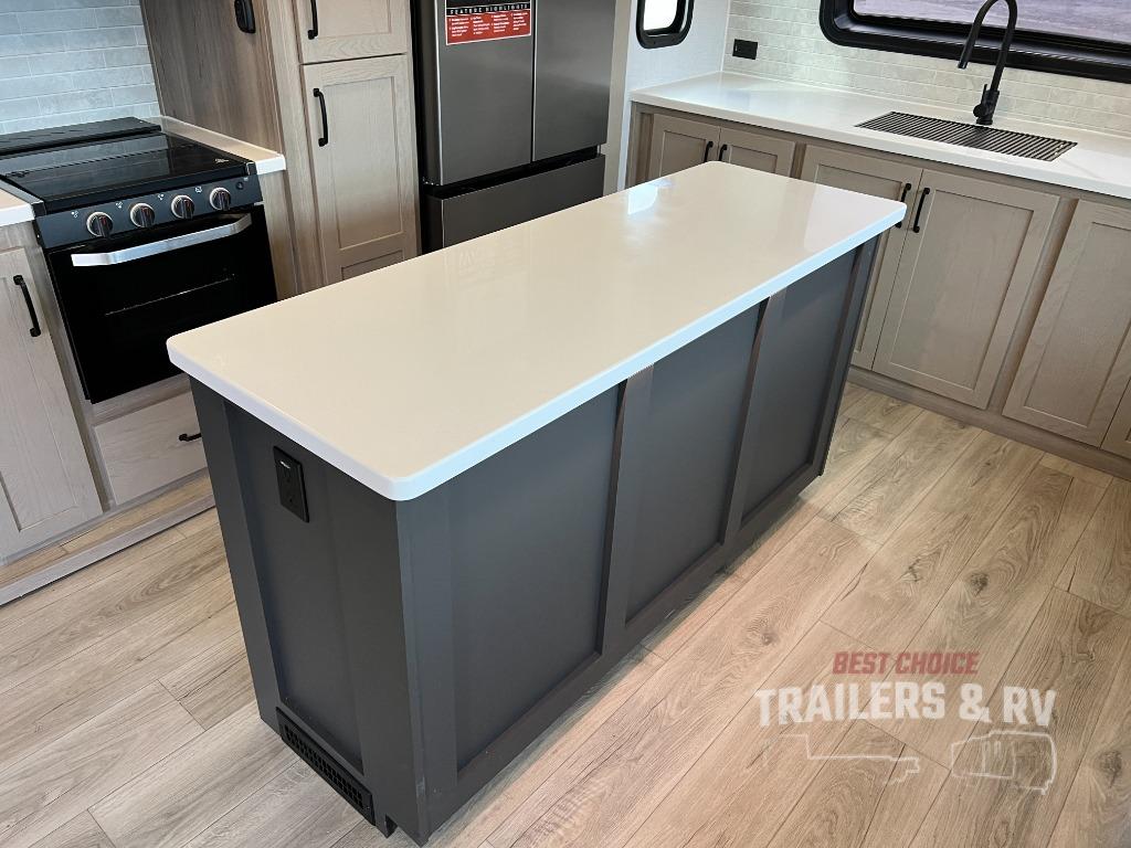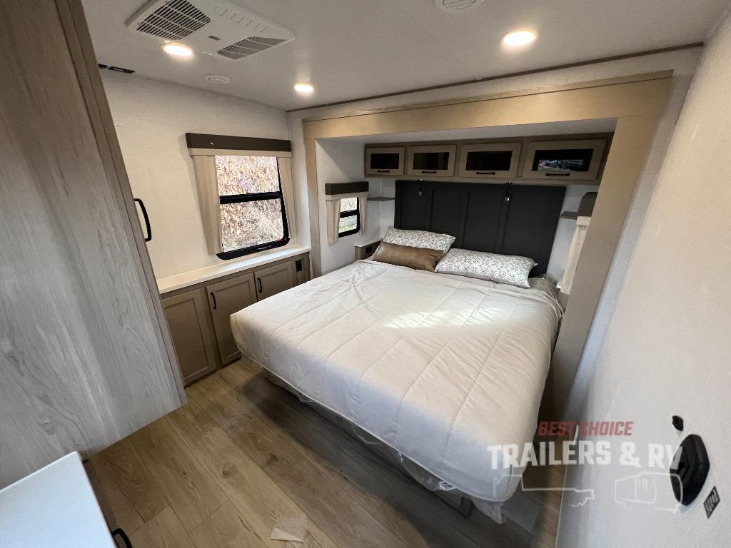 Pack your bags and head for the campground in this spacious travel trailer for four! There are dual opposing slides in the combined kitchen and living room plus a third slide out in the rear bedroom. You're sure to get a great night's rest on the king bed, and you can keep your room picked up thanks to the dresser and wardrobe. There is even washer and dryer prep if you choose to add those appliances. There are plenty of spaces to relax, including a theater seat and a hide-a-bed sofa, which will double as your guests' sleeping space. A large kitchen island and generous counter space lets the chef of your group whip up their best meals, and there is a table, chairs and a bench for dining space. If the weather is nice, you may want to make dinner on the exterior griddle while enjoying the two power awnings!