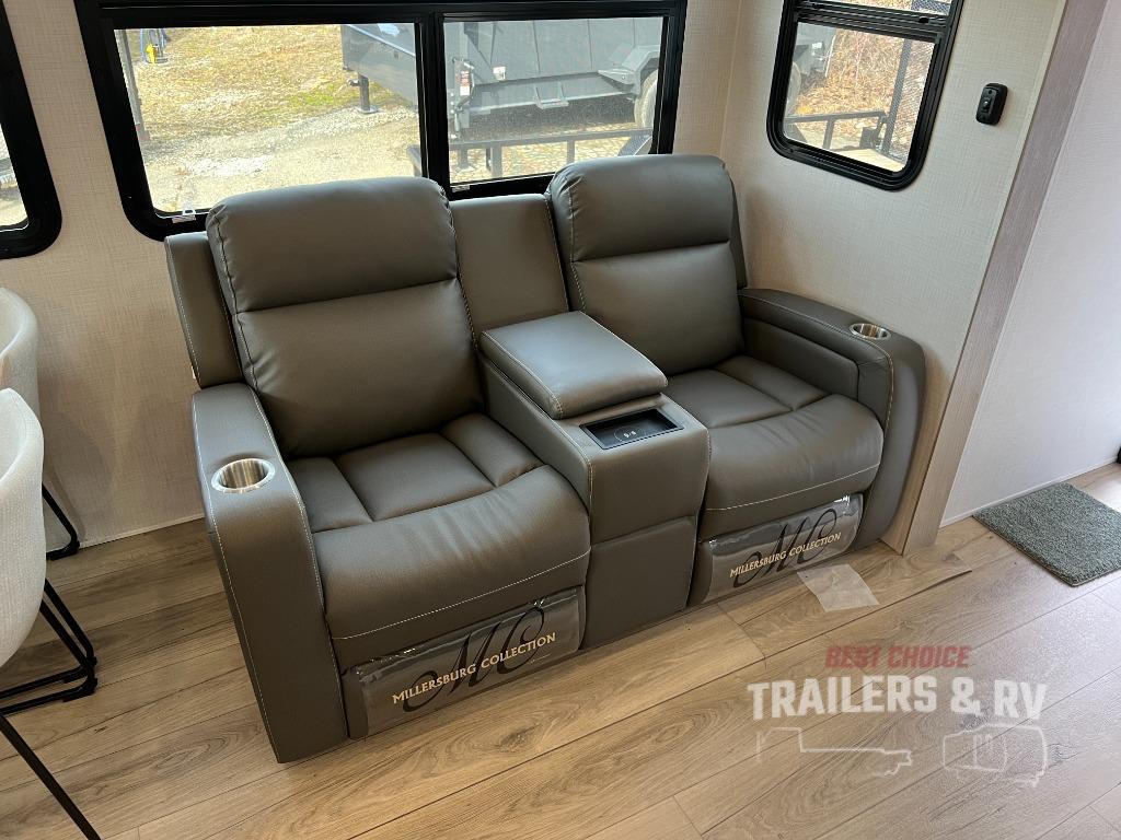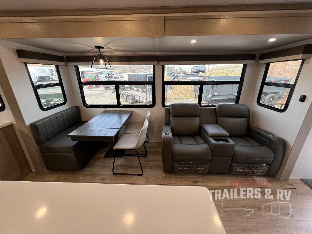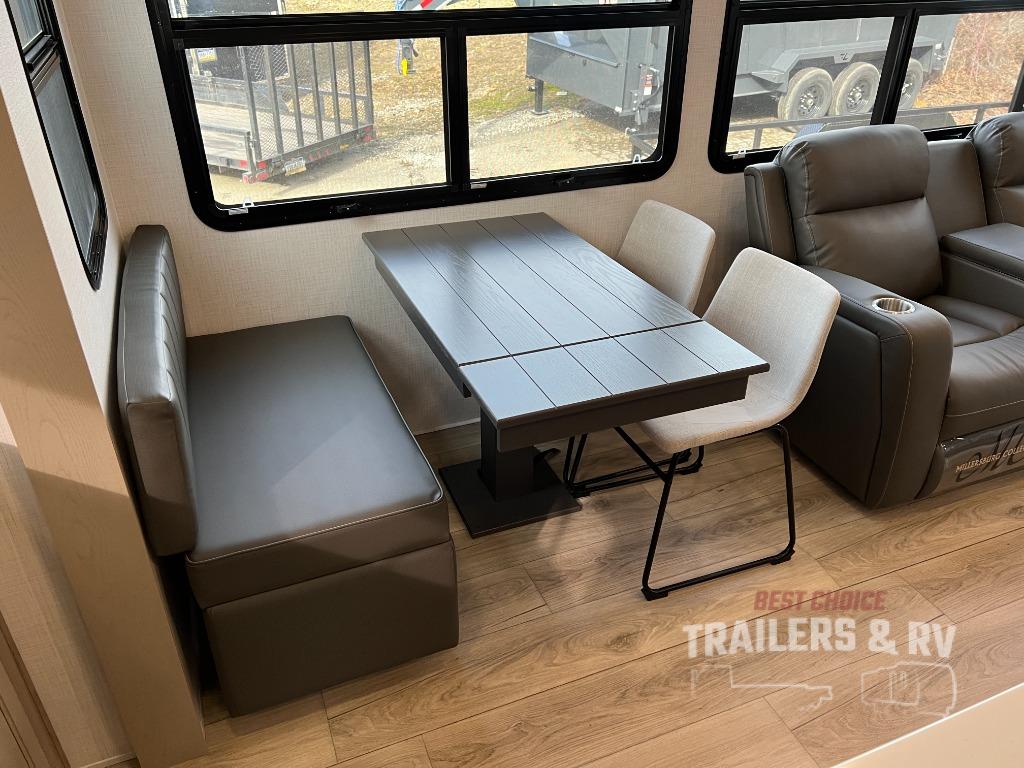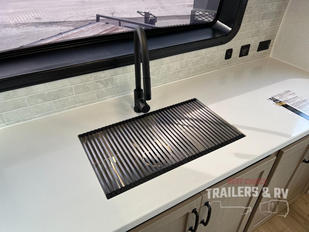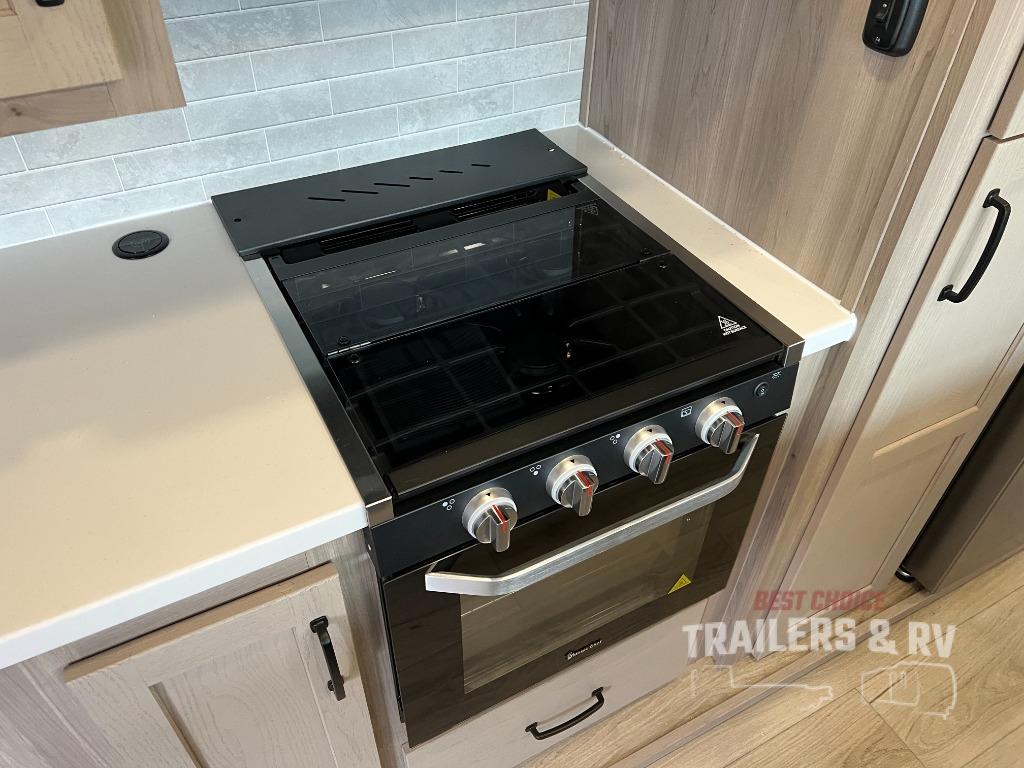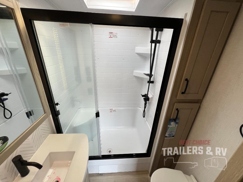 Pack your bags and head for the campground in this spacious travel trailer for four! There are dual opposing slides in the combined kitchen and living room plus a third slide out in the rear bedroom. You're sure to get a great night's rest on the king bed, and you can keep your room picked up thanks to the dresser and wardrobe. There is even washer and dryer prep if you choose to add those appliances. There are plenty of spaces to relax, including a theater seat and a hide-a-bed sofa, which will double as your guests' sleeping space. A large kitchen island and generous counter space lets the chef of your group whip up their best meals, and there is a table, chairs and a bench for dining space. If the weather is nice, you may want to make dinner on the exterior griddle while enjoying the two power awnings!