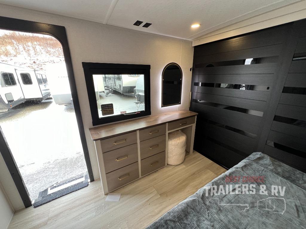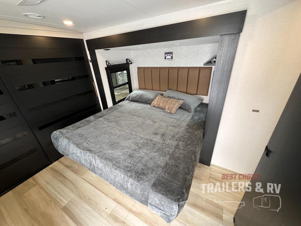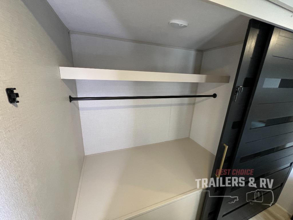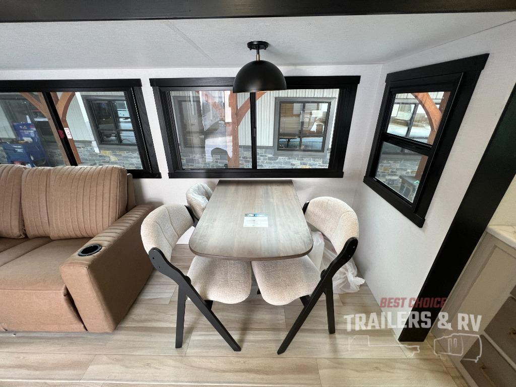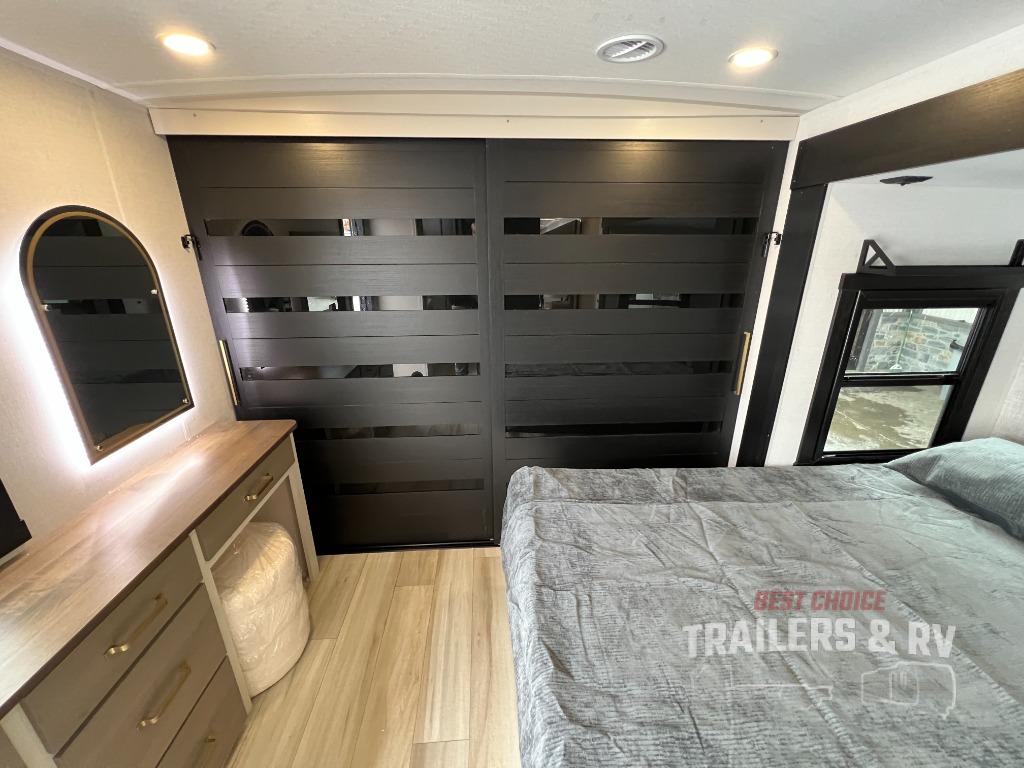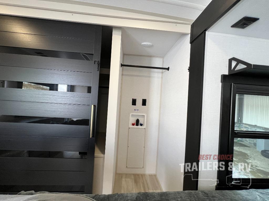 Once you step inside this dual entry travel trailer, you won't want to camp any other way! The rear private bedroom will have you feeling right at home with the custom king bed across from a dresser with a TV hookup, a large bedroom wardrobe, and there is even a closet with washer/dryer prep. The dual entry bath makes it easy for everyone to access and it has a radius shower with a skylight above for added natural lighting as you get ready each morning. Both the theater seating and the booth dinette have a panoramic window for you to look out at your beautiful scenery. The chef of the group will love cooking in the front kitchen with all of the extra countertop space, as well as outdoors with the outside kitchen!