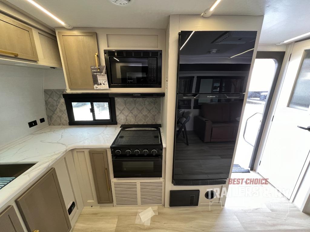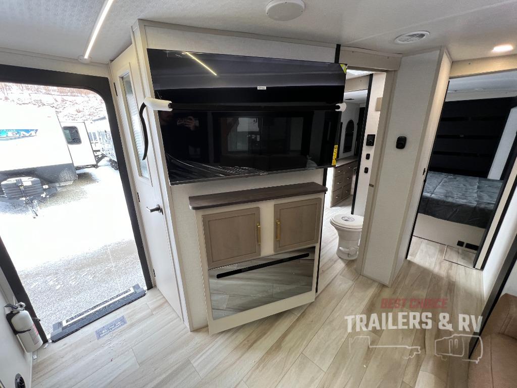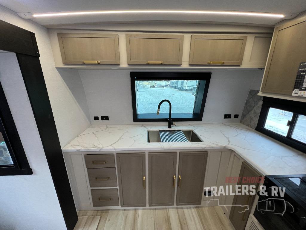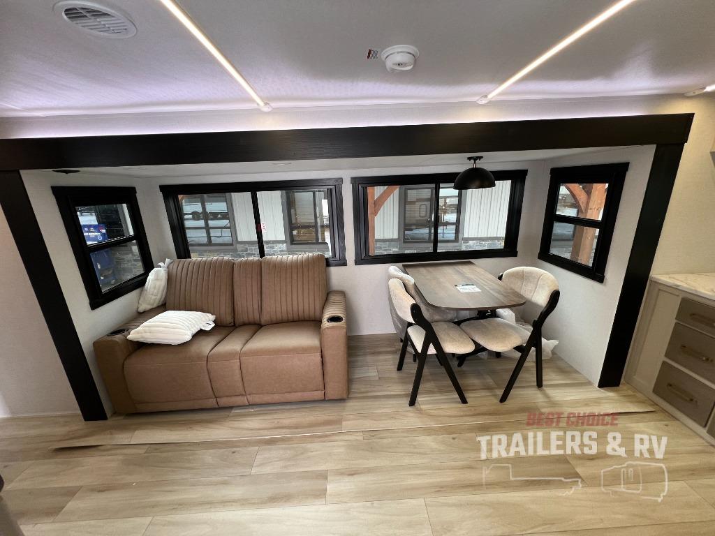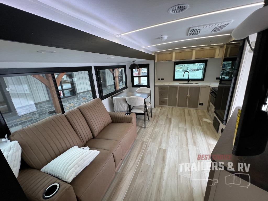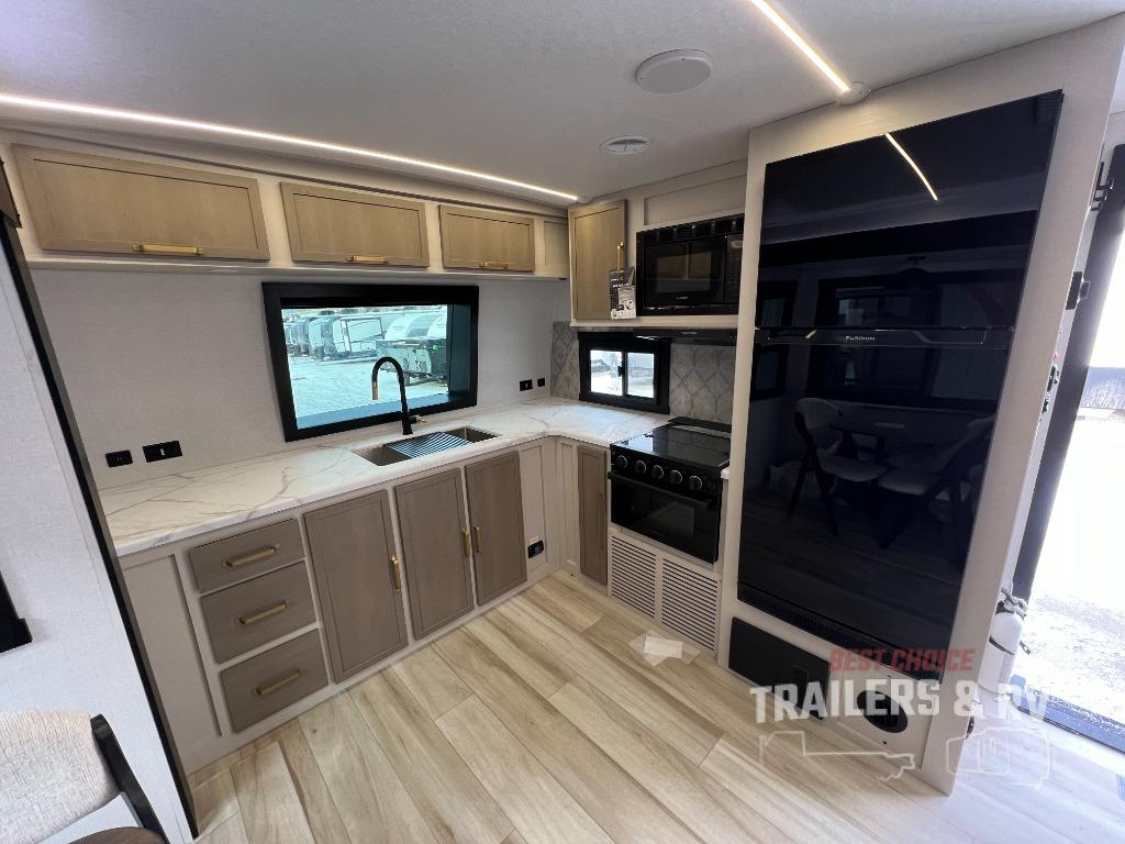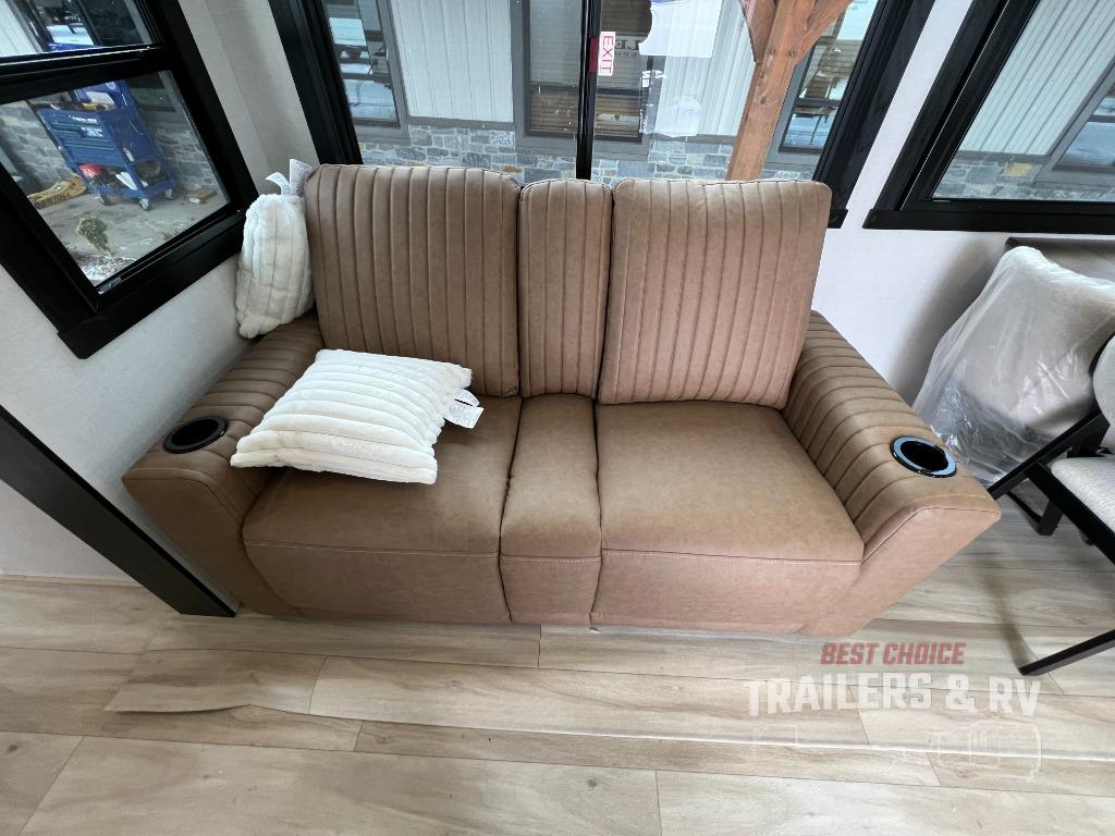 Once you step inside this dual entry travel trailer, you won't want to camp any other way! The rear private bedroom will have you feeling right at home with the custom king bed across from a dresser with a TV hookup, a large bedroom wardrobe, and there is even a closet with washer/dryer prep. The dual entry bath makes it easy for everyone to access and it has a radius shower with a skylight above for added natural lighting as you get ready each morning. Both the theater seating and the booth dinette have a panoramic window for you to look out at your beautiful scenery. The chef of the group will love cooking in the front kitchen with all of the extra countertop space, as well as outdoors with the outside kitchen!