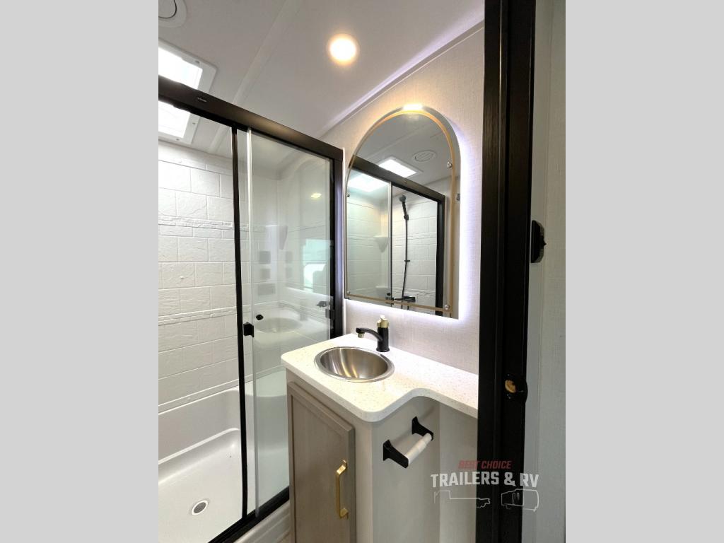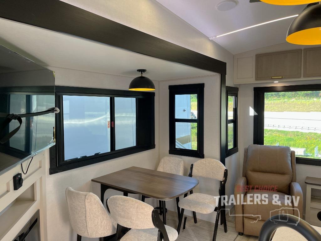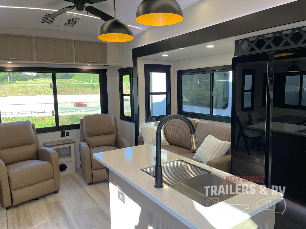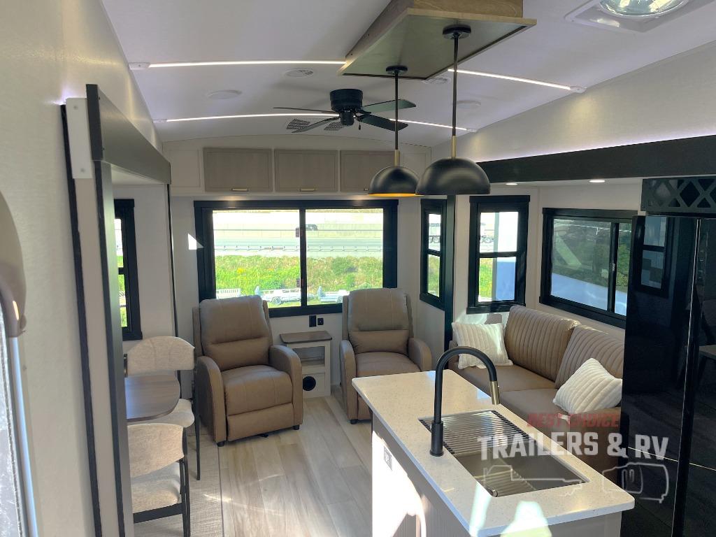 Enjoy the sunshine with panoramic windows throughout this fifth wheel! The rear living area is perfect for relaxing in at night on one of the two chairs or the tri-fold sofa. There is also a table with four chairs, a 50" LED TV, and a fireplace to make this area feel more like home. The kitchen has an island with a large sink to make clean up easier and a pantry big enough to store everyone's favorite snacks. The full bathroom has a residential walk-in shower with a skylight above for natural lighting as you get ready. When you're ready to hit the sack, head to the front private bedroom and enjoy a good night's rest on the custom king bed!