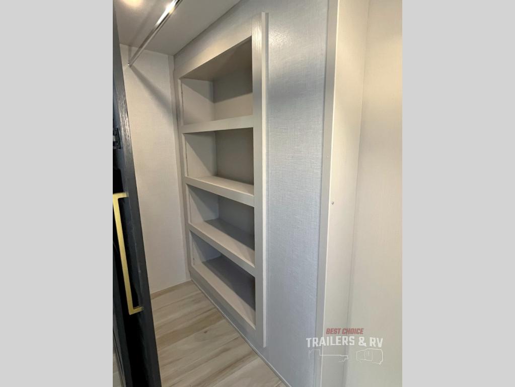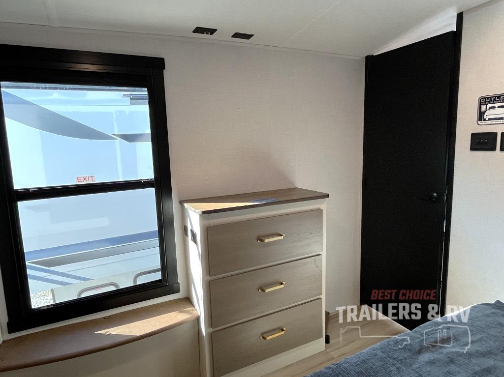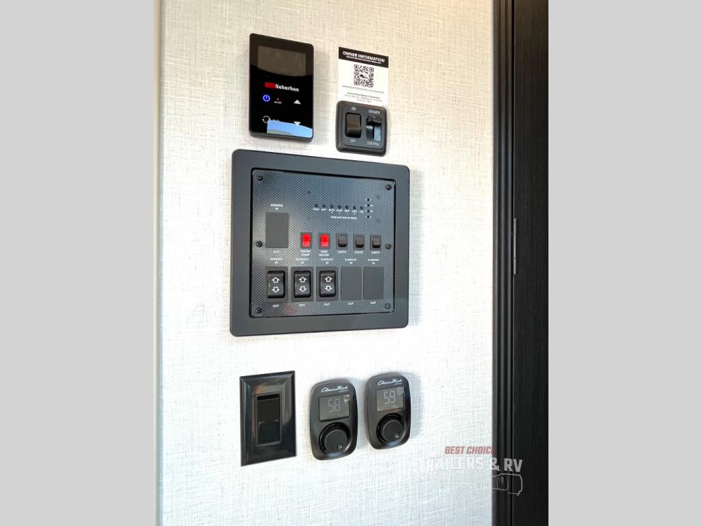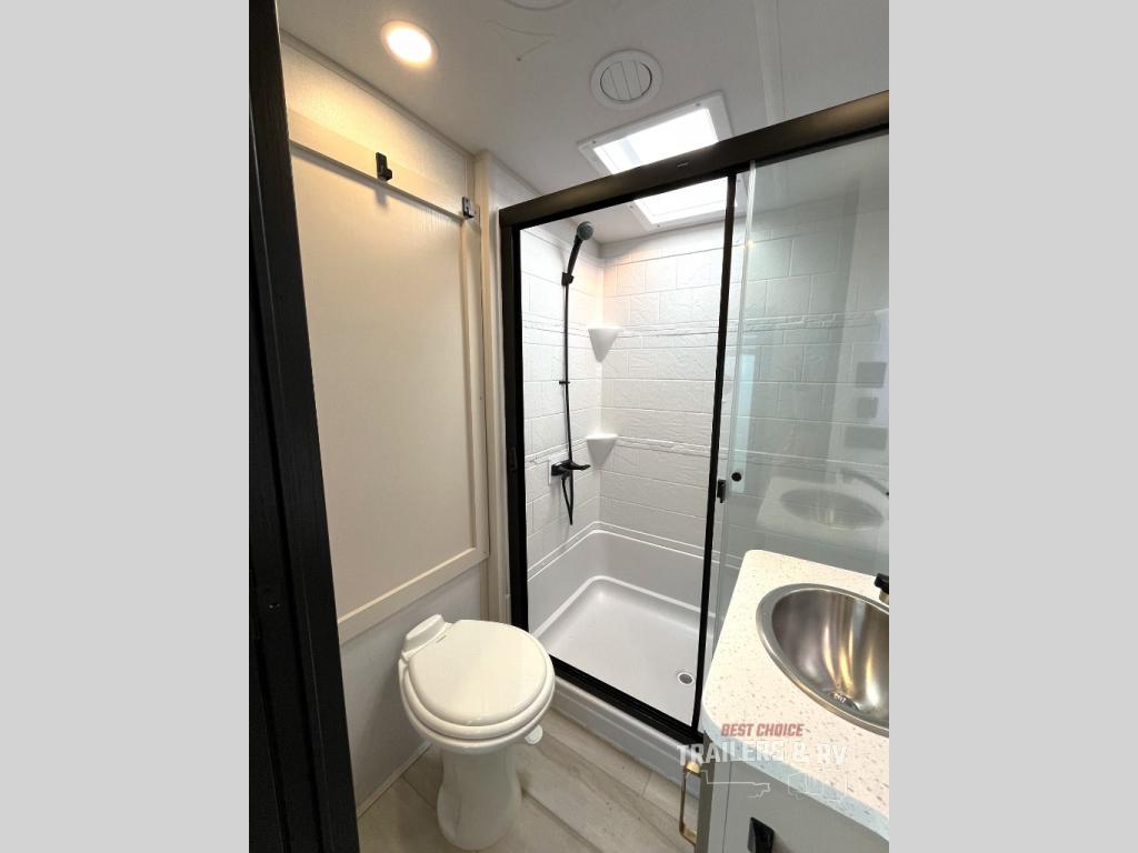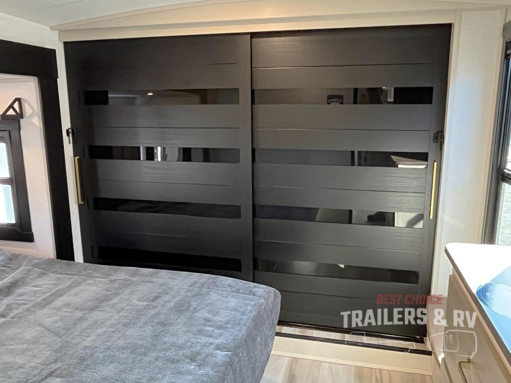 Enjoy the sunshine with panoramic windows throughout this fifth wheel! The rear living area is perfect for relaxing in at night on one of the two chairs or the tri-fold sofa. There is also a table with four chairs, a 50" LED TV, and a fireplace to make this area feel more like home. The kitchen has an island with a large sink to make clean up easier and a pantry big enough to store everyone's favorite snacks. The full bathroom has a residential walk-in shower with a skylight above for natural lighting as you get ready. When you're ready to hit the sack, head to the front private bedroom and enjoy a good night's rest on the custom king bed!