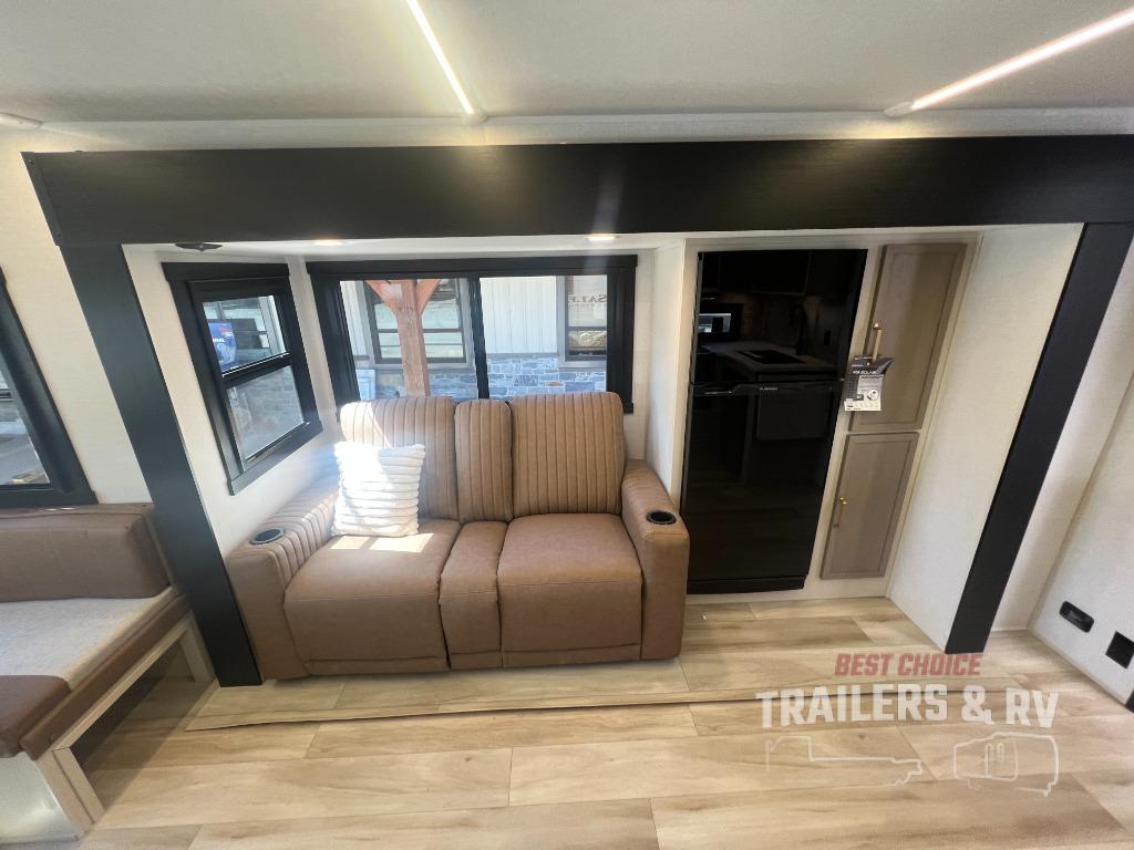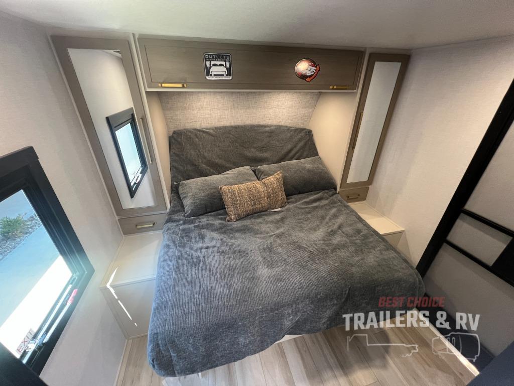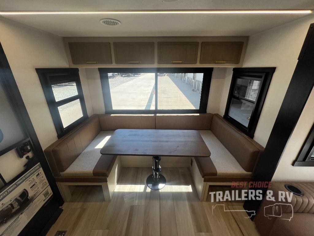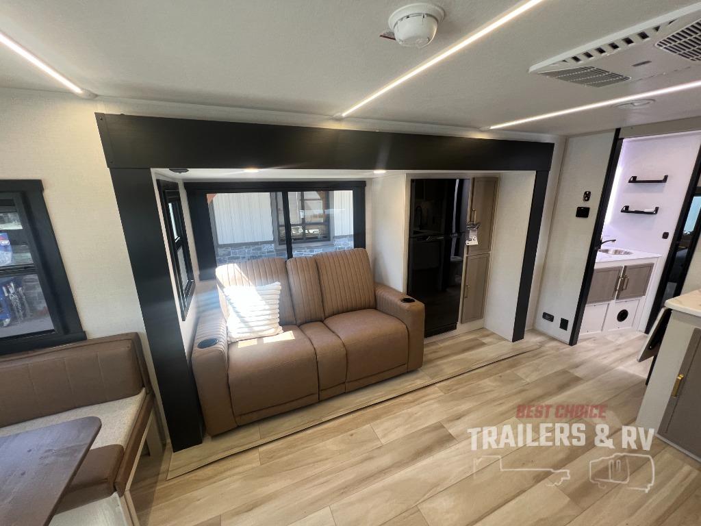 This dual entry travel trailer is perfect for your family or group of four! There is a front master bedroom up front with its own exterior entry door so you can slip out in the morning to go fish. You'll also find a queen bed with Versa-Tilt, dual bedroom wardrobes, and easy access to the walk-through bath. Any guests you have can sleep on the U-shaped dinette in the back, and in the morning, everyone can enjoy breakfast here before heading out for the day. You can prepare lunch in the full kitchen that includes a countertop extension for convenience, plus a 12V refrigerator and a pantry for food storage. If the weather is nice, you might just want to cook on the exterior griddle, and the outdoor refrigerator will let you store cold drinks! On the rainy days you can plan to relax on the theater seating within the slide out and watch a movie on the 40" LED TV. There is even a fireplace for a more cozy feel.