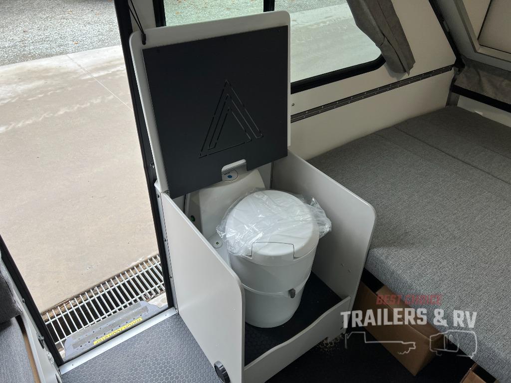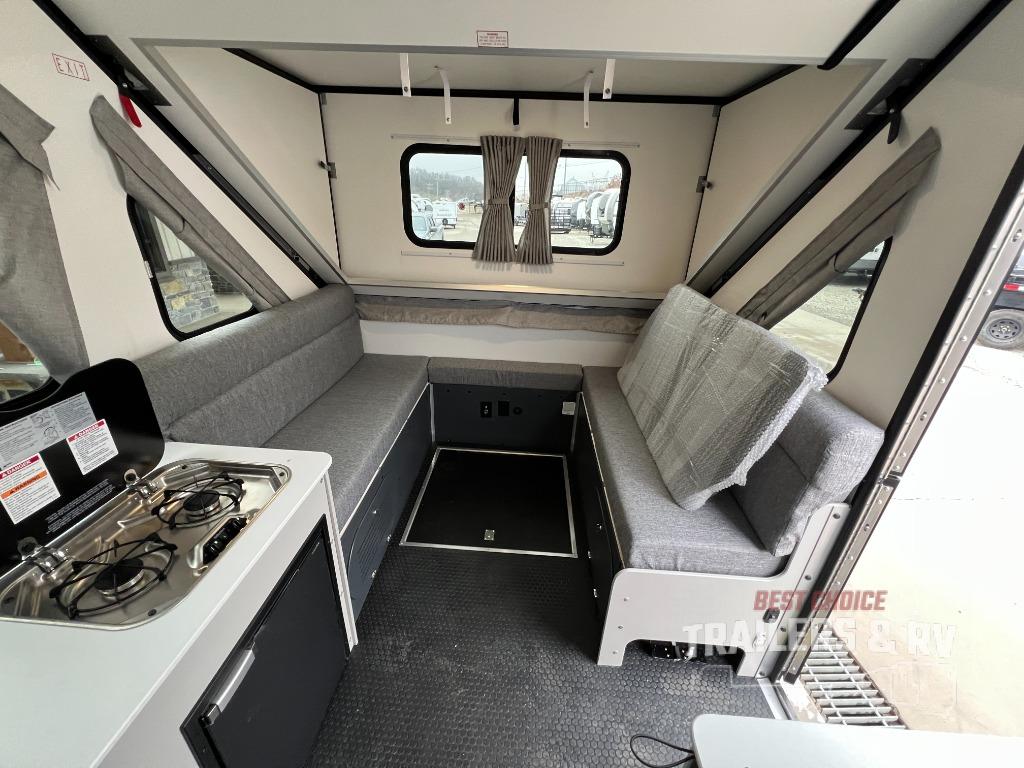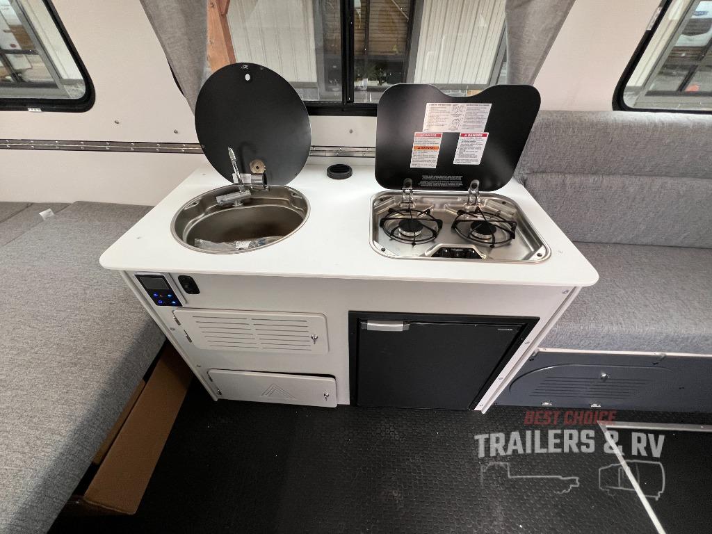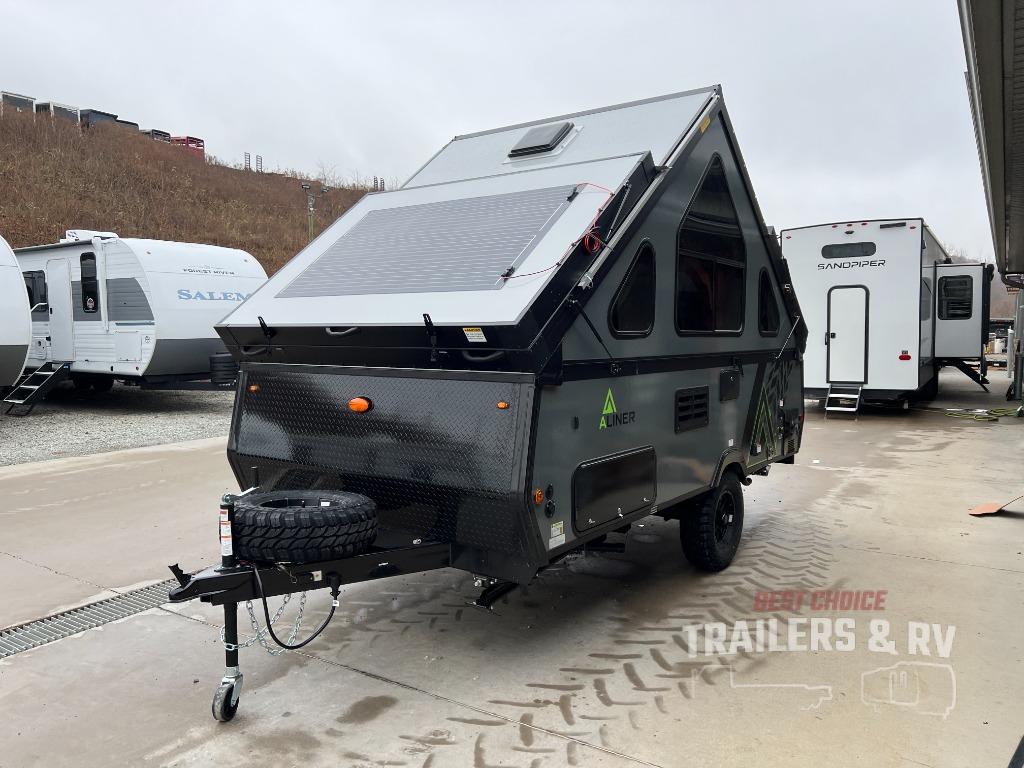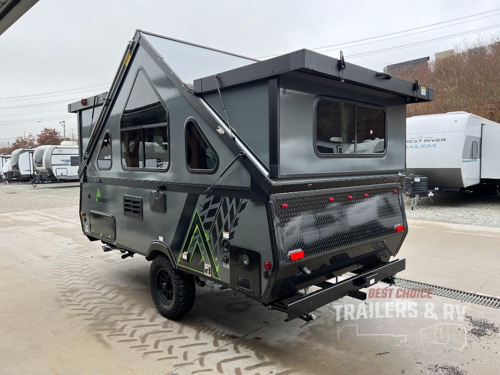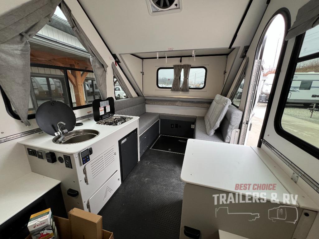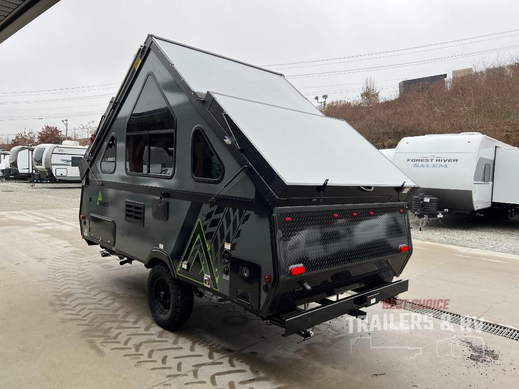 The Evolution A-frame camper by Aliner is coming to you with residential features and solid construction materials. You'll love the slate gray exterior, aluminum wheels, and the Azdel composite panels to help prolong the life of your camper. There are LED running lights, exterior baggage doors, and four stabilizer jacks to help keep your camper secure. You will also appreciate the keyless entry, the dual LP tanks with a cover, and the 200-watt solar panel on the front dormer for some off-grid power. The lift kit and 15" off-road tires add 3" to the height, allowing you to explore more roads, and you'll find many interior comforts to make you feel right at home!