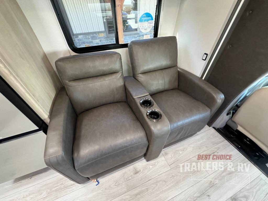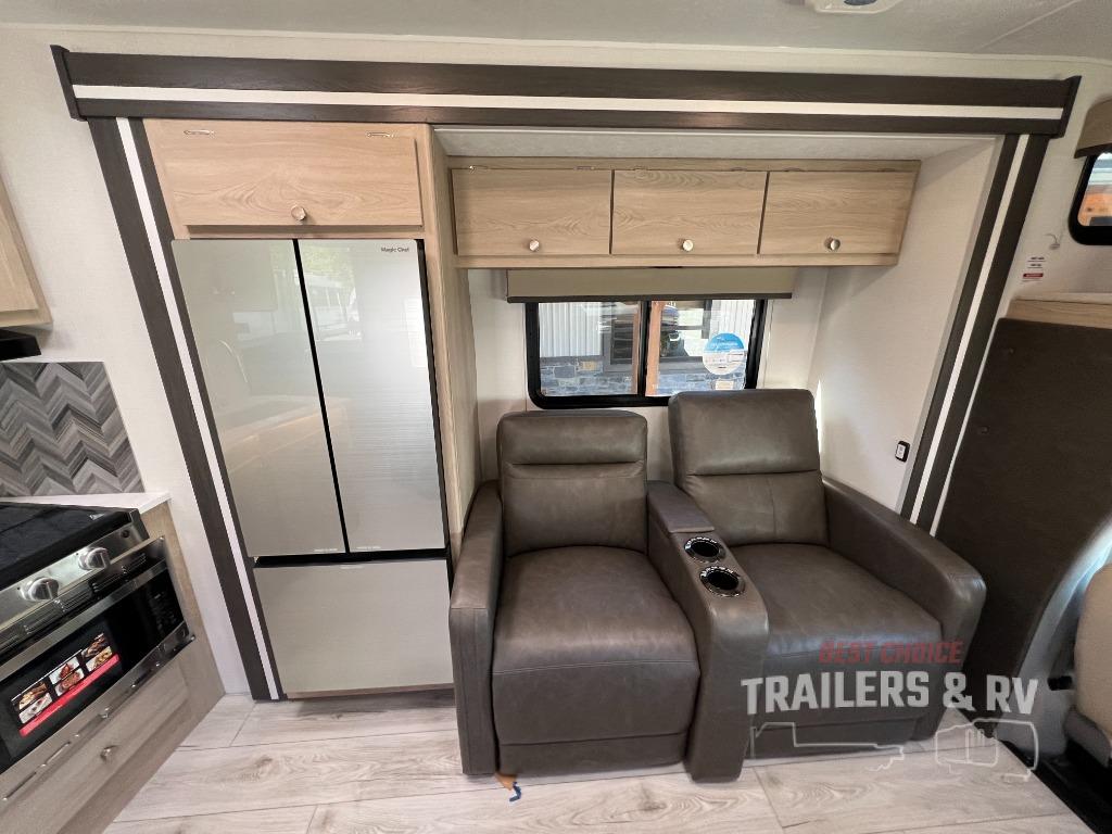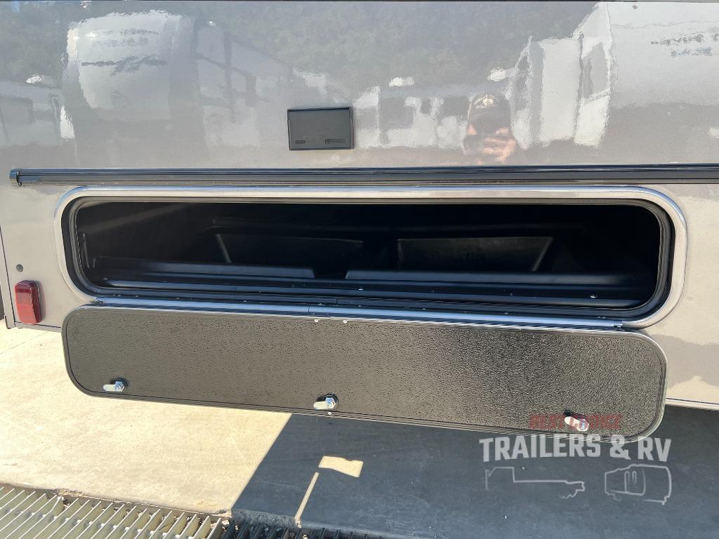 Take in the charm and style found on this Leprechaun Class C gas motorhome! The king bed slide is the perfect complement to the rear master suite, and the 44" x 76" J-lounge with 18" extension and 62" sofa are excellent additions to the living area. The kitchen has a three-burner cooktop with cover as well as a microwave oven for preparing easy meals. The 21' power awning will provide protection when you're enjoying time outdoors, and you might want to add the optional outside entertainment center for movie nights!