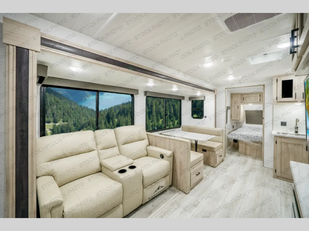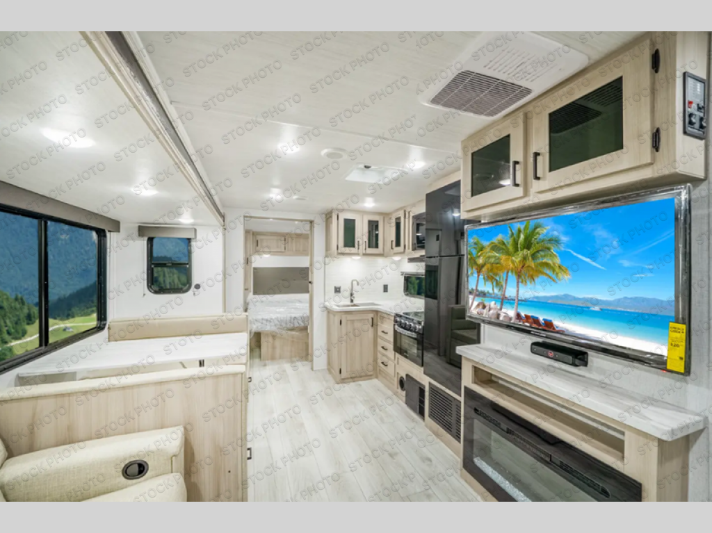 When you are wanting a little more interior space in your next travel trailer, take a look inside! This large slide out widens the center so you can easily make meals using full amenities without having to move for someone walking from the front private bedroom to the rear spacious bathroom. There is a king-size bed with storage on both sides, underneath and above, plus a space saving sliding door. The booth dinette and jiffy sofa offer comfortable seating as well as extra sleeping space for overnight guests. The fireplace is just a nice feature to enjoy, and the large pantry with washer/dryer prep gives you the option to make laundry day easier!