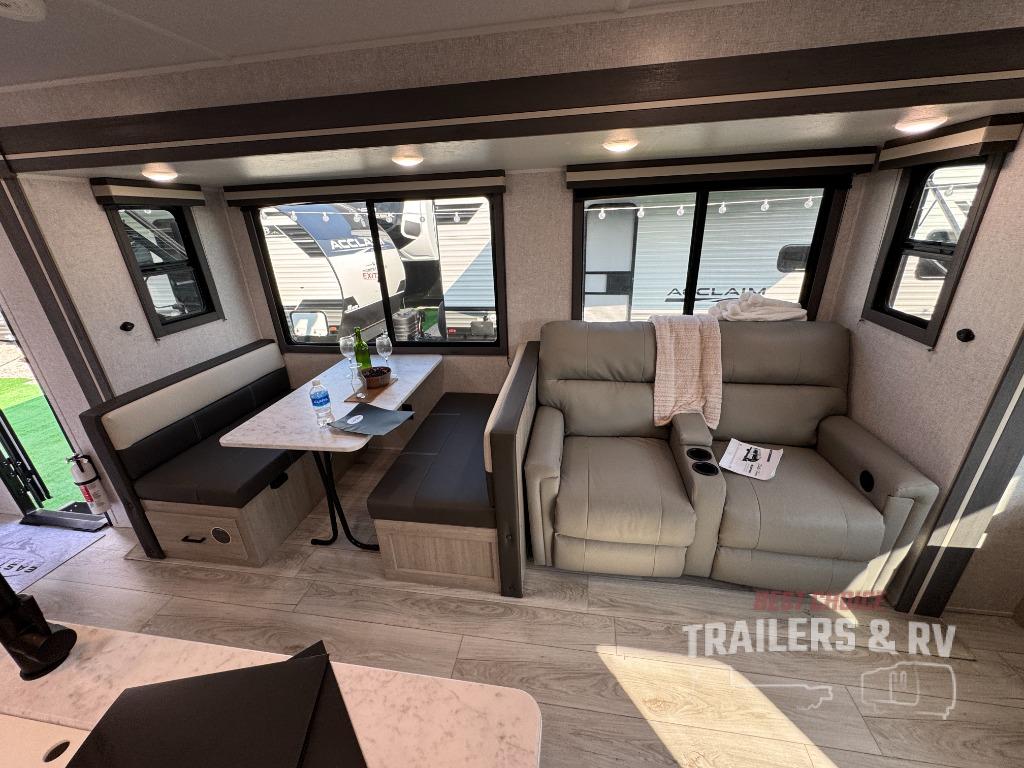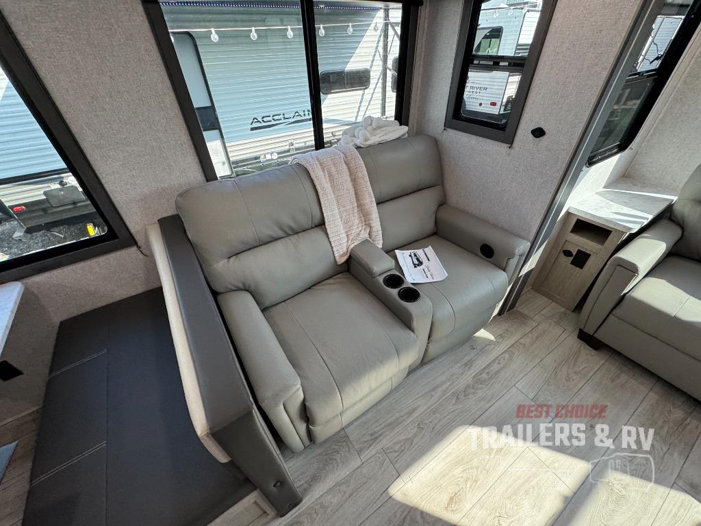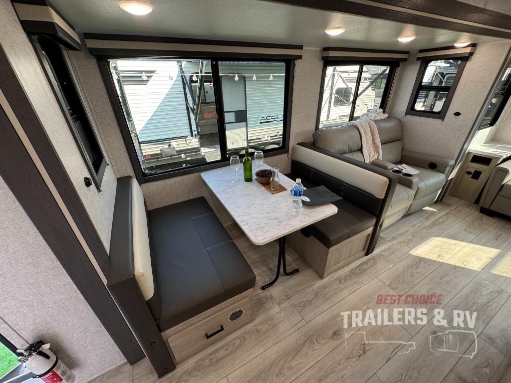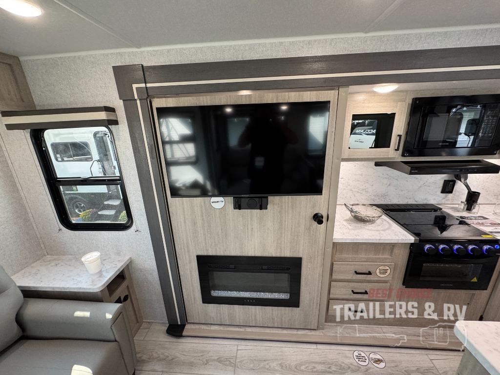 Camping in this double slide out travel trailer will be easier than ever! Once you arrive at your destination, set up the power awning, unload the pass-through storage, and head inside to make lunch in the full kitchen. There is a kitchen island for more prep space, along with a 10.7 cu. ft. 12V refrigerator, three burner range, and microwave oven. You'll find comfortable seating space on the booth dinette, jiffy sofa, and dual lounge chairs, and the fireplace is sure to make your space feel more like home. There is also hidden storage behind the fireplace for pantry items, board games, and more! Up front, a full bath and front private bedroom will let you freshen up before a great night's rest on the king bed!