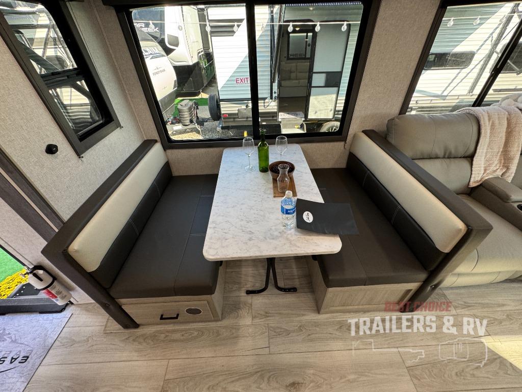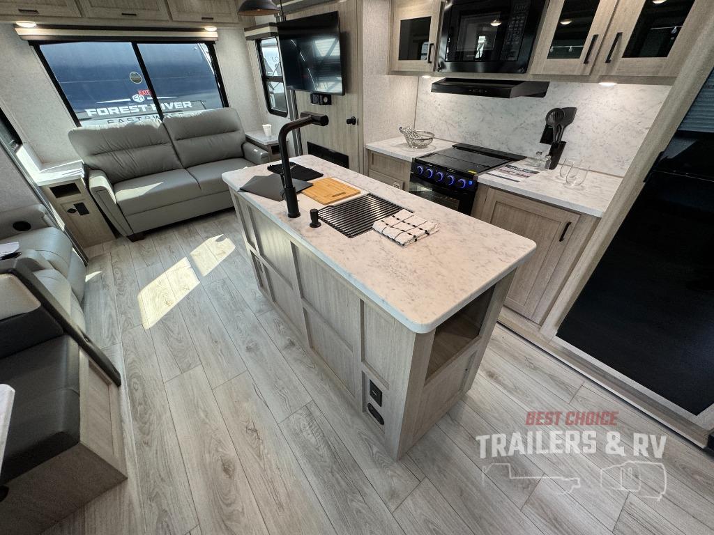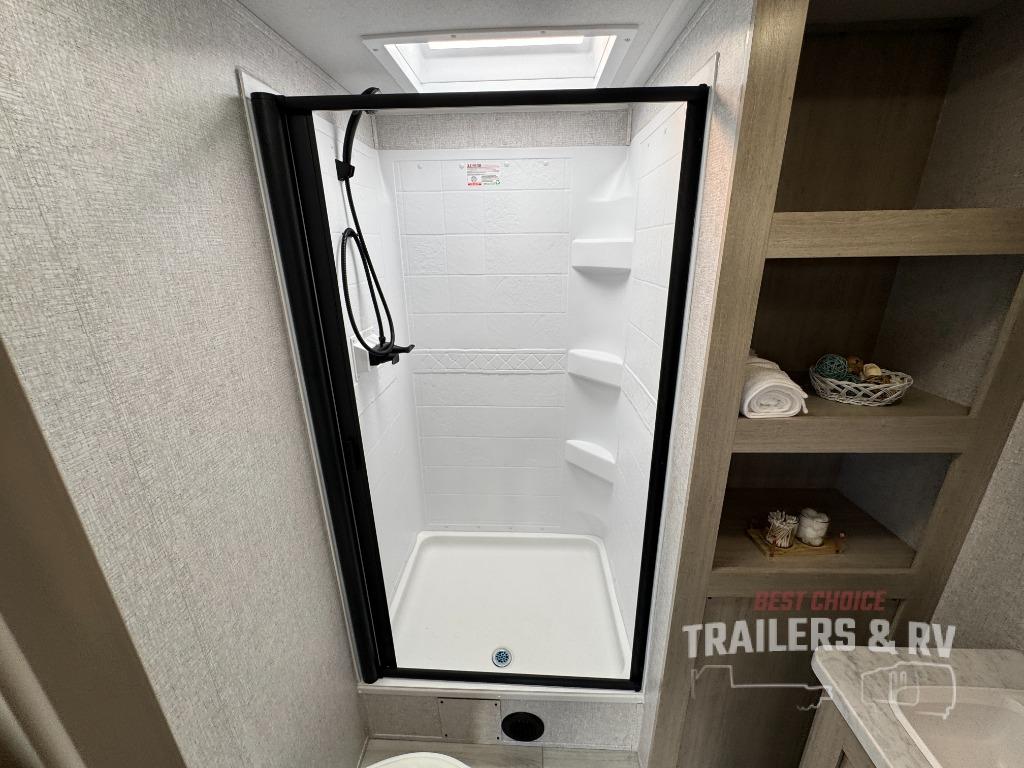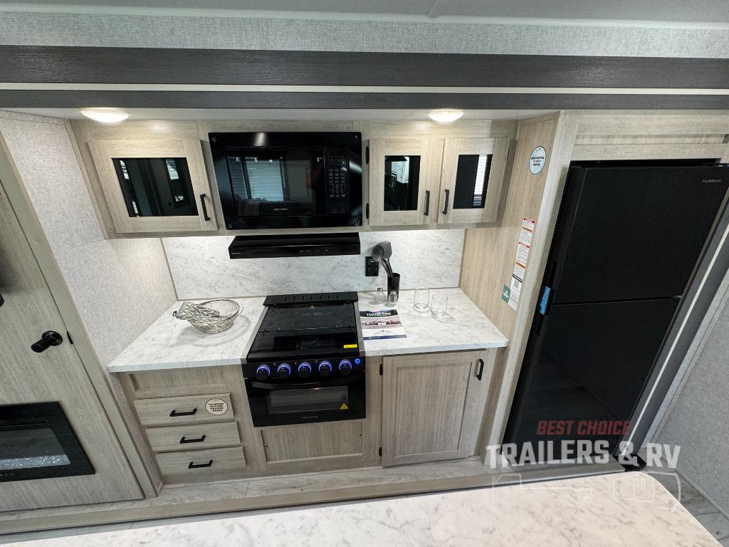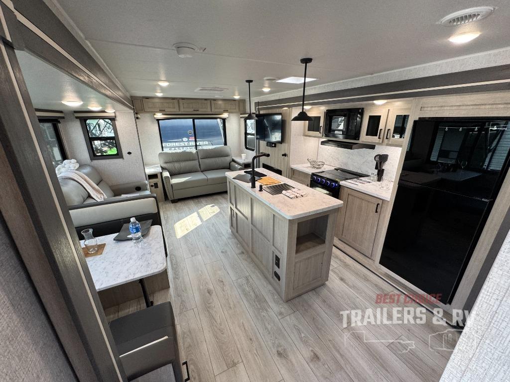 Camping in this double slide out travel trailer will be easier than ever! Once you arrive at your destination, set up the power awning, unload the pass-through storage, and head inside to make lunch in the full kitchen. There is a kitchen island for more prep space, along with a 10.7 cu. ft. 12V refrigerator, three burner range, and microwave oven. You'll find comfortable seating space on the booth dinette, jiffy sofa, and dual lounge chairs, and the fireplace is sure to make your space feel more like home. There is also hidden storage behind the fireplace for pantry items, board games, and more! Up front, a full bath and front private bedroom will let you freshen up before a great night's rest on the king bed!