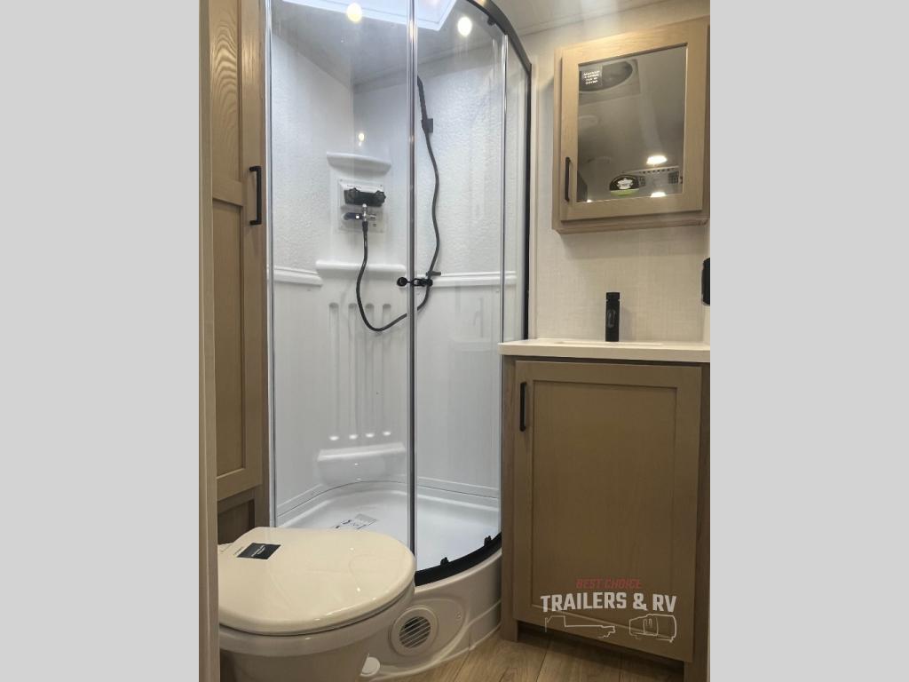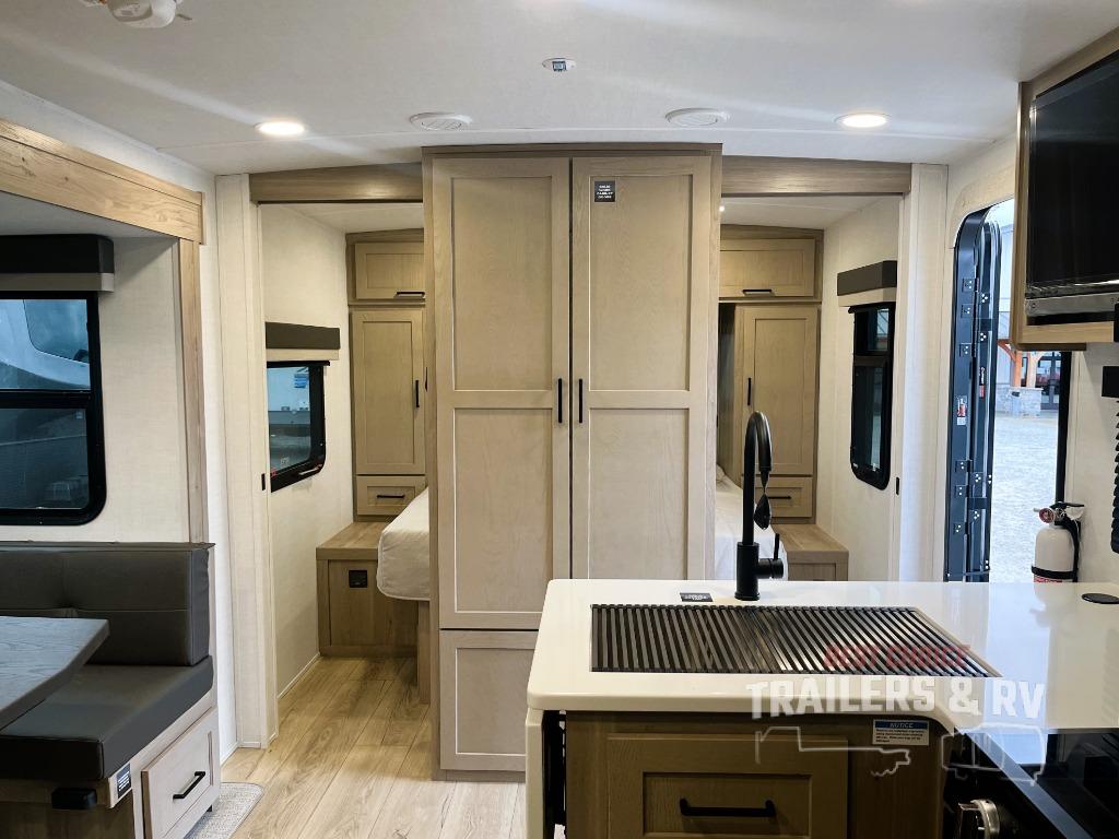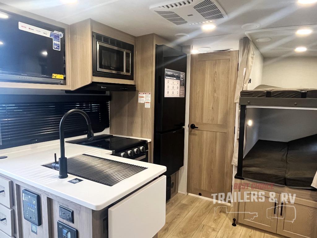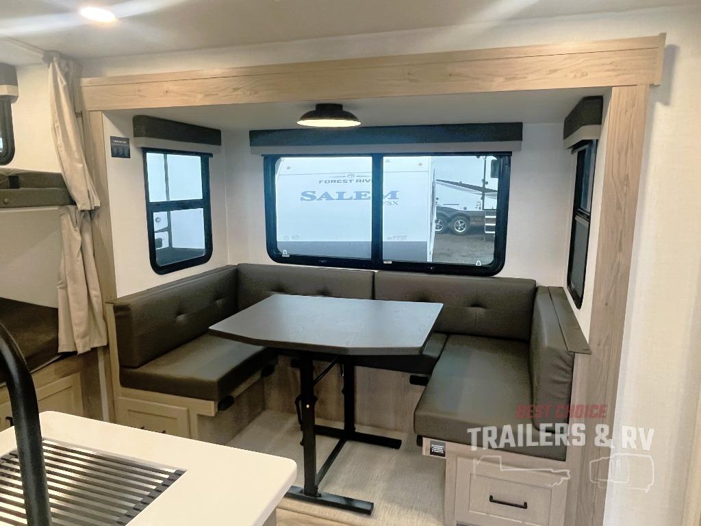 Camping in this single slide out travel trailer will make weekends at the campground comfy and hassle-free! Once you arrive, you can unload the pass-through storage, put out the 18' power awning, then relax in your camp chairs. And there is a full interior kitchen to make meals when you get hungry. Everyone can gather around the U-shaped dinette slide for meal times or game night, and there is a spacious pantry where you can store snacks! The bunk beds include a flip-up bottom bunk and an exterior bike door so you can easily pack camp gear away, and the full bath is right next to the bunks for easy nighttime use. Head up front to enjoy your own private bedroom with an RV queen bed, dual wardrobes, and flip-up storage!
