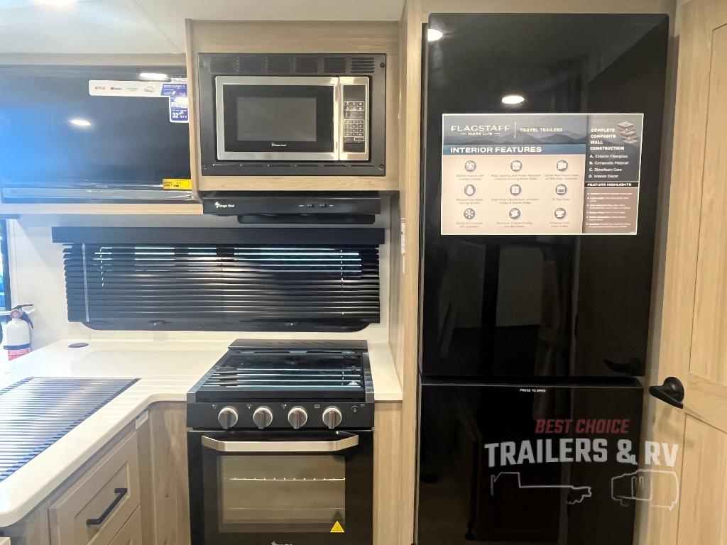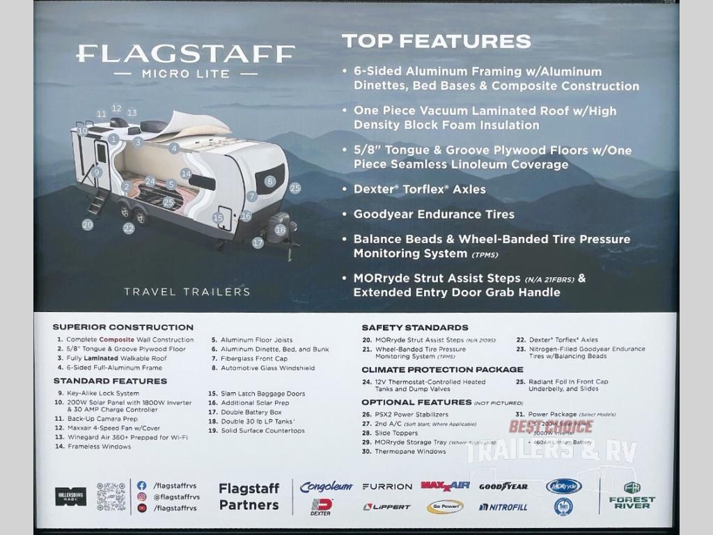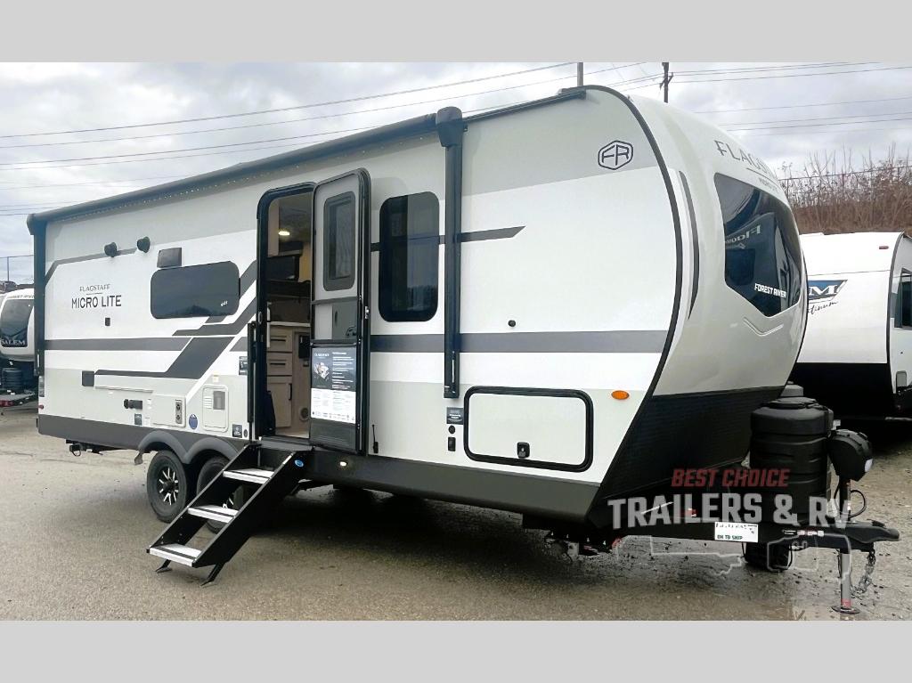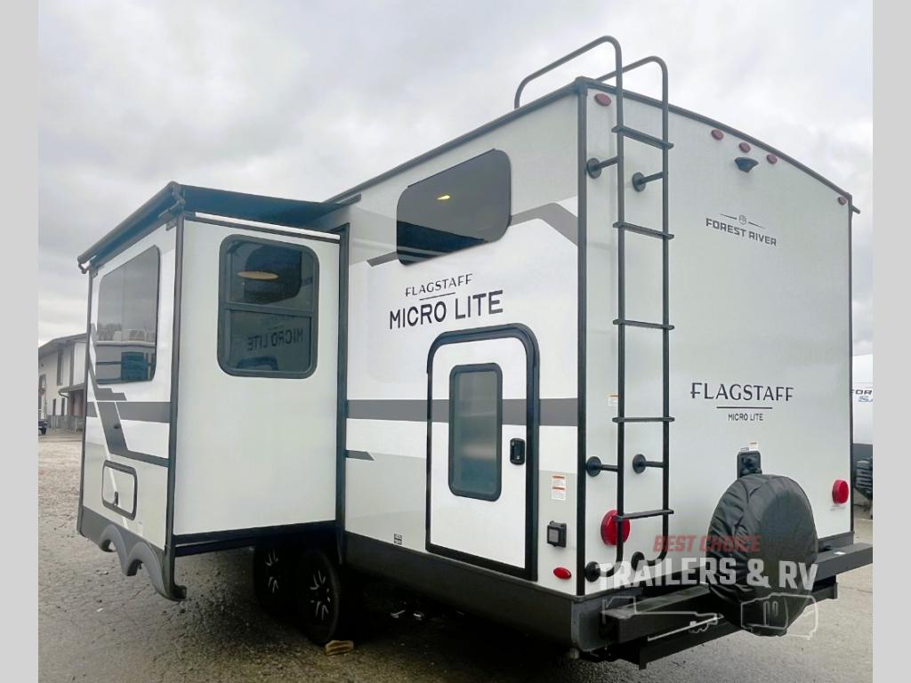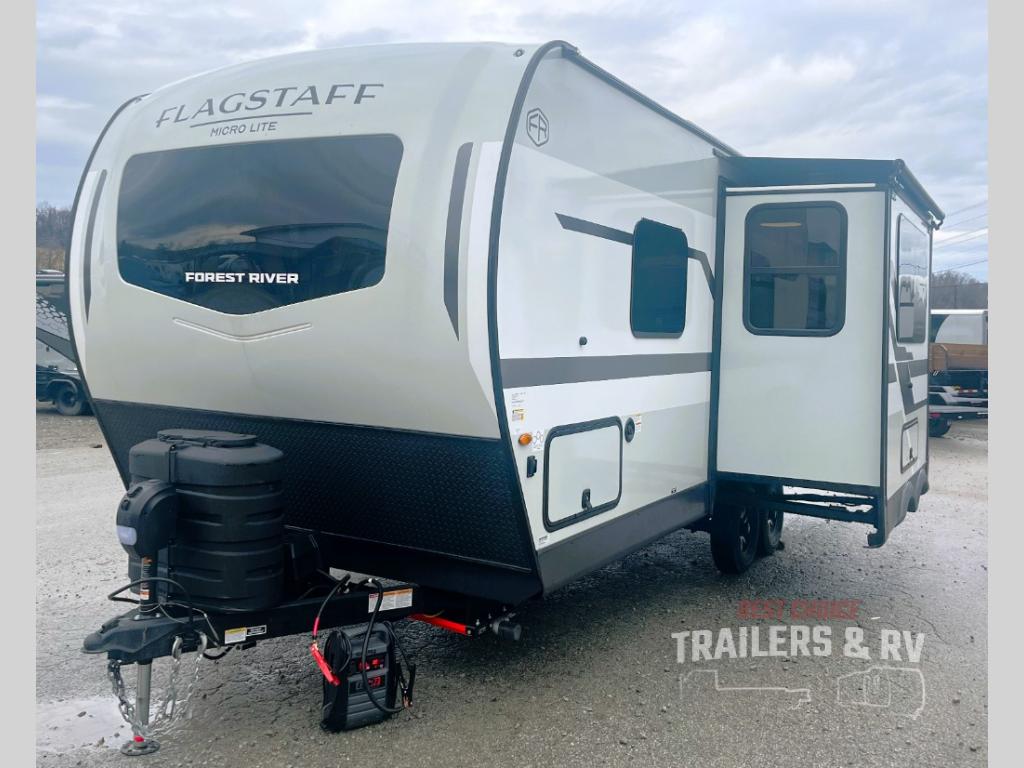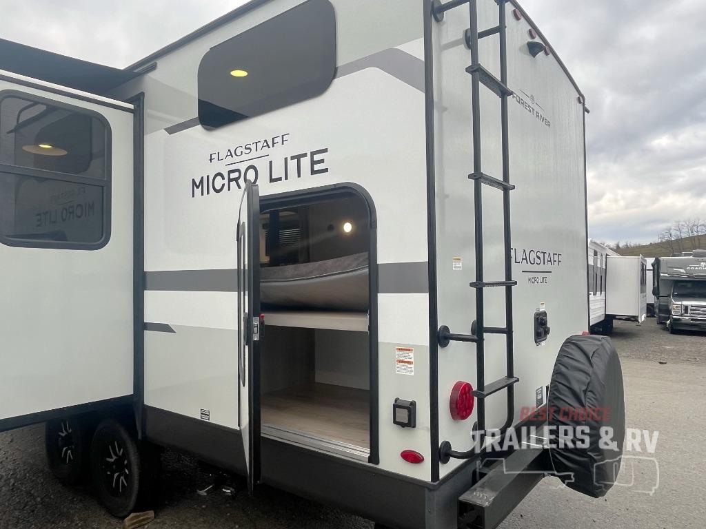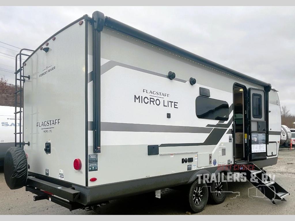 With any Flagstaff Micro Lite travel trailer by Forest River you will enjoy lightweight towing, durable construction, and added interior comforts to make each trip memorable! Each model features RoadTech tire pressure monitoring, Dexter Torflex axles, and nitrogen-filled Goodyear endurance tires for smooth towing from home to campground. The 6-sided aluminum framed construction provides a strong foundation so you can enjoy your RV for years to come, plus the radiant foil in the front cap, underbelly and slides help insulate your trailer. Additional exterior features include a 200W solar panel, back-up camera prep, frameless windows, and slam baggage doors. Each model includes the Great Expectations Package with roller shades, solid surface kitchen countertops, and hidden hinge cabinet doors. There is also an exterior hot/cold water port, outside speakers, a power tongue jack and stabilizer jacks, plus many more conveniences.