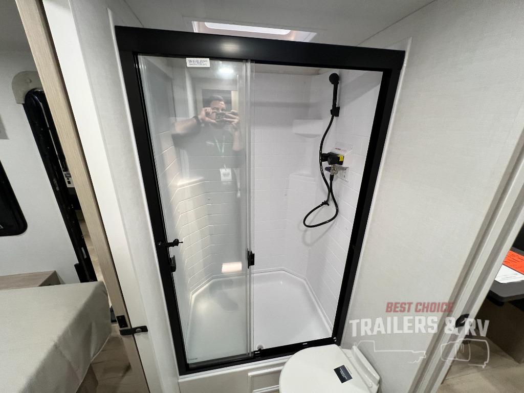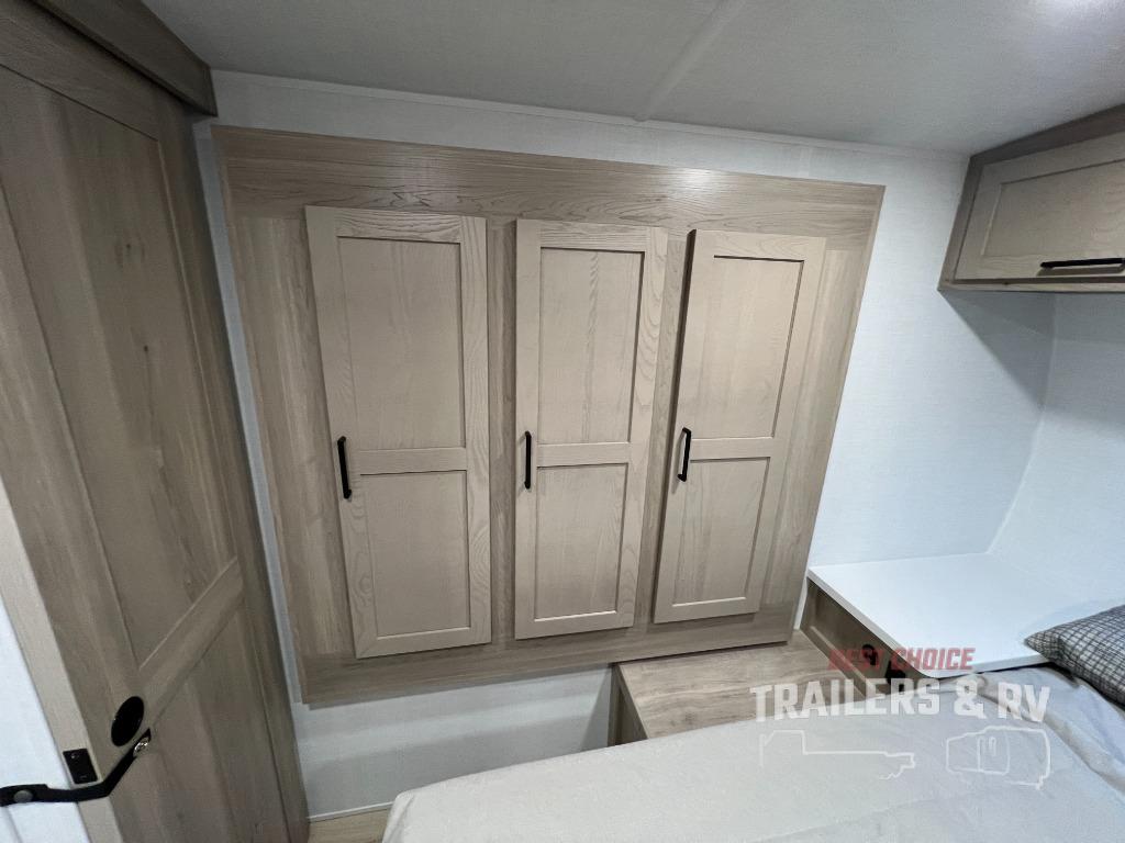 Trips to your favorite campground are made complete with this dual slide out, dual entry trailer! One entry goes straight into the front master bedroom where you'll find an RV queen bed with flip-up storage, a wardrobe slide out, and easy access into the walk-through bath. Once you're through the bath, you'll find the main living area, rear kitchen, and the second entry door at the back. Your crew can play a game at the 39" booth dinette or relax on the theater seat across from the TV. The kitchen includes everything you need to prepare meals in the morning, including a three burner cooktop and microwave oven, plus a 12V refrigerator and a pantry for food storage.