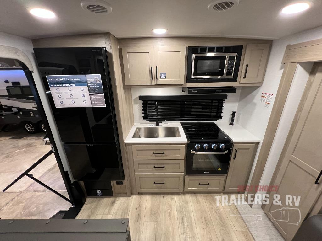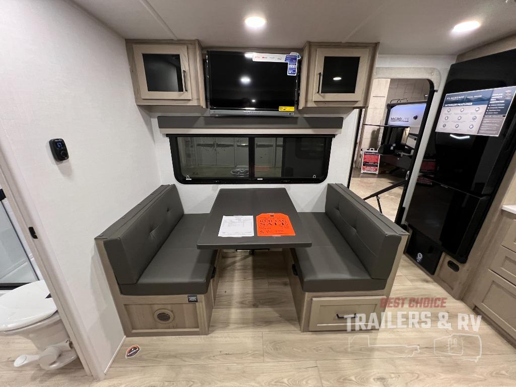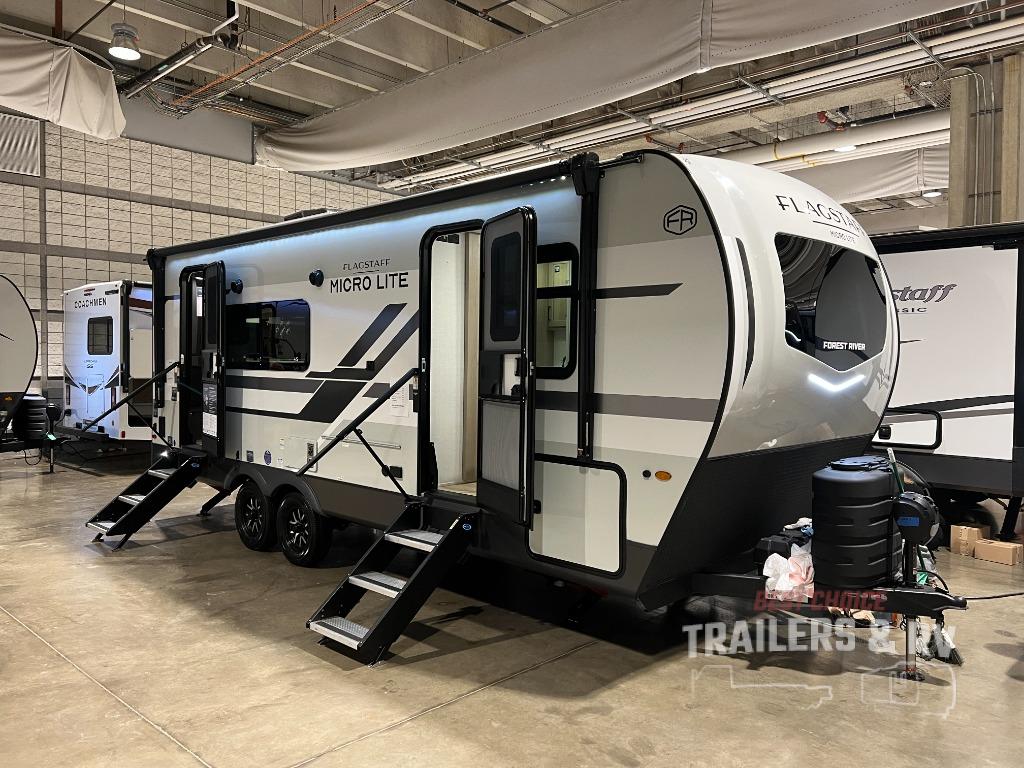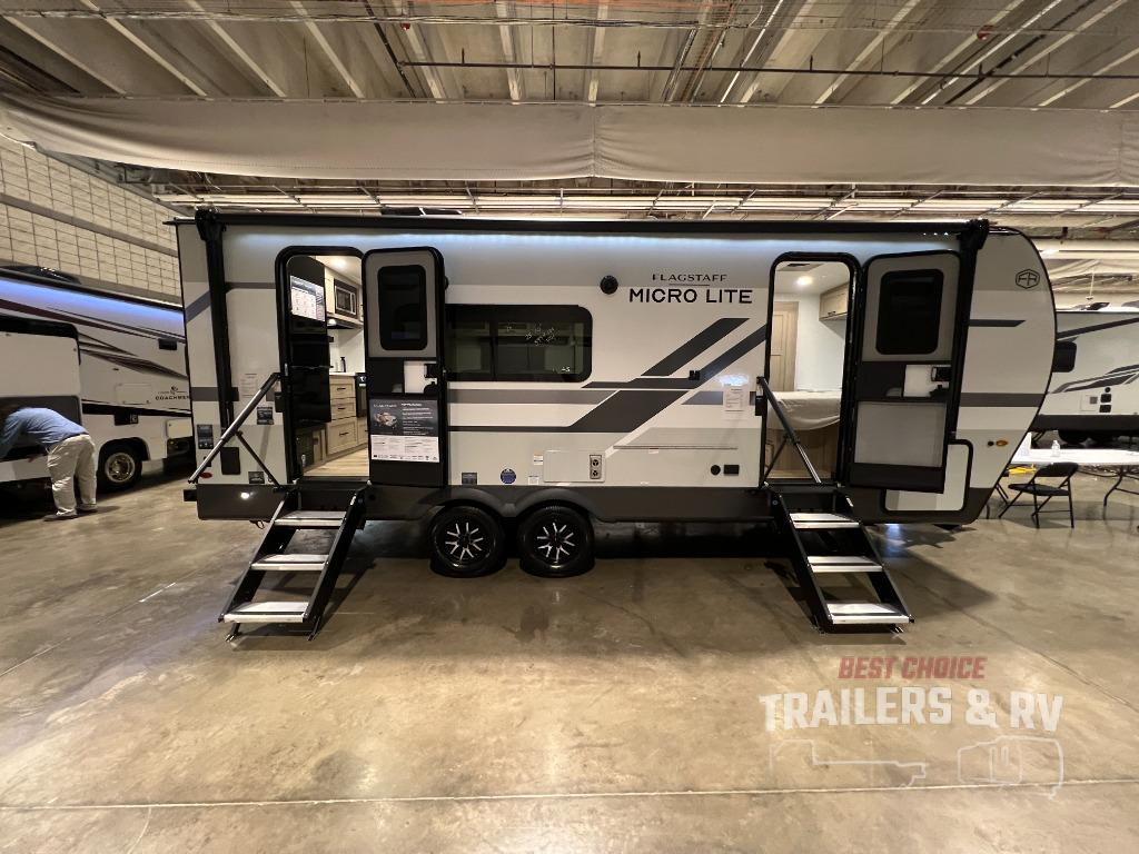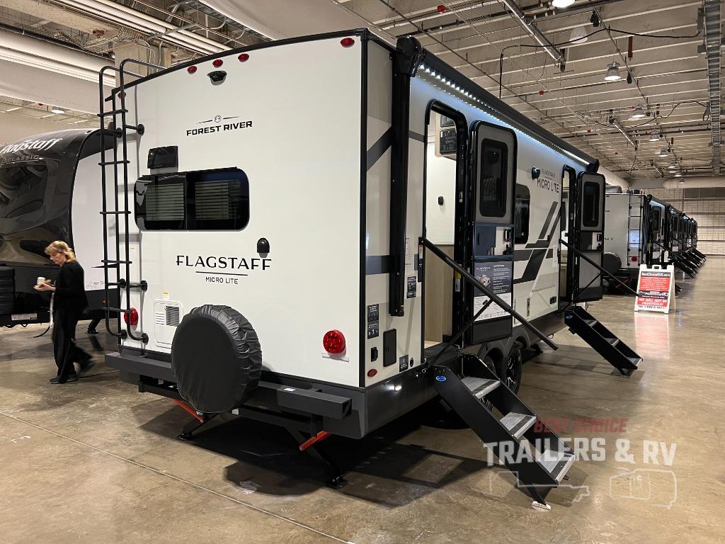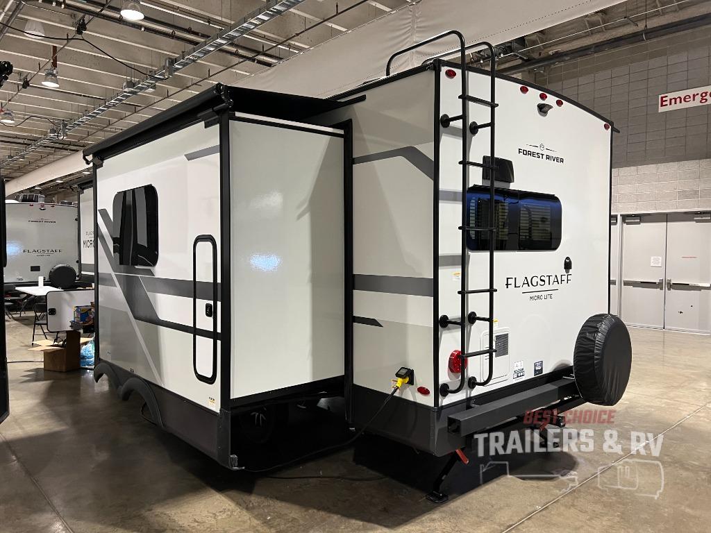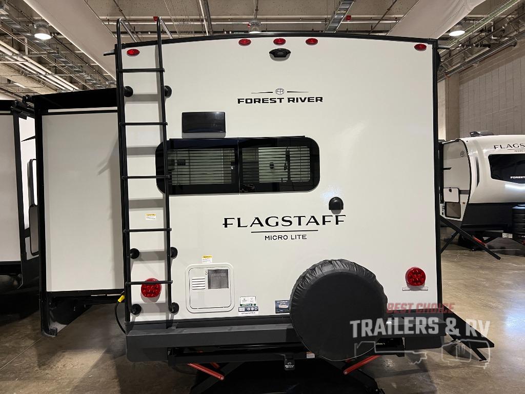 With any Flagstaff Micro Lite travel trailer by Forest River you will enjoy lightweight towing, durable construction, and added interior comforts to make each trip memorable! Each model features RoadTech tire pressure monitoring, Dexter Torflex axles, and nitrogen-filled Goodyear endurance tires for smooth towing from home to campground. The 6-sided aluminum framed construction provides a strong foundation so you can enjoy your RV for years to come, plus the radiant foil in the front cap, underbelly and slides help insulate your trailer. Additional exterior features include a 200W solar panel, back-up camera prep, frameless windows, and slam baggage doors. Each model includes the Great Expectations Package with roller shades, solid surface kitchen countertops, and hidden hinge cabinet doors. There is also an exterior hot/cold water port, outside speakers, a power tongue jack and stabilizer jacks, plus many more conveniences.