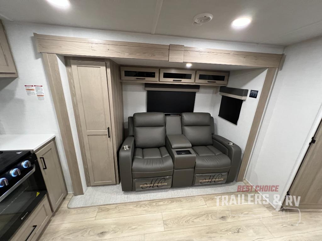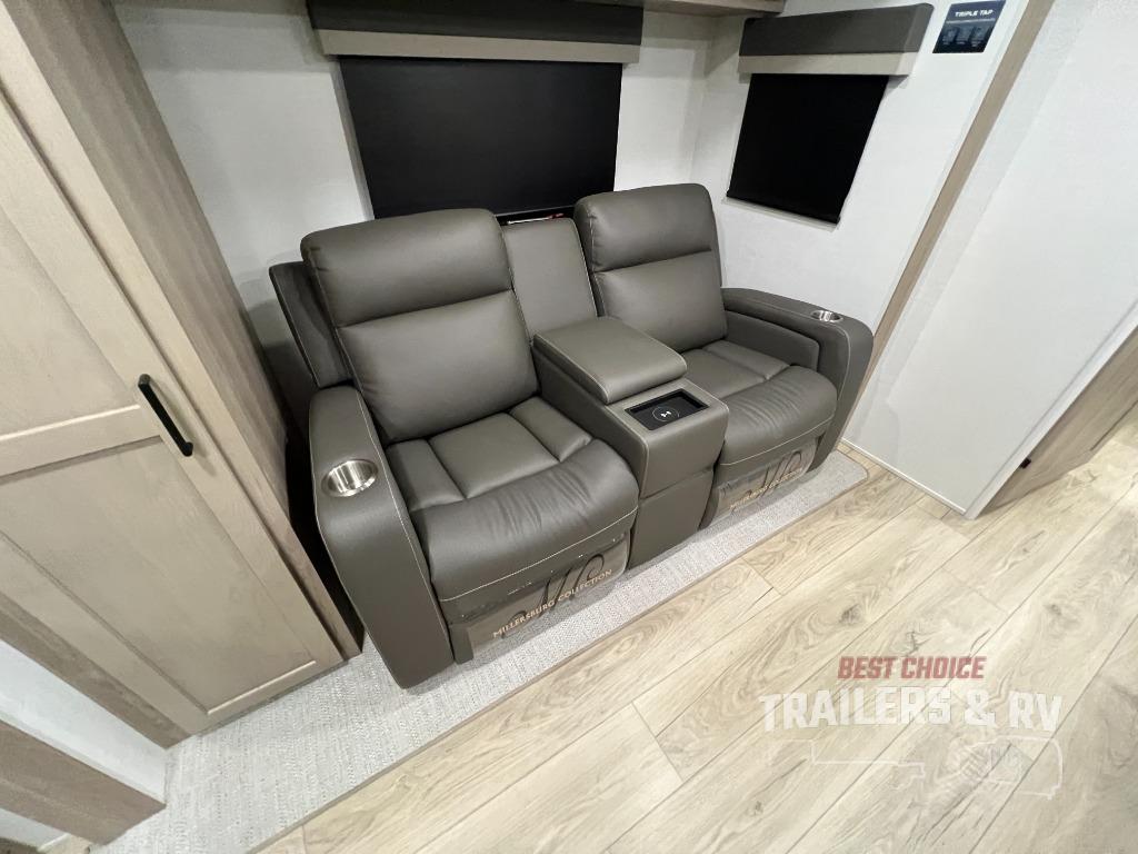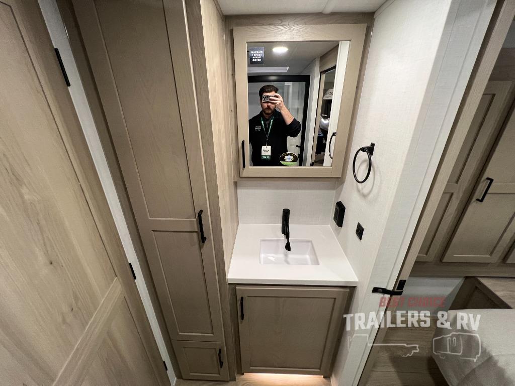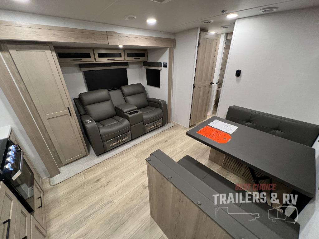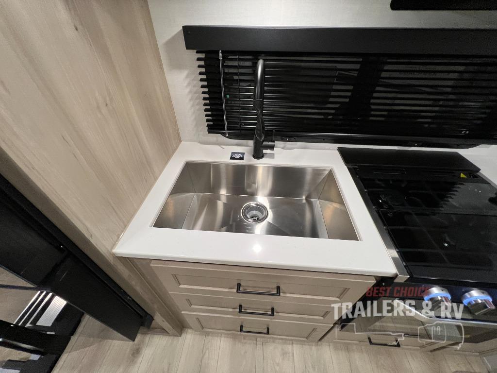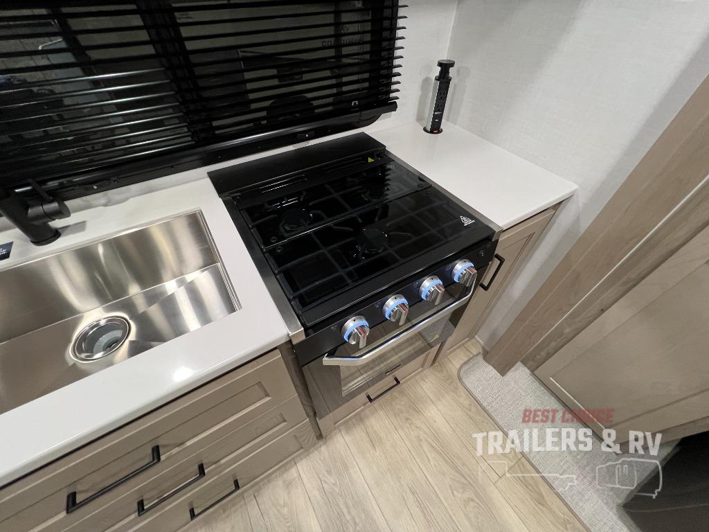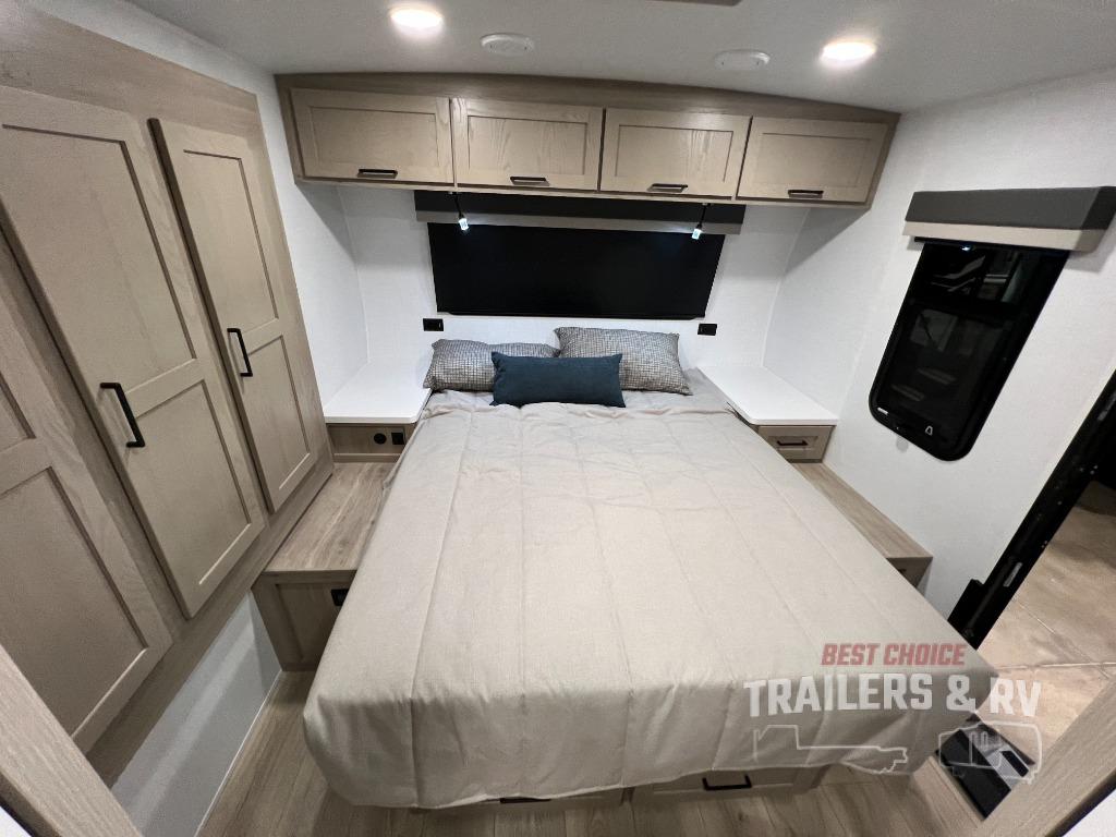 Trips to your favorite campground are made complete with this dual slide out, dual entry trailer! One entry goes straight into the front master bedroom where you'll find an RV queen bed with flip-up storage, a wardrobe slide out, and easy access into the walk-through bath. Once you're through the bath, you'll find the main living area, rear kitchen, and the second entry door at the back. Your crew can play a game at the 39" booth dinette or relax on the theater seat across from the TV. The kitchen includes everything you need to prepare meals in the morning, including a three burner cooktop and microwave oven, plus a 12V refrigerator and a pantry for food storage.