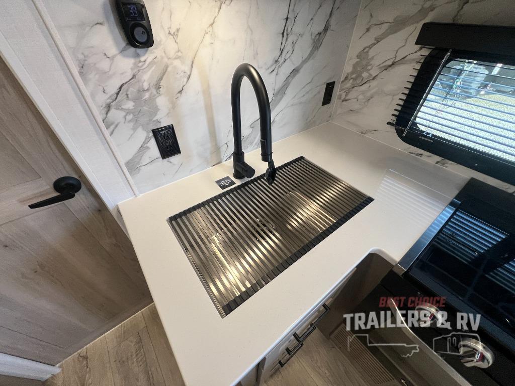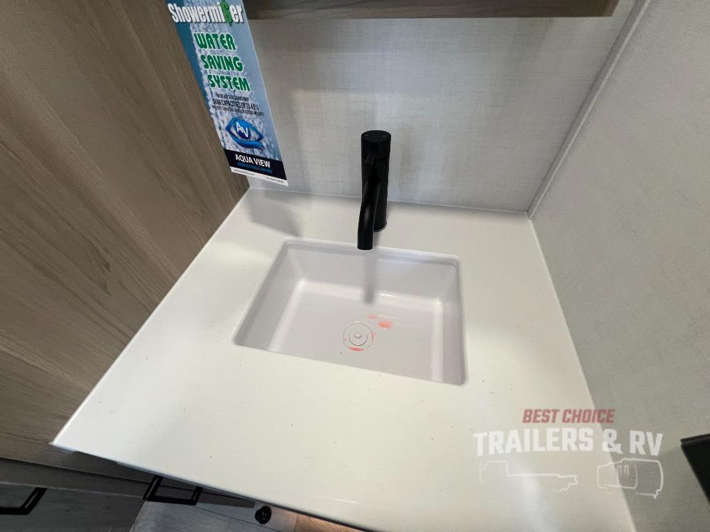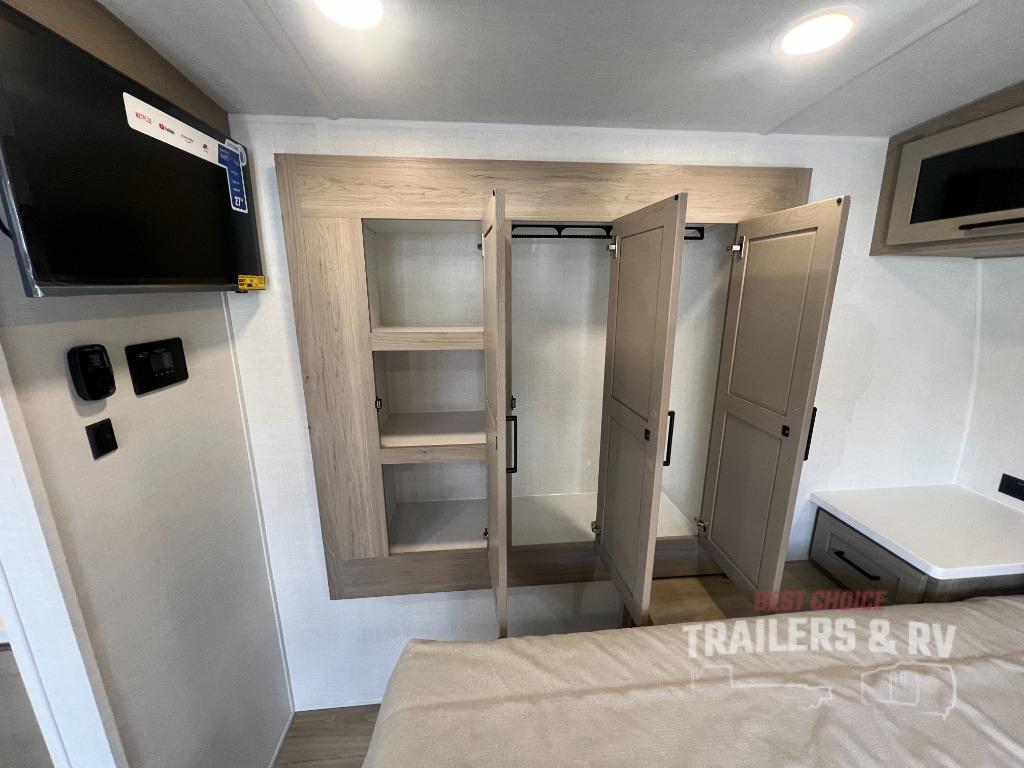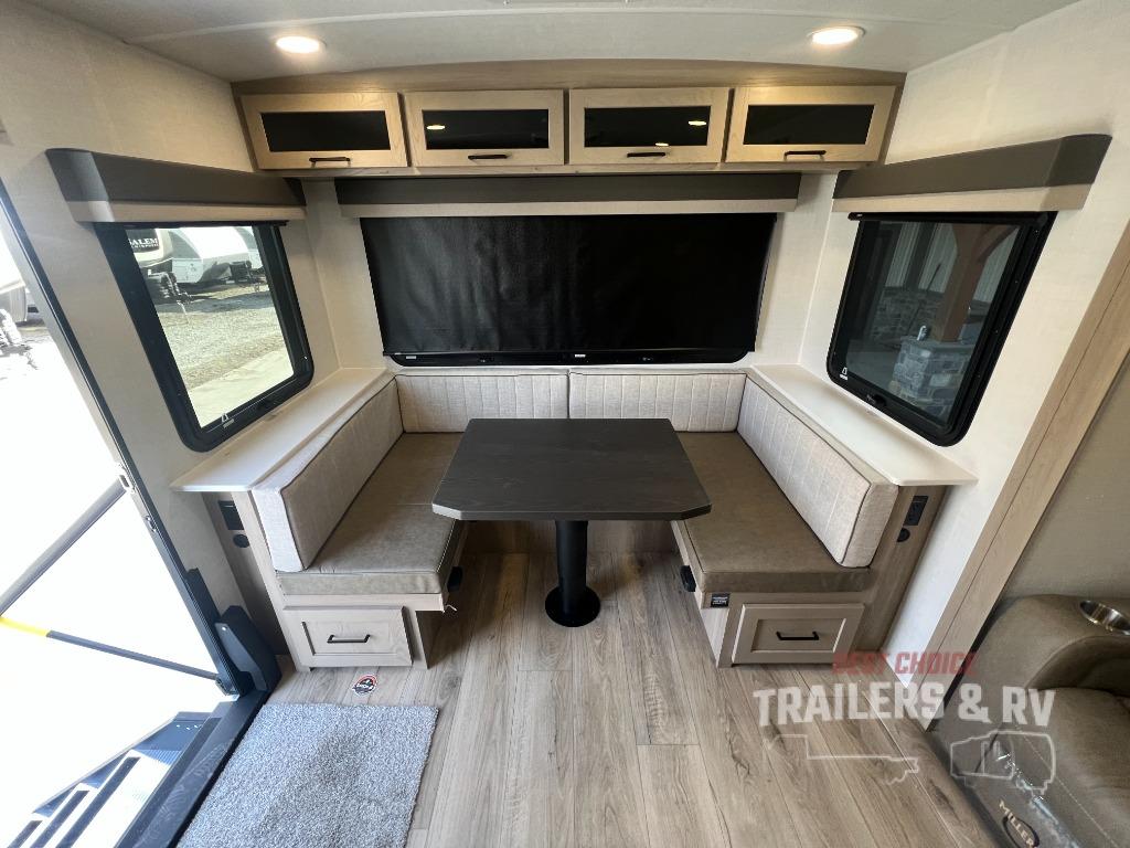 It will be so easy to enjoy time at the campground in this cozy travel trailer. The full kitchen includes a three burner gas oven, a microwave oven, and a 12V refrigerator to cook and store food, and the pantry will let you stock up on snacks. Your crew can get comfortable on the theater seat or around the rear U-shaped dinette, and there is a smart TV here to make it a movie night. The walk-thru bath will let you freshen up each day, and the queen bed in the front bedroom is sure to bring comfort. You will also find one of the dual entry doors here for convenience plus a wardrobe slide out for more storage and floor space. The exterior is just as accommodating with its pass-thru storage, 2" receiver hitch, and 21' power awning!