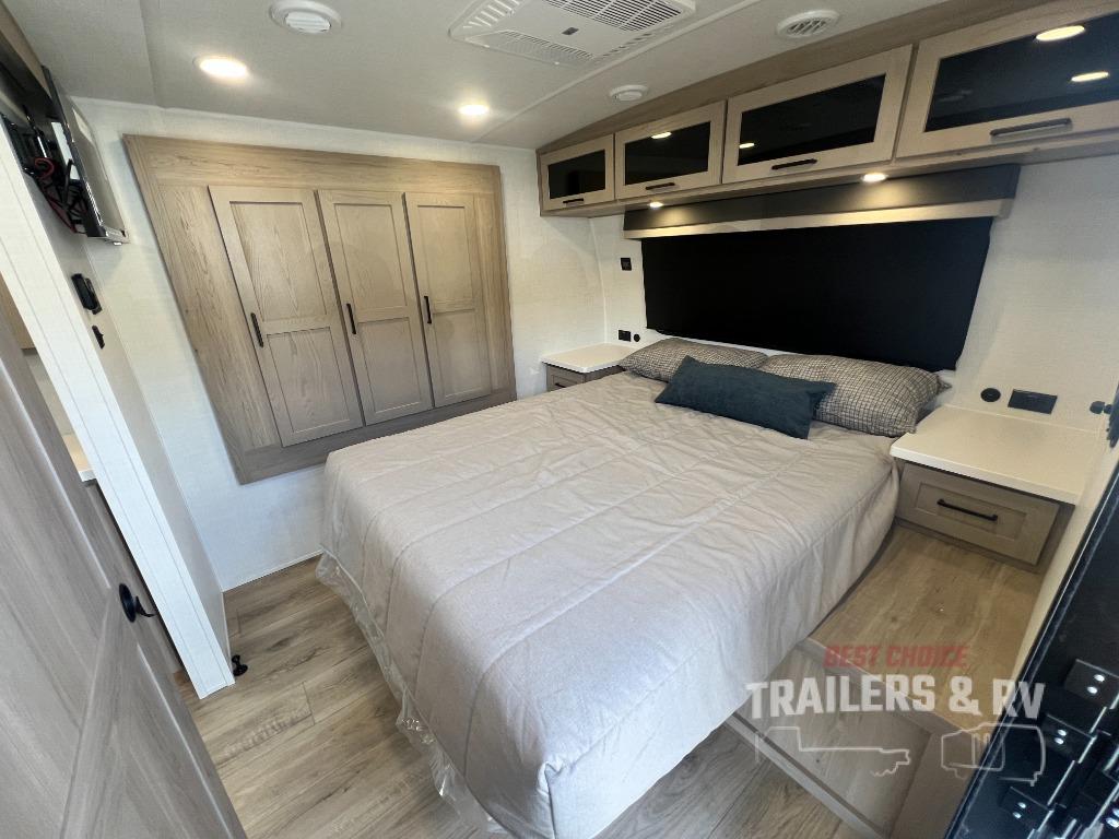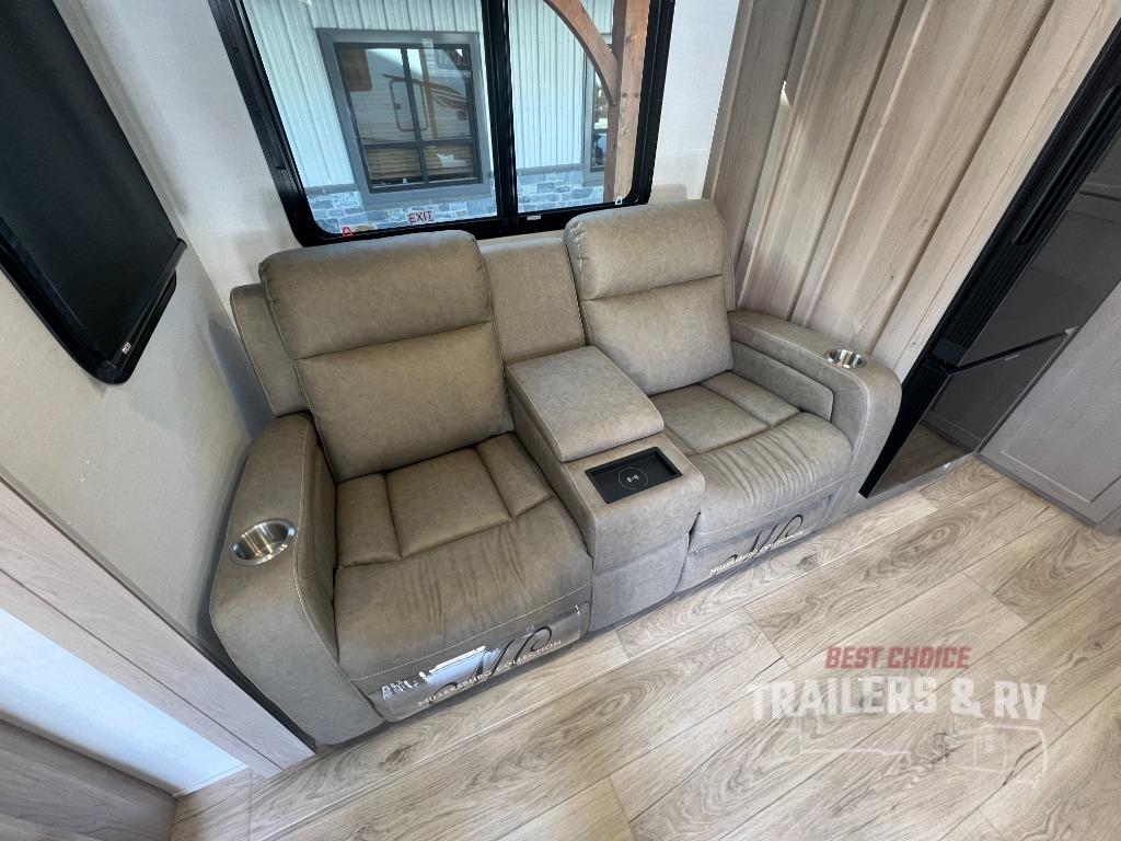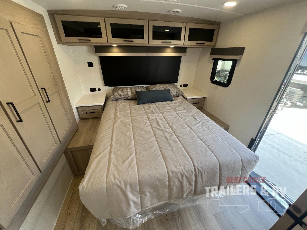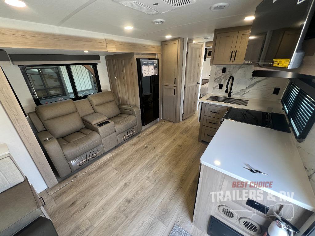 It will be so easy to enjoy time at the campground in this cozy travel trailer. The full kitchen includes a three burner gas oven, a microwave oven, and a 12V refrigerator to cook and store food, and the pantry will let you stock up on snacks. Your crew can get comfortable on the theater seat or around the rear U-shaped dinette, and there is a smart TV here to make it a movie night. The walk-thru bath will let you freshen up each day, and the queen bed in the front bedroom is sure to bring comfort. You will also find one of the dual entry doors here for convenience plus a wardrobe slide out for more storage and floor space. The exterior is just as accommodating with its pass-thru storage, 2" receiver hitch, and 21' power awning!