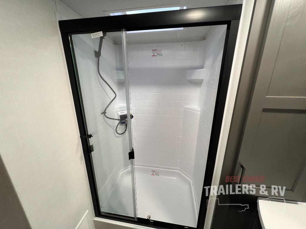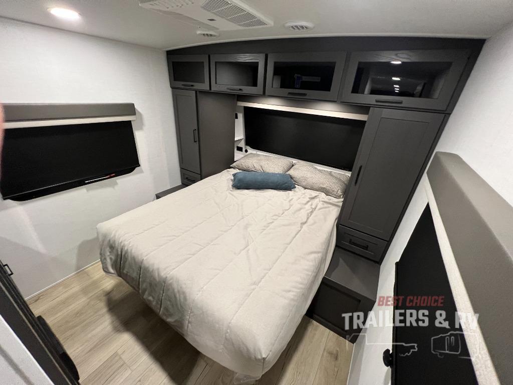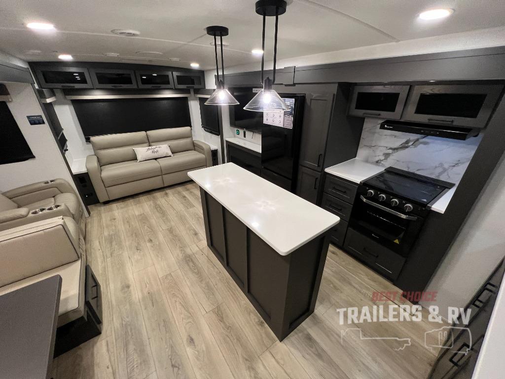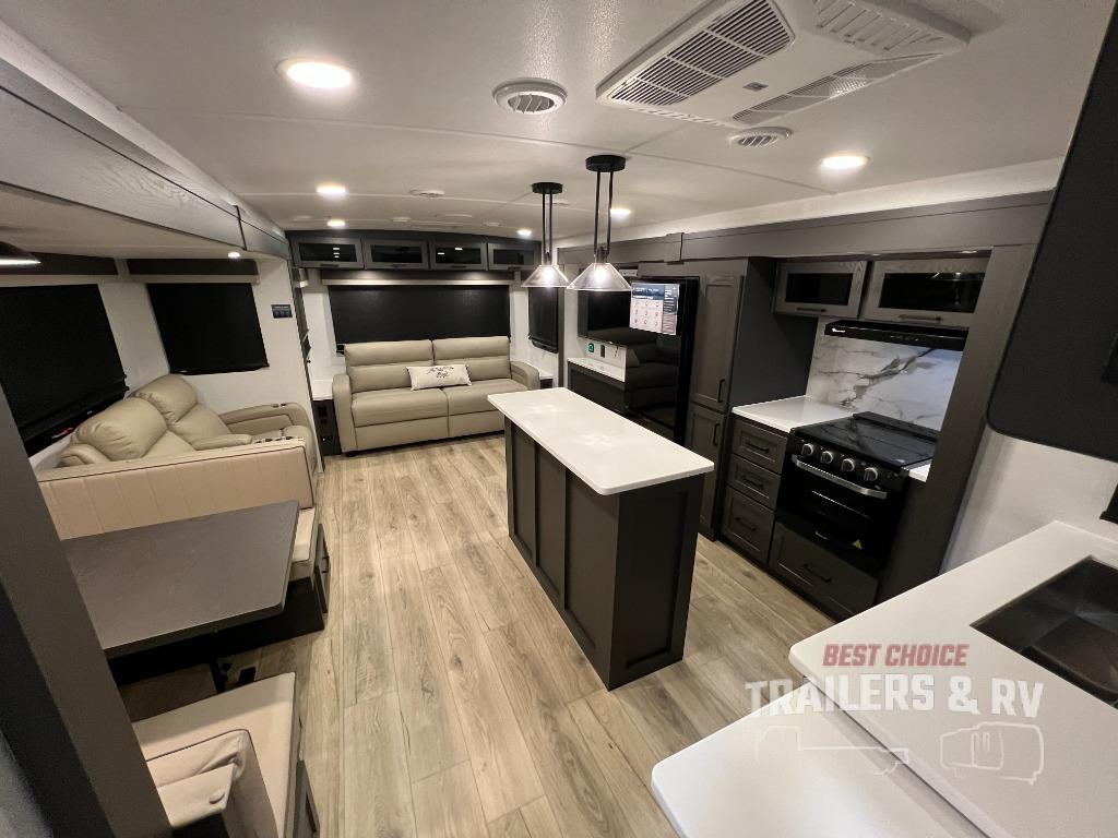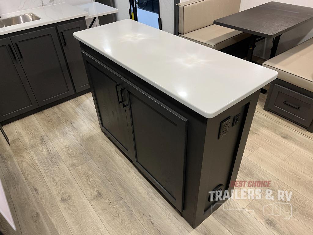 You'll feel right at home when staying in this spacious travel trailer. There are dual opposing slides in the combined kitchen and living area, and the large kitchen island will give the chef of your group more counter space to prep meals. Your crew can dine at the booth dinette, relax on the theater seat, and sleep on the hide-a-bed sofa. You'll find your own space in the front private bedroom that includes a queen bed, triple wardrobes, and a TV option. Head outdoors to find two power awnings, a rear 2" receiver hitch, and a pass-thru storage with an optional steel sliding tray.