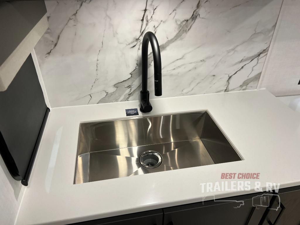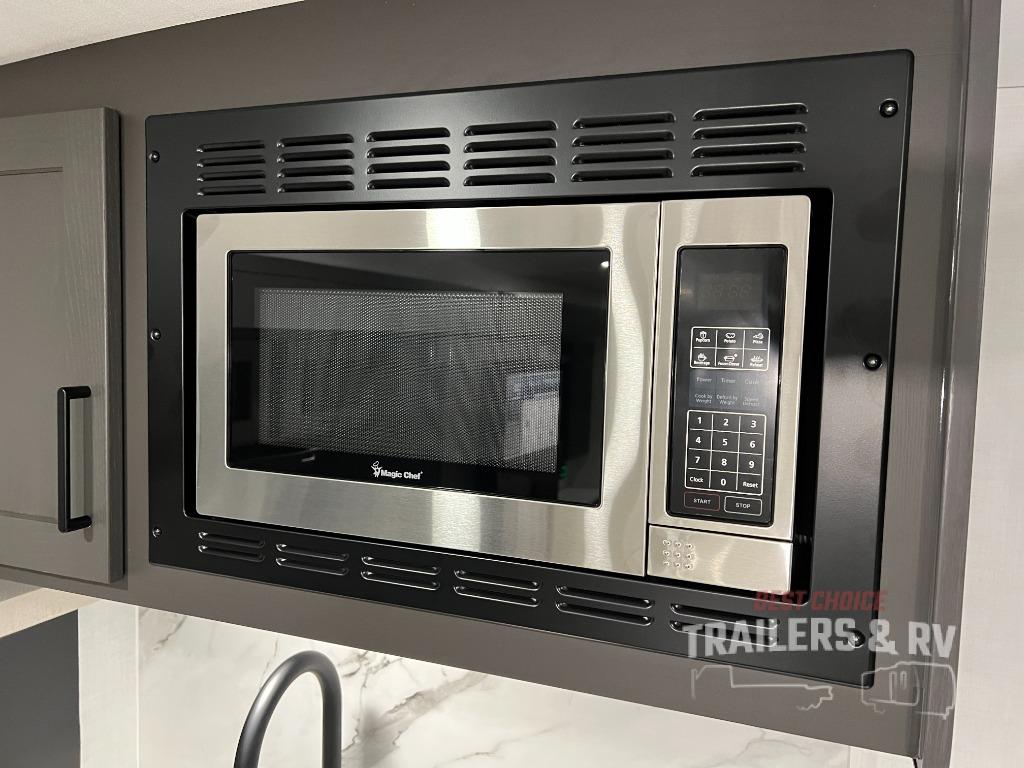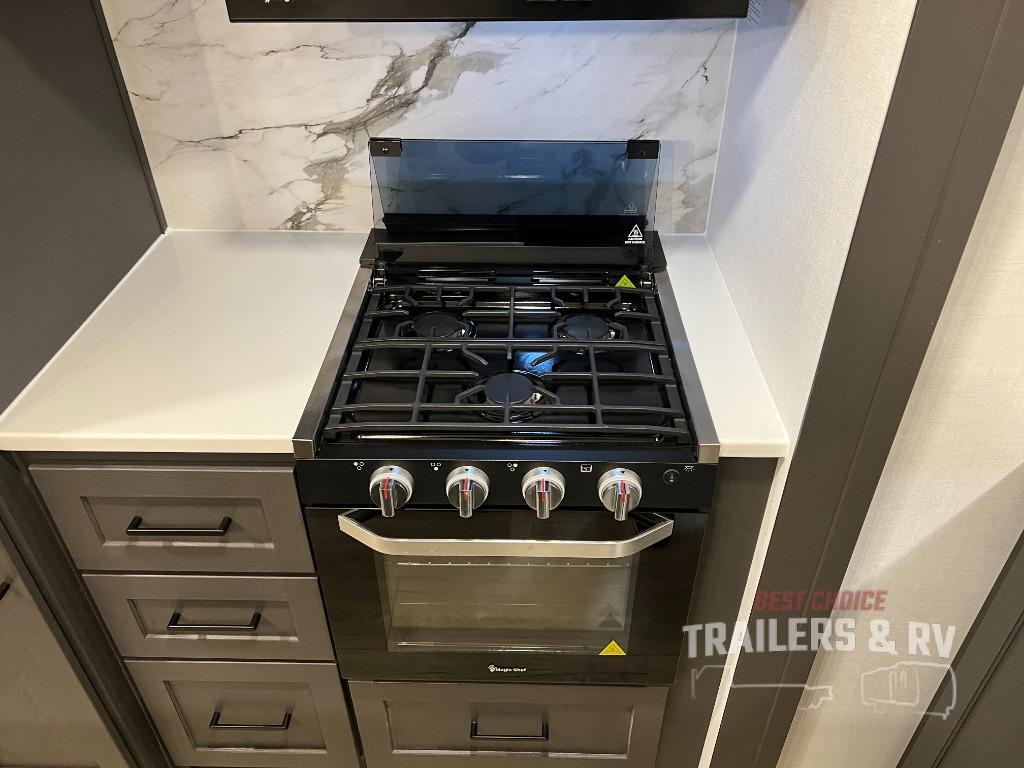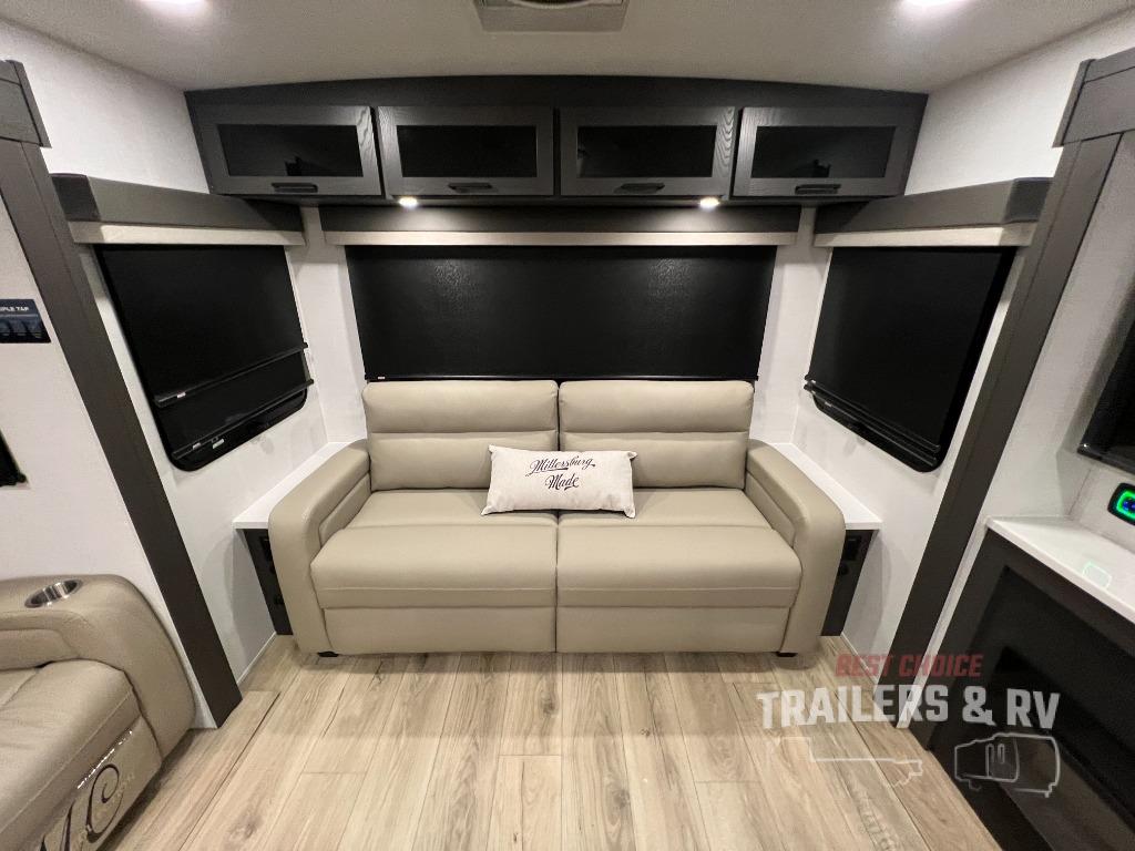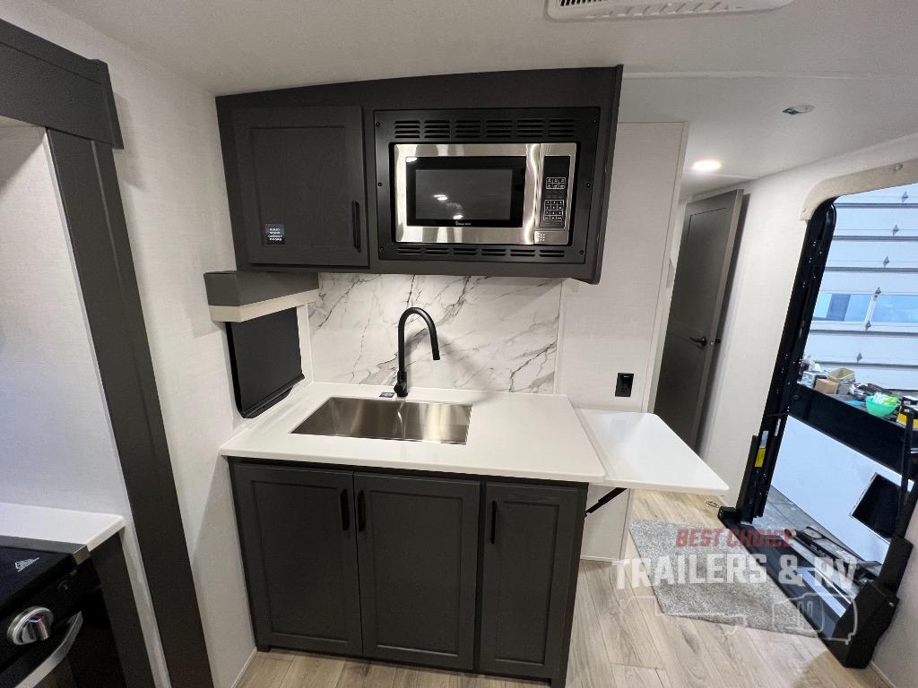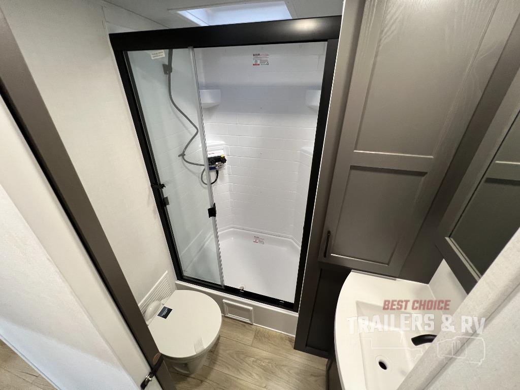 You'll feel right at home when staying in this spacious travel trailer. There are dual opposing slides in the combined kitchen and living area, and the large kitchen island will give the chef of your group more counter space to prep meals. Your crew can dine at the booth dinette, relax on the theater seat, and sleep on the hide-a-bed sofa. You'll find your own space in the front private bedroom that includes a queen bed, triple wardrobes, and a TV option. Head outdoors to find two power awnings, a rear 2" receiver hitch, and a pass-thru storage with an optional steel sliding tray.