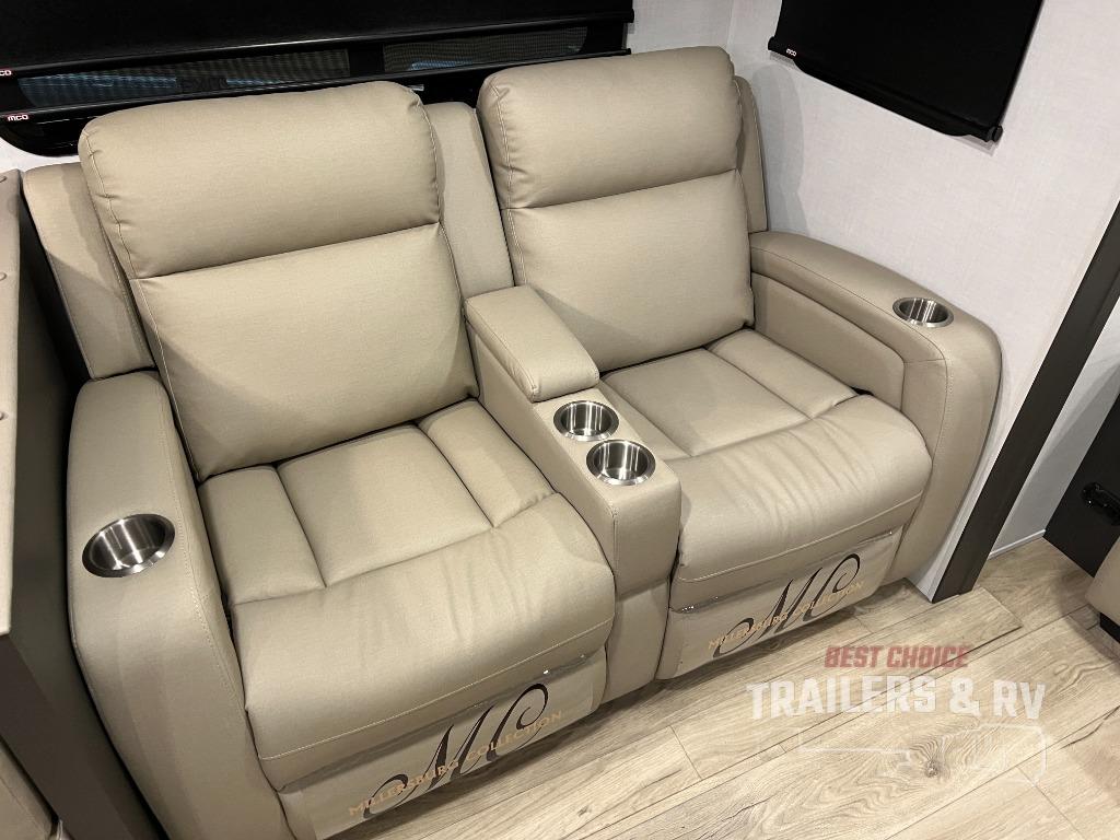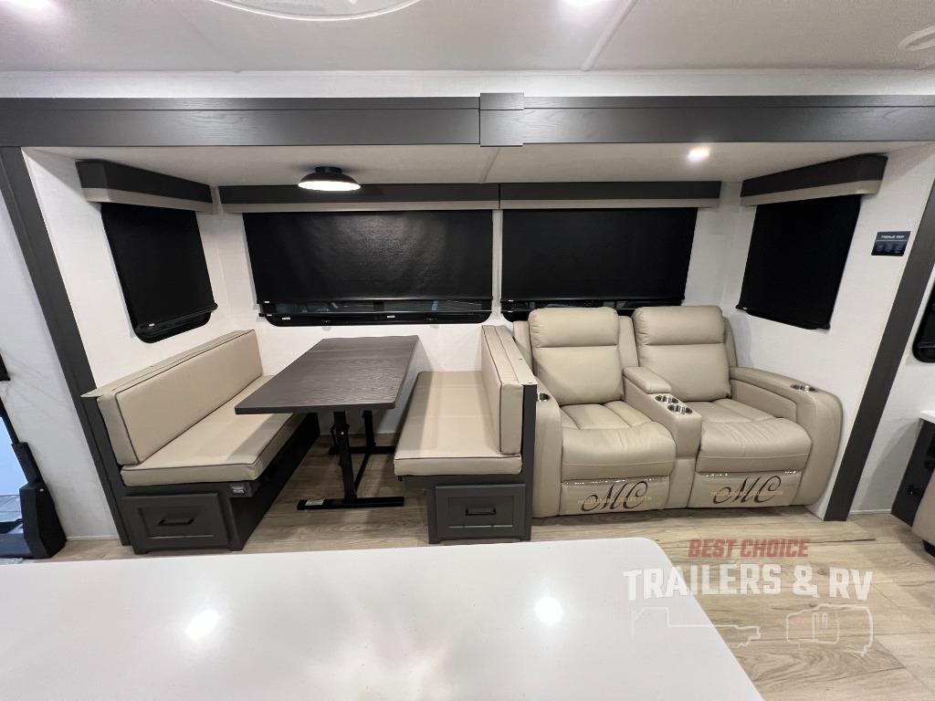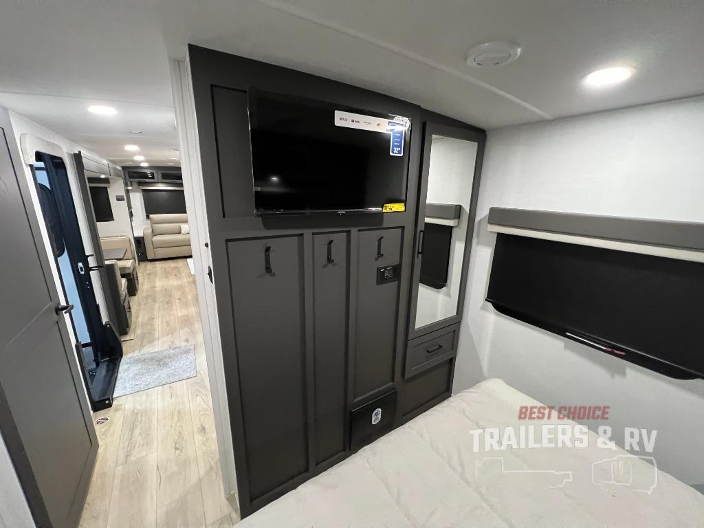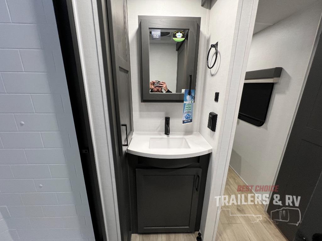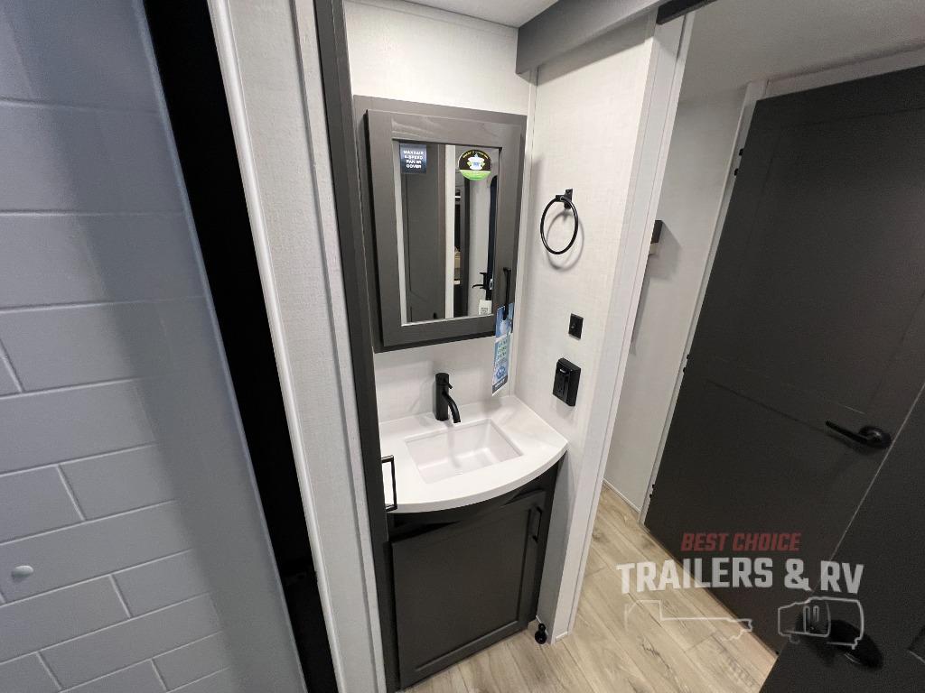 You'll feel right at home when staying in this spacious travel trailer. There are dual opposing slides in the combined kitchen and living area, and the large kitchen island will give the chef of your group more counter space to prep meals. Your crew can dine at the booth dinette, relax on the theater seat, and sleep on the hide-a-bed sofa. You'll find your own space in the front private bedroom that includes a queen bed, triple wardrobes, and a TV option. Head outdoors to find two power awnings, a rear 2" receiver hitch, and a pass-thru storage with an optional steel sliding tray.