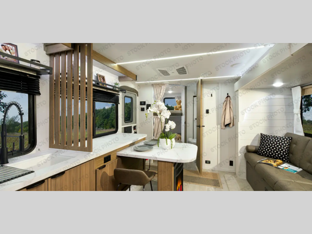 You can enjoy at-home comforts wherever you decide to camp in this travel trailer. The custom king bed with Versa Tilt includes dual shelves and a wardrobe so you can keep your space tidy. If you have a guest or two little ones, they can sleep on the jackknife sofa within the large slide out or on the double-size bunks right next to the full bath. Once you've made breakfast in the fully equipped kitchen, you can utilize the pull-out table to dine at. There is also a fireplace below the table, which will be perfect for cozy evenings indoors.