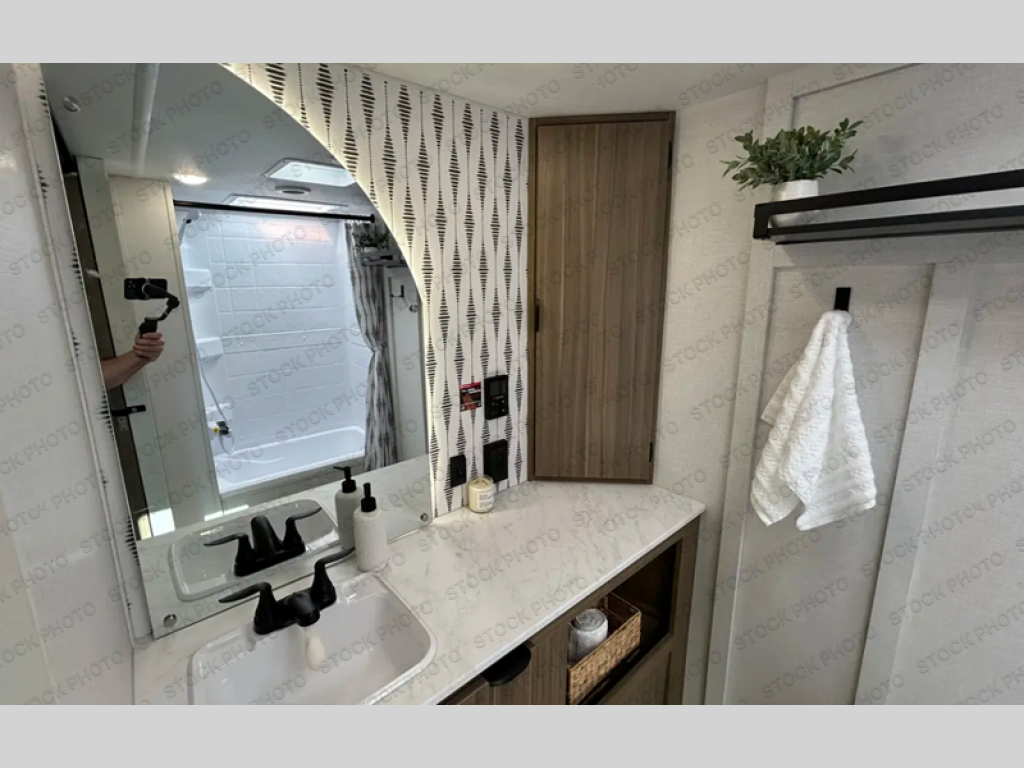 You're sure to make camping memories in this spacious travel trailer! You can sleep four to five people each night thanks to the the custom king bed with Versa Tilt in the front bedroom plus the Versa-Lounge and booth dinette within the large slide out! The full kitchen will let you make meals each day, and you'll appreciate the hidden pantry with shelves behind the fireplace. And don't overlook the full rear bath, complete with a tub/shower and ample counter space for your things.