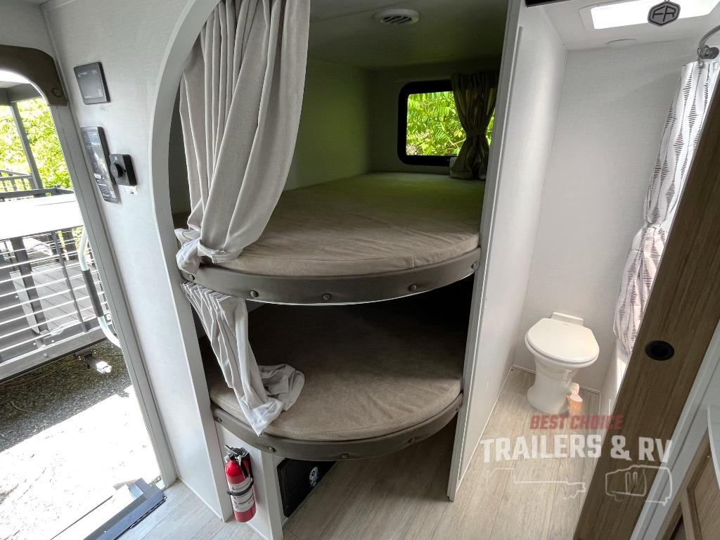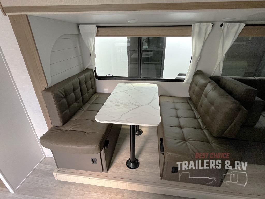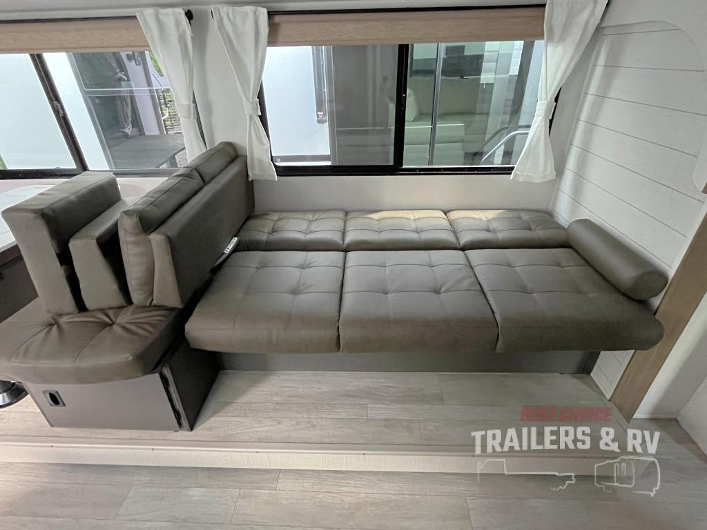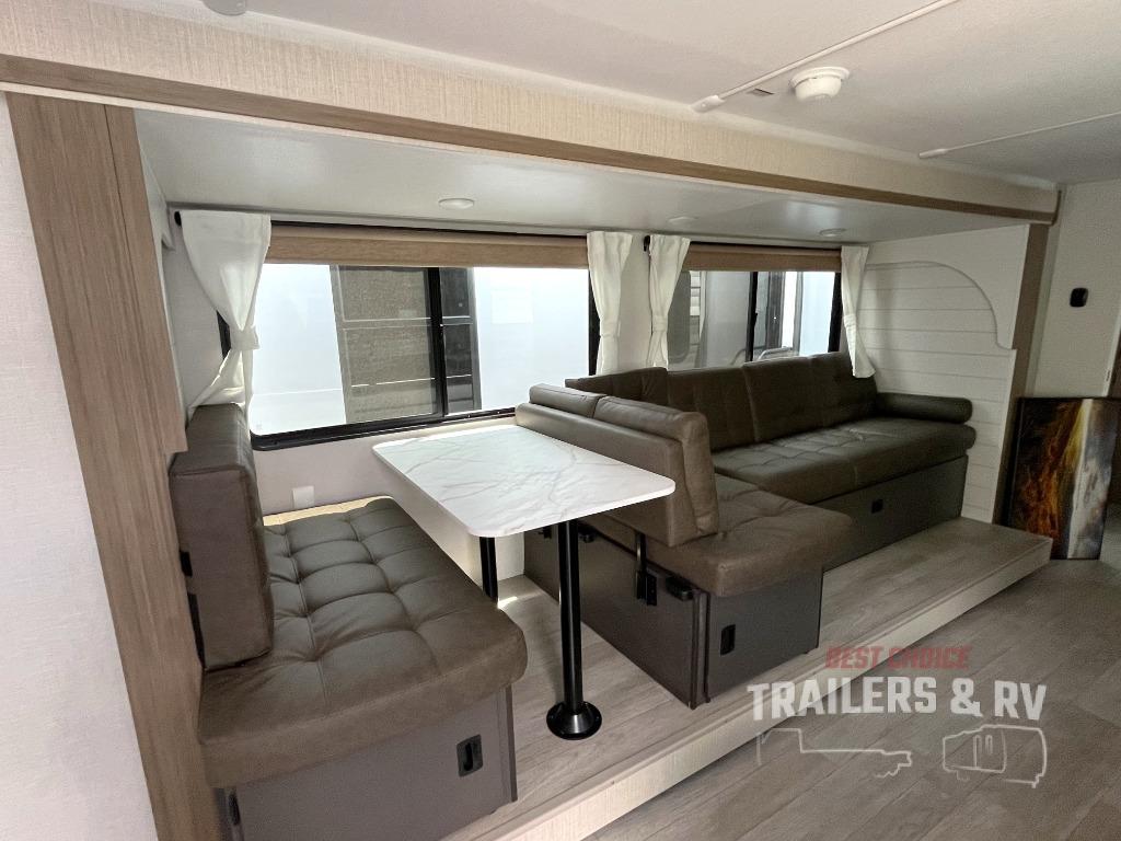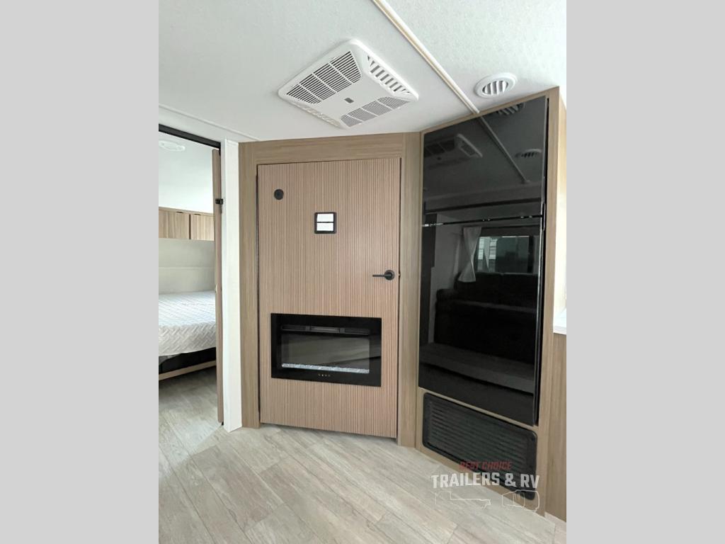 You're sure to make camping memories in this spacious travel trailer! You can easily sleep eight people each night thanks to the double-size bunks, the custom king bed with Versa Tilt in the front bedroom plus the Versa-Lounge within the large slide out! The cooktop and microwave oven will let you make meals each day, and you'll appreciate the hidden pantry with shelves behind the fireplace. There is also a booth dinette where you can dine together or play a game of cards after dinner is cleaned up, or you may just find yourselves outdoors under the 18' awning with 4K blade lighting. And don't overlook the full bath, complete with a tub/shower that will make bath time easier if you have little ones.
