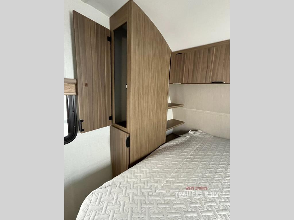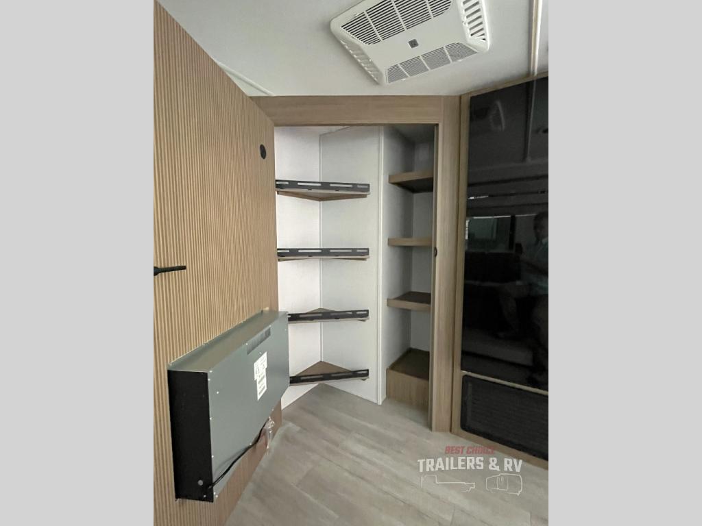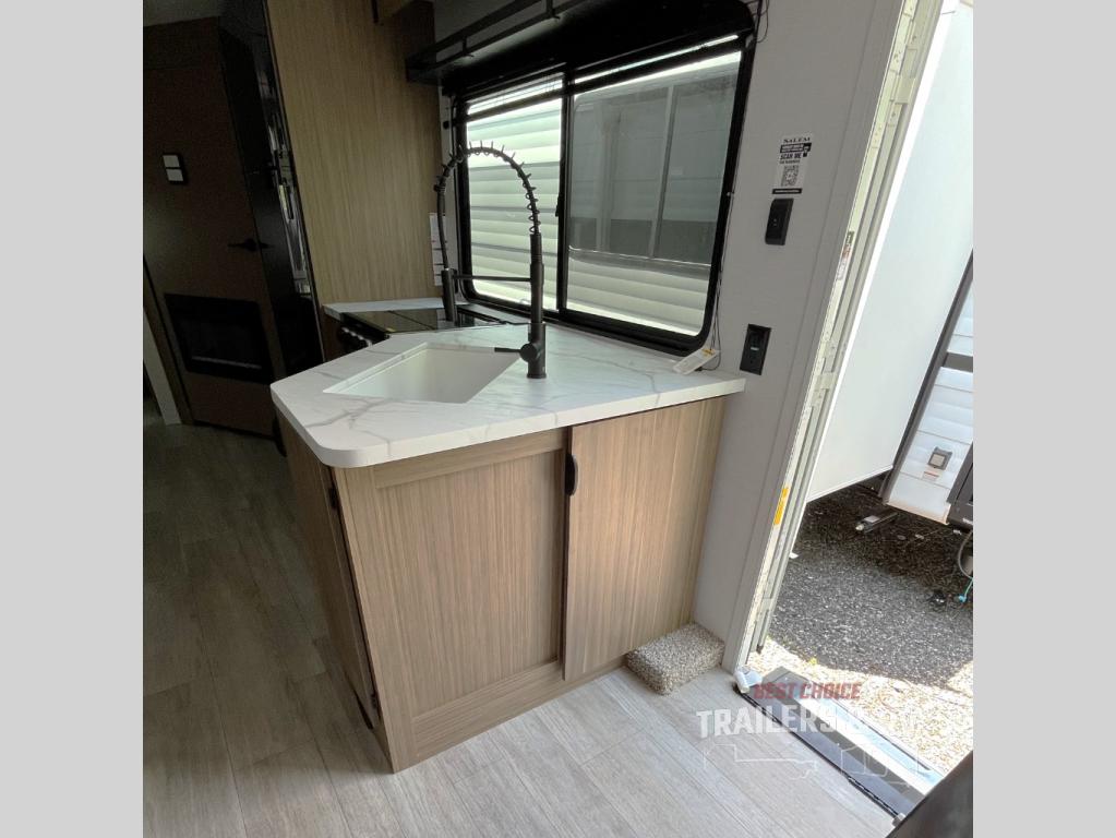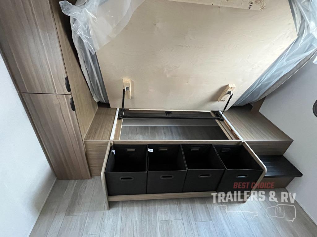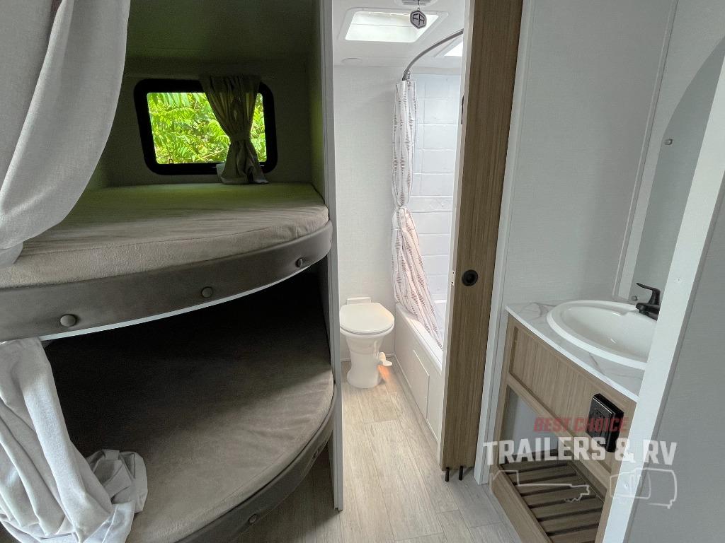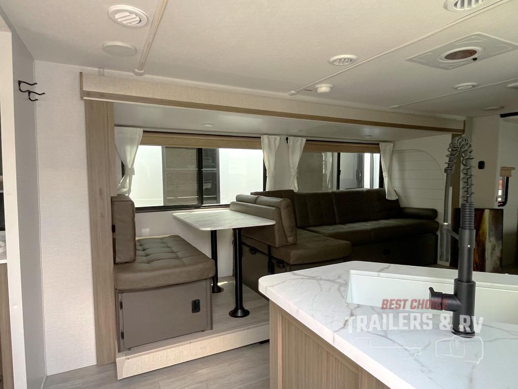 You're sure to make camping memories in this spacious travel trailer! You can easily sleep eight people each night thanks to the double-size bunks, the custom king bed with Versa Tilt in the front bedroom plus the Versa-Lounge within the large slide out! The cooktop and microwave oven will let you make meals each day, and you'll appreciate the hidden pantry with shelves behind the fireplace. There is also a booth dinette where you can dine together or play a game of cards after dinner is cleaned up, or you may just find yourselves outdoors under the 18' awning with 4K blade lighting. And don't overlook the full bath, complete with a tub/shower that will make bath time easier if you have little ones.