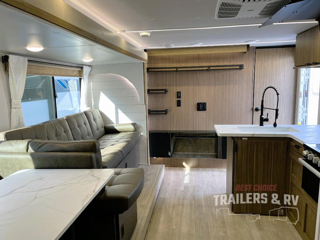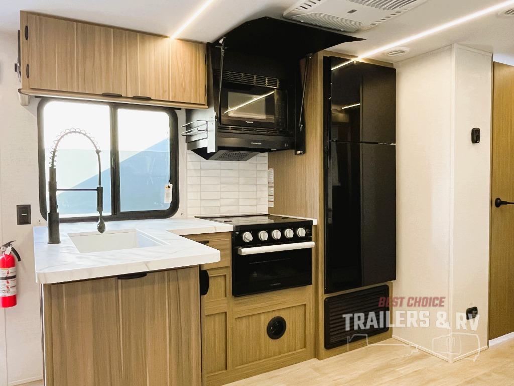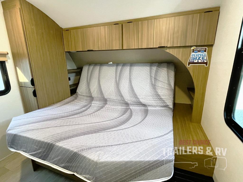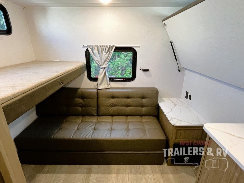 This travel trailer is new to the lineup and offers a large amount of versatility! The rear private bunkhouse has two 30" x 74" Versa-bunks and a Versa-queen bed so that more can join in on the camping fun. Start each morning feeling clean and fresh after showering in the walk-in shower with fiberglass surround then head to the front private bedroom to change. The kitchen has an oversized refrigerator to keep your perishables fresh, a cooktop for meals, and a U-shaped dinette for dining, game time, or just hanging out.