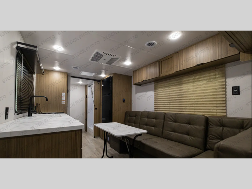 Camping is made easy in this travel trailer with at-home comforts! You'll have the front private bedroom with a king bed all to yourselves, and there are dual bedroom wardrobes to keep your space neat and clean. Any additional guests can sleep on the super lounge with a removable table. You will appreciate the full rear bath complete with a linen closet and dual bath sinks so you both can get ready for bed at once. And a full kitchen lets you whip up your best meals!