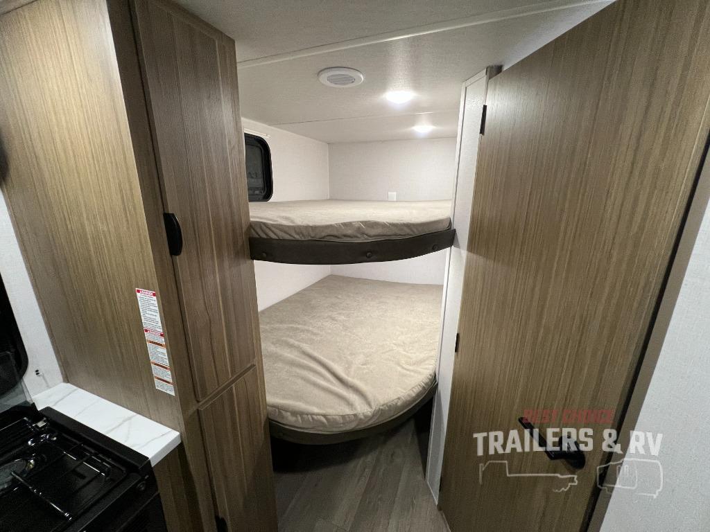 Camping is made easy in this travel trailer with more sleeping space and lots of comforts! The kids or your guests will enjoy the double-size bunks in the back, along with the full bath close by for easy nighttime use. You'll have the front private bedroom with a custom king bed all to yourselves, and there are dual bedroom wardrobes to keep your space neat and clean. Everyone can meet in the combined kitchen and living room to relax on the super U-lounge with a removable table while the chef of your group makes breakfast on the two-burner cooktop. There is also a microwave oven for quick meals, plus a pantry and refrigerator for food storage!
