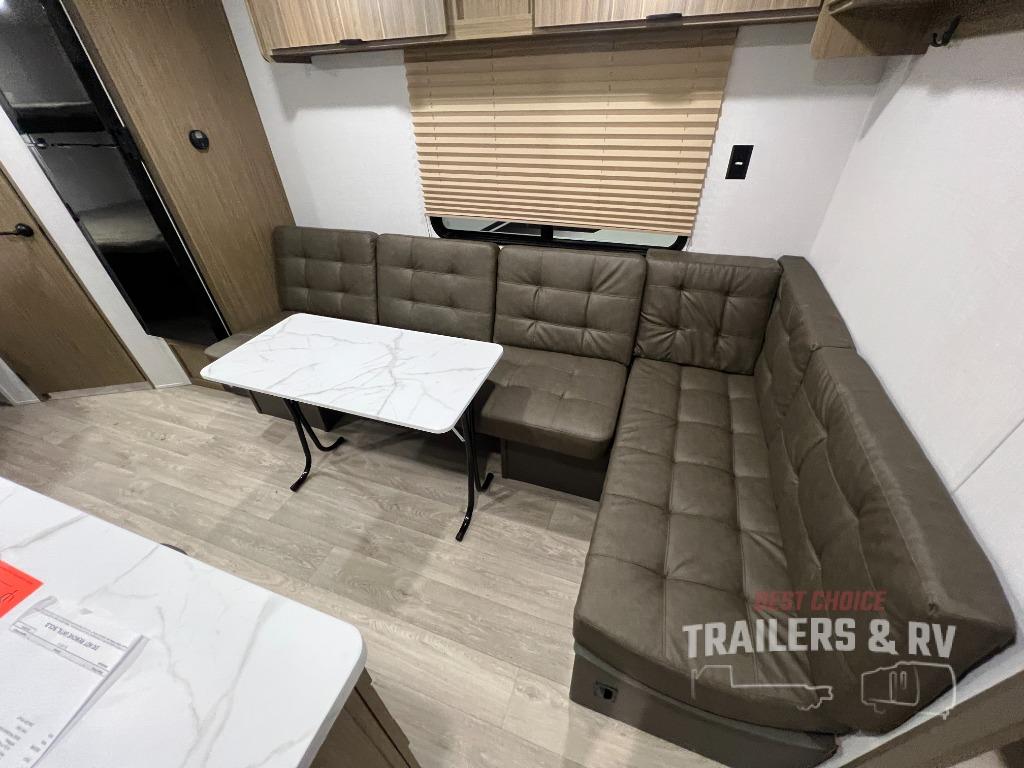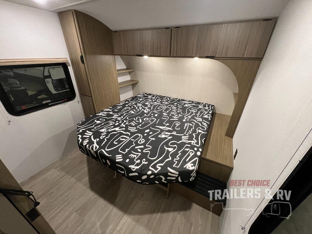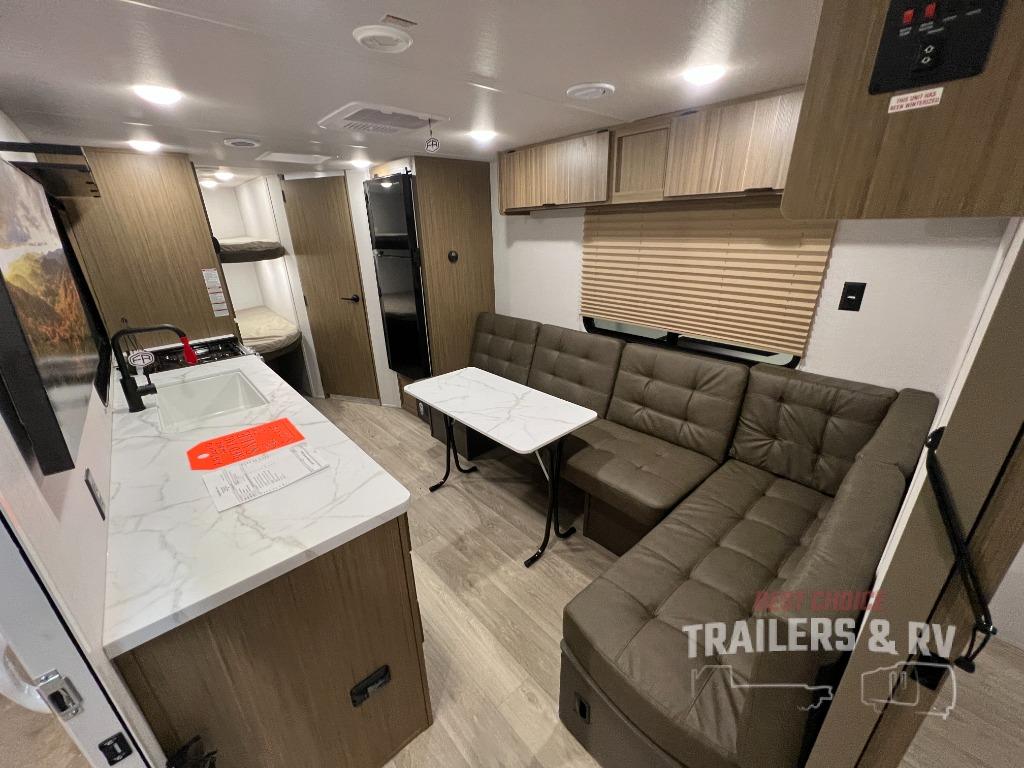 Camping is made easy in this travel trailer with more sleeping space and lots of comforts! The kids or your guests will enjoy the double-size bunks in the back, along with the full bath close by for easy nighttime use. You'll have the front private bedroom with a custom king bed all to yourselves, and there are dual bedroom wardrobes to keep your space neat and clean. Everyone can meet in the combined kitchen and living room to relax on the super U-lounge with a removable table while the chef of your group makes breakfast on the two-burner cooktop. There is also a microwave oven for quick meals, plus a pantry and refrigerator for food storage!
