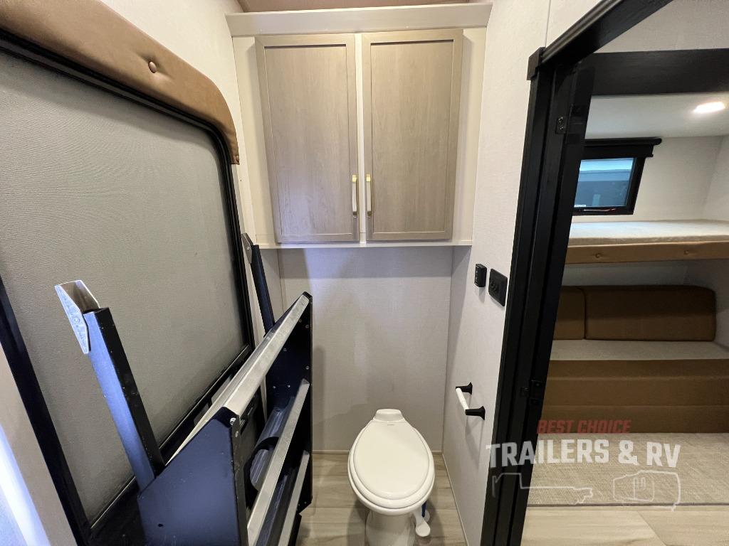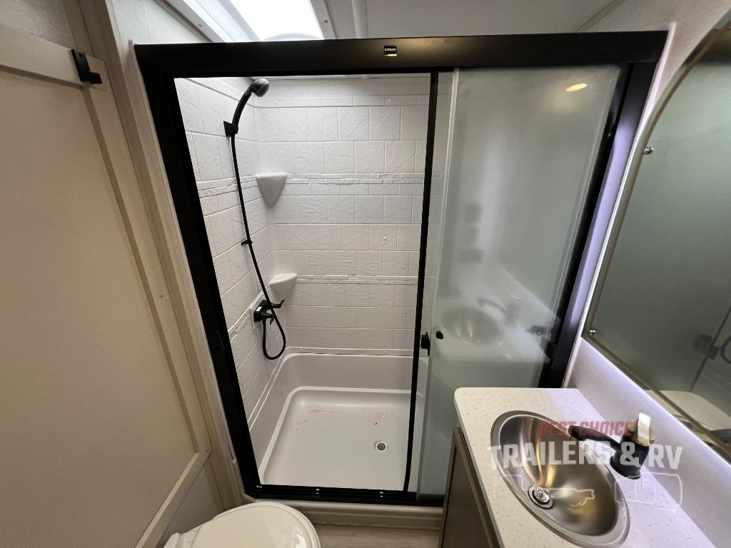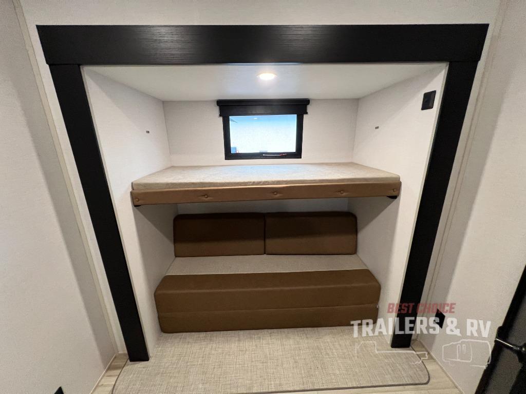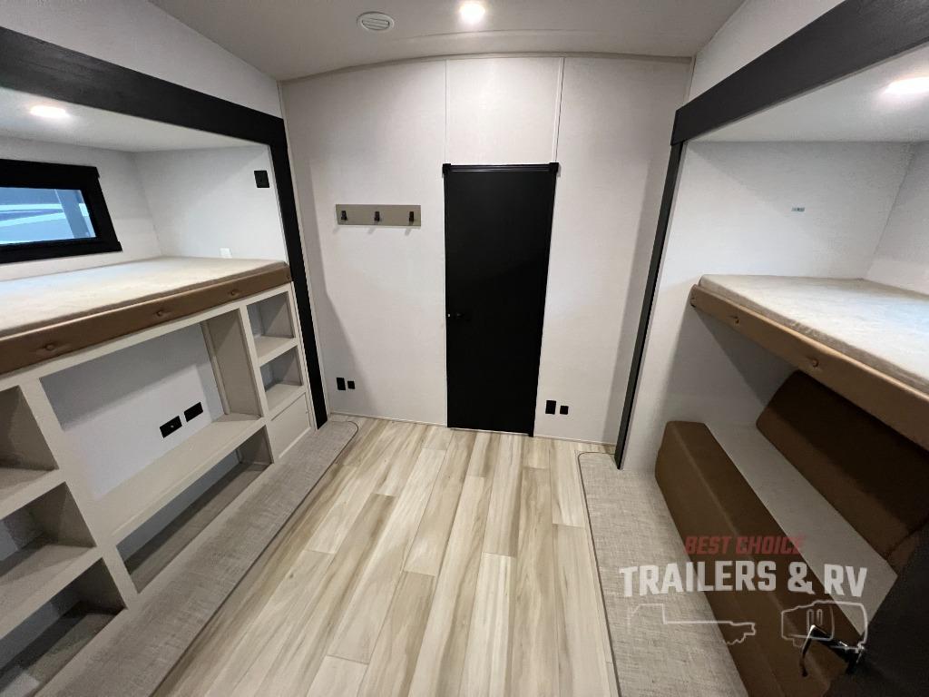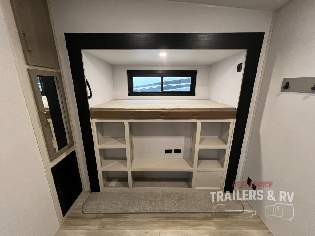 With two full bathrooms, everyone will stay clean in this fifth wheel! The double entry doors makes for a smooth flow of traffic and the unique rear entrance leads directly into the rear full bathroom. The private bunkhouse features not only one bunk above a Versa queen convertible bed/sofa, but also a second bunk above with storage. The U-shaped dinette is the perfect place for you to enjoy your meals at, play some card games and even transform into an extra sleeping space. The exterior has plenty of features you will love too like the outside kitchen/bar so you can have a good time cooking outdoors and a coax/TV hookup that you can add your own outside TV, plus an extra large pass-through storage area for your outdoor gear. When you're ready for bed, the custom king bed will be waiting for you in the front private bedroom!