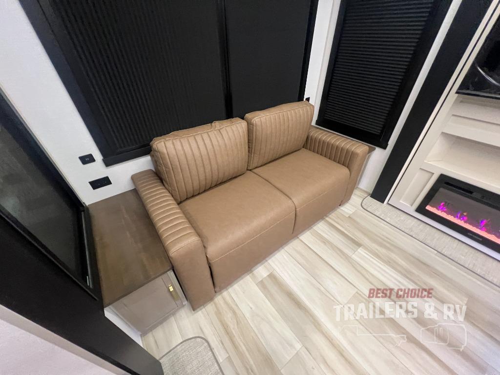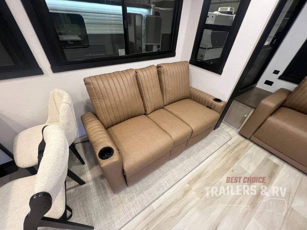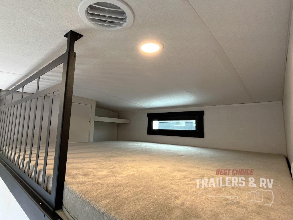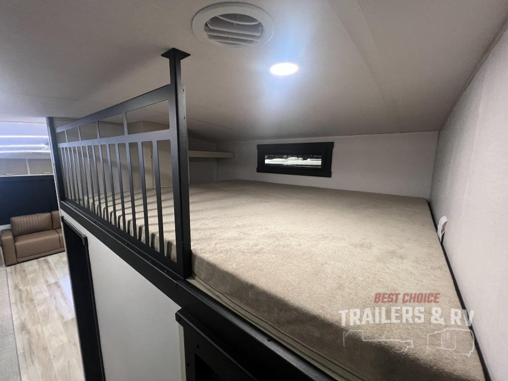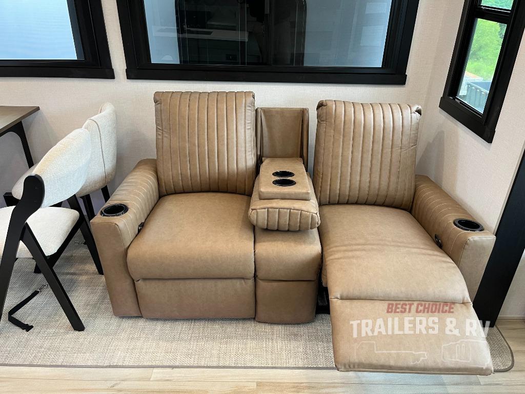 You won't know where to begin when you enter this fifth wheel! The rear living area has plenty of entertainment and seating choices between the tri-fold sofa and the theatre seating with cupholders, and the 50" LED TV will be perfect for movie nights. Meal prepping and clean up will be a breeze thanks to the kitchen island with a large sink, and the deluxe French door pantry that is big enough to store everyone's favorite snacks. Inside the middle bunkhouse, you will find a bunk with a Versa queen convertible bed/sofa below it and a loft above this room, plus there is a desk with a TV hookup and a dresser with a wardrobe. The outside also has lots of features you will love like the exterior storage with a refrigerator, the coax/TV hookup, two awnings and the Texas-sized pass-through storage area!