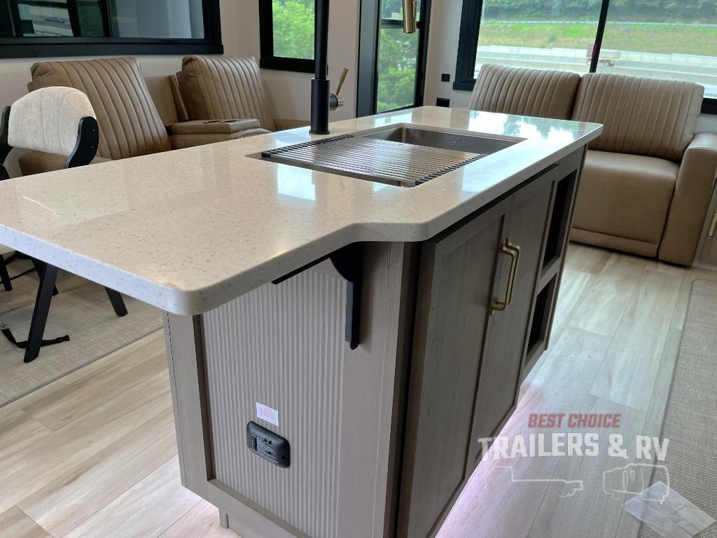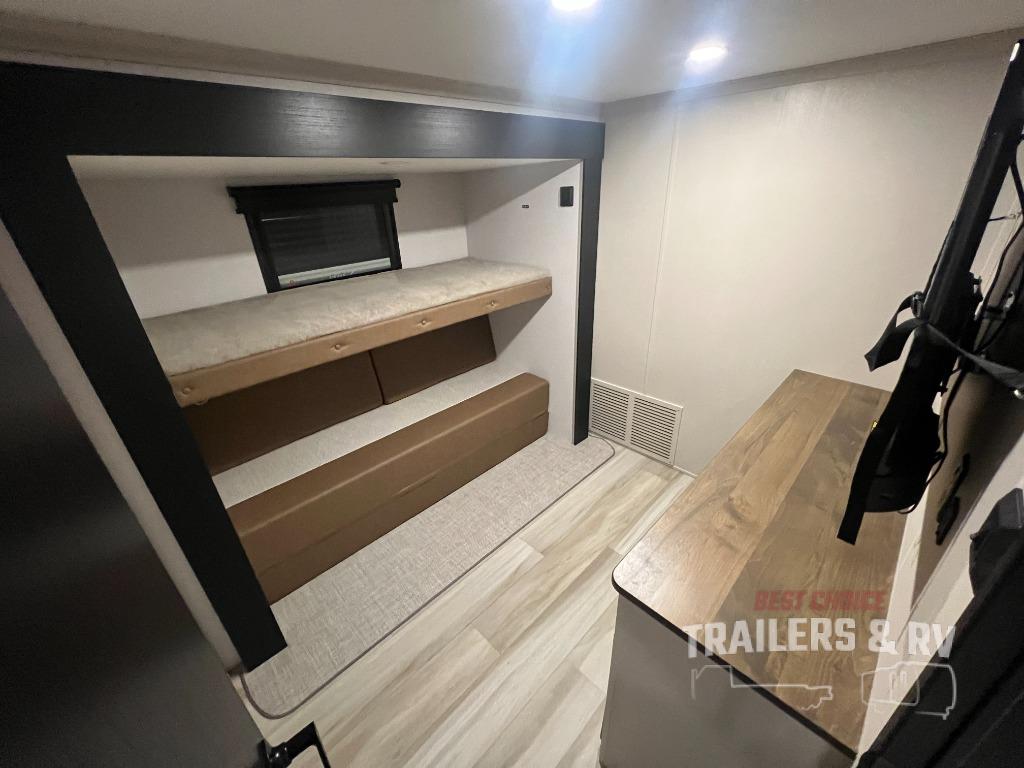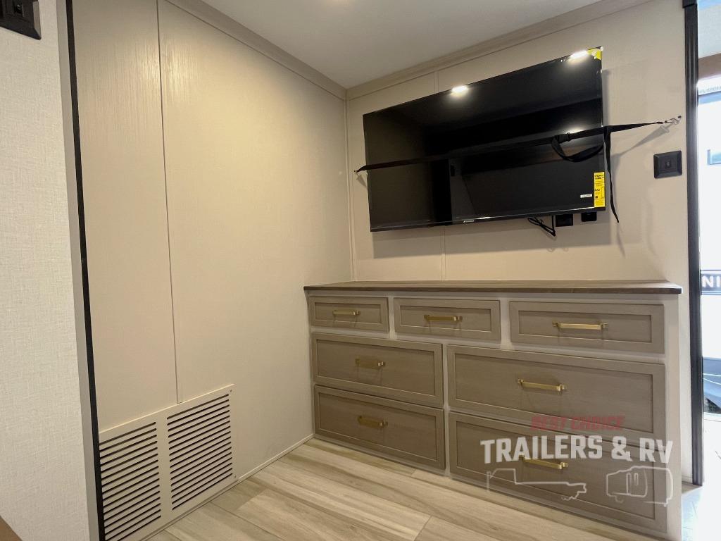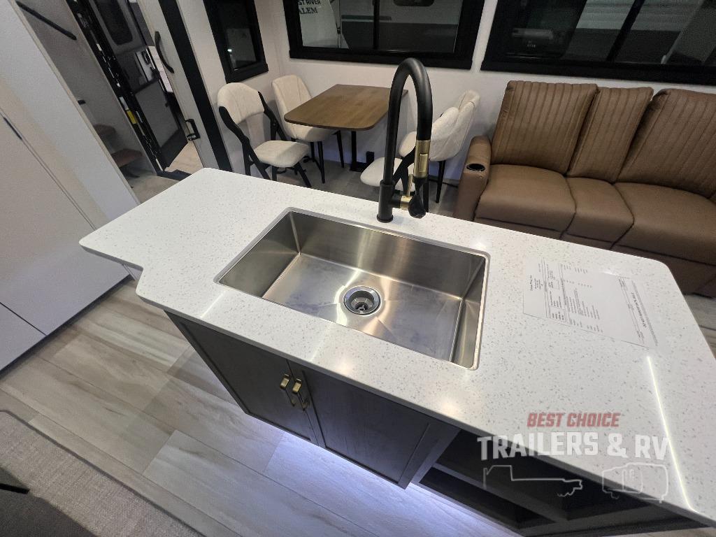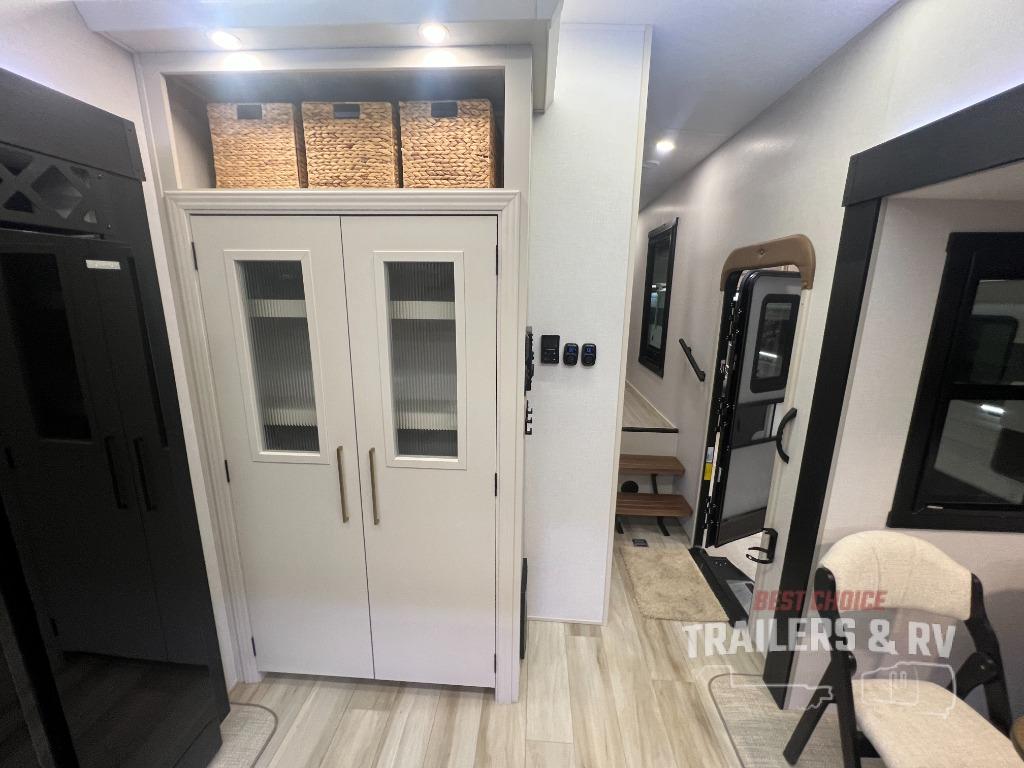 You won't know where to begin when you enter this fifth wheel! The rear living area has plenty of entertainment and seating choices between the tri-fold sofa and the theatre seating with cupholders, and the 50" LED TV will be perfect for movie nights. Meal prepping and clean up will be a breeze thanks to the kitchen island with a large sink, and the deluxe French door pantry that is big enough to store everyone's favorite snacks. Inside the middle bunkhouse, you will find a bunk with a Versa queen convertible bed/sofa below it and a loft above this room, plus there is a desk with a TV hookup and a dresser with a wardrobe. The outside also has lots of features you will love like the exterior storage with a refrigerator, the coax/TV hookup, two awnings and the Texas-sized pass-through storage area!