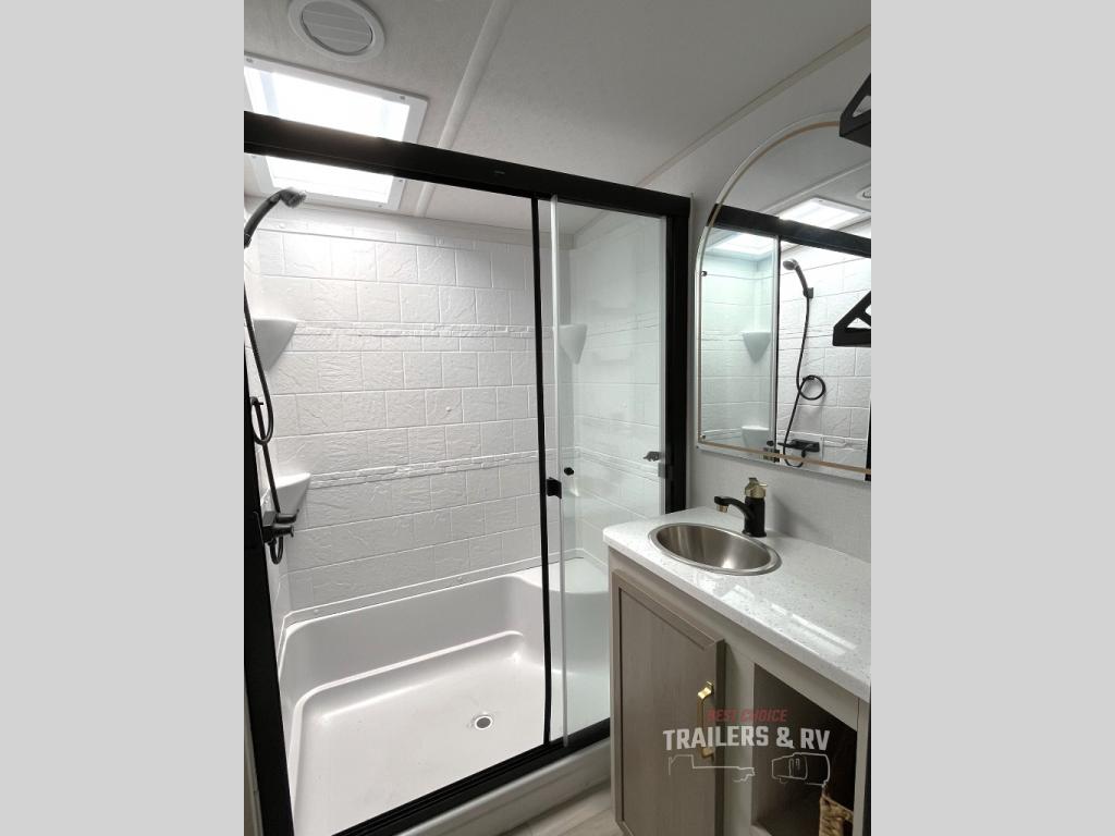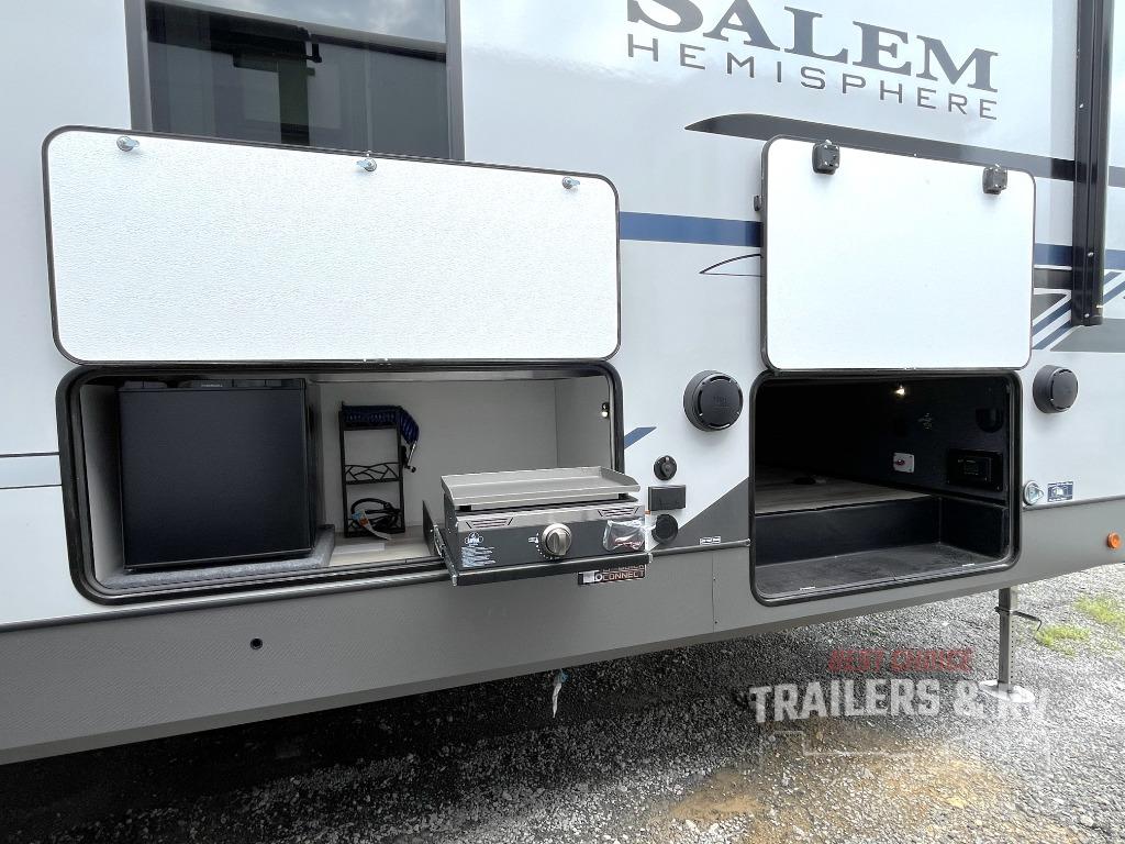 The Salem Hemisphere fifth wheels and travel trailers by Forest River are packed with features, while still being value-minded! Each model is constructed with laminated "Aluma Frame" sidewalls and floor with block foam insulation plus full length barreled ceilings for added head space. There are LED awning, marker and tail lights outside, along with an extra large pass-thru storage with slam latch baggage doors, plus solar prep and Lippert On-The-Go ladder prep. The 60K on-demand tankless water heater will provide endless hot showers, and the JBL sound system includes a head unit plus interior and exterior speakers to keep the party going. There are also many interior comforts found throughout that will make you feel right at home!