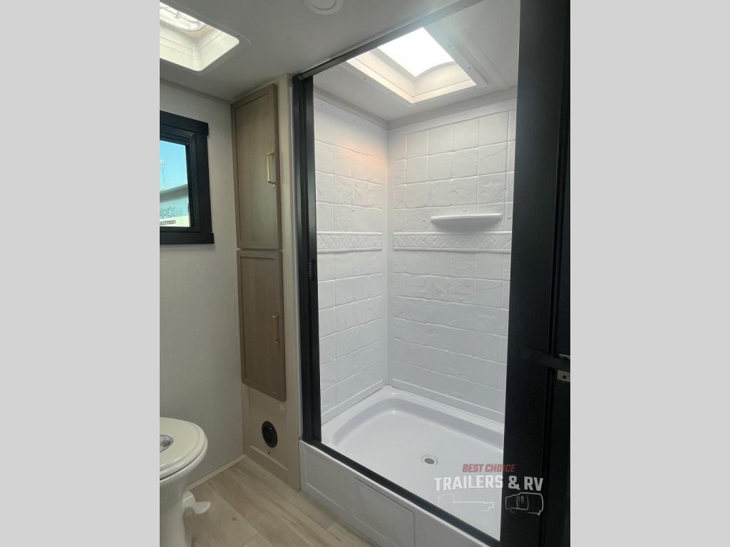With any Salem Hemisphere Hyper-Lyte travel trailer by Forest River, you will appreciate a wide stance axle and Maxxis radial tires for smooth towing, plus laminated "Aluma Frame" sidewalls and floor for added durability. There are also square windows with built-in shades with reflecting thermal-foil backing to help keep your trailer cool during the summer. The 2" accessory hitch receiver will allow you to bring along more camp gear and the tankless water heater is a feature you won't want to camp without! Inside, you'll find Temple Cherry cabinetry, wood door casings in place of plastic, a residential single bowl undermount sink, and many more comforts. Outside, your furry friend will be happy with the shaded pet tether and security hook, and there is even an outside shower with hot and cold water to fill the dogs water bowl and wash off hiking boots!