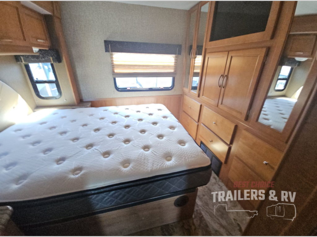 As you head toward the rear of the coach find a large vanity with sink on the left, plus a private toilet and shower with linen cabinet on the right. Beyond the bath area find a queen bed slide with overhead storage including nightstands on both sides of the bed. There is also a wardrobe and drawers on the opposite side of the bed for all of your clothing storage needs, and so much more!