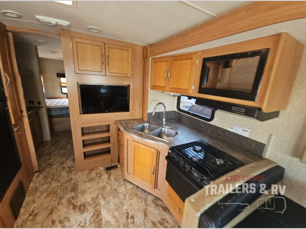 Opposite the door side is a slide out booth dinette and three burner range, plus a double sink. An entertainment center is located along the interior wall near the dinette slide for your enjoyment.