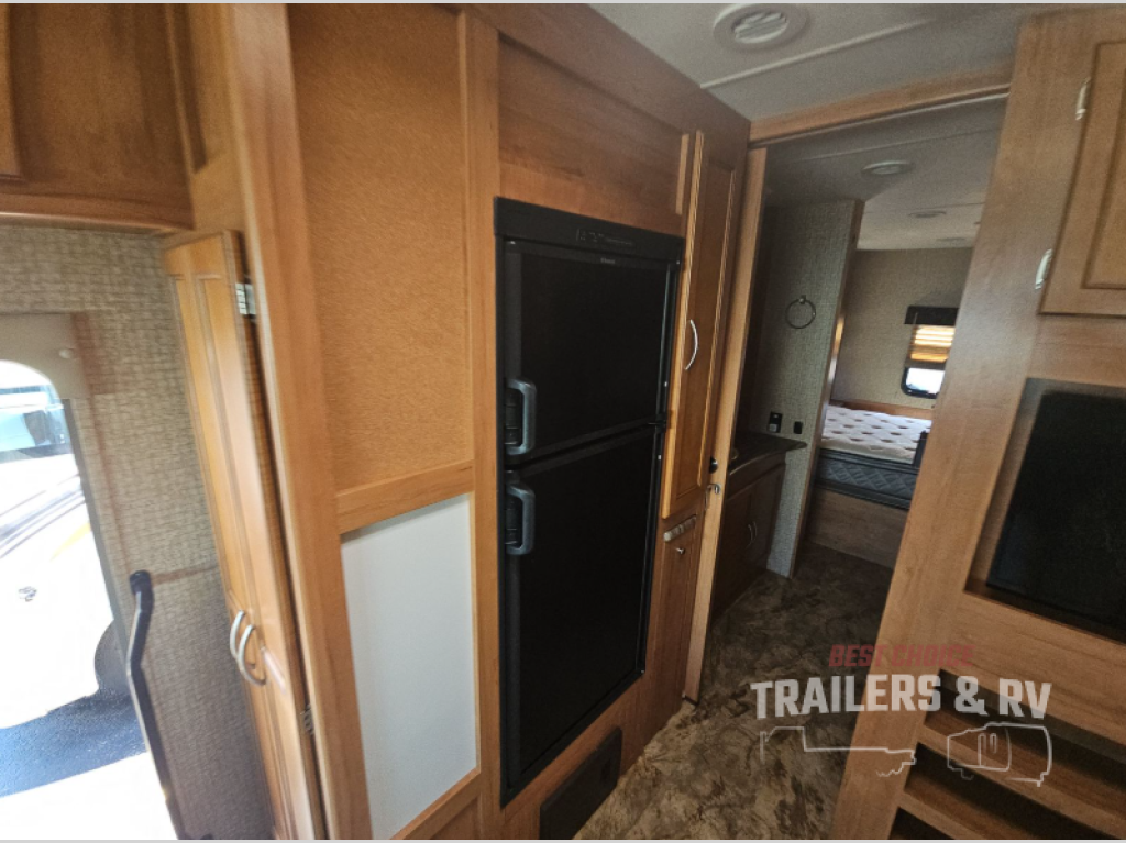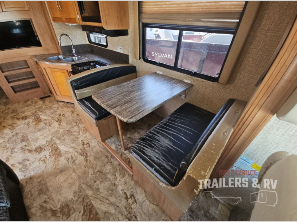 Model 29SB features a jack-knife sofa to the right of the entry door which includes overhead storage. There is an electric drop down bunk above the cab area for additional sleeping space if needed also.