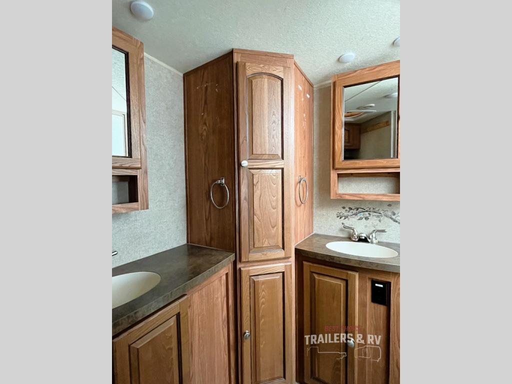 The bathroom is located within the v-nose of the travel trailer. It includes a toilet, double vanity sinks with medicine cabinets, lots of counter space, linen storage and a garden shower.