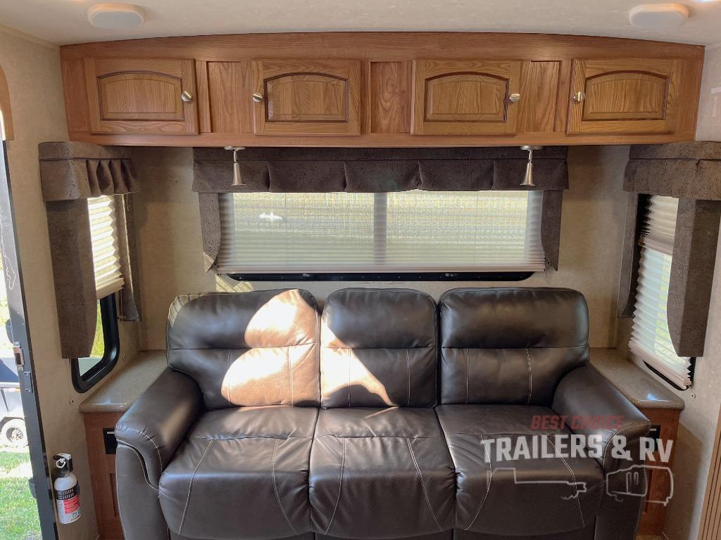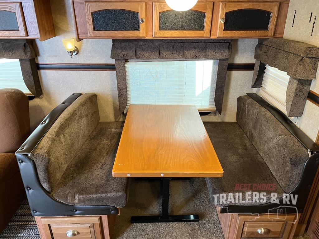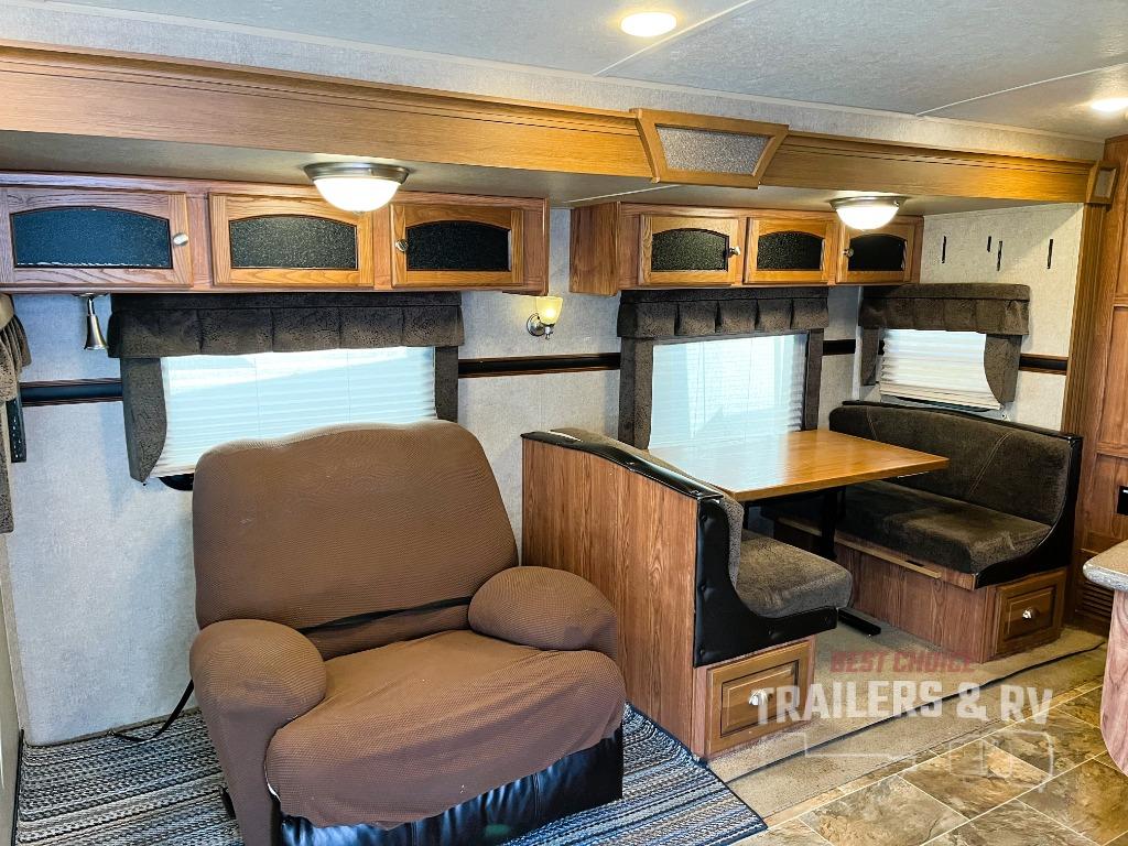 The combined living/kitchen area includes a slide that with a booth dinette, two standard chairs and overhead cabinets. You may choose two optional recliners or optional theater seating. The rear wall offers a hide-a-bed sofa with end tables on each end and overhead cabinets above. An outside door is on the wall just off the end of the sofa.