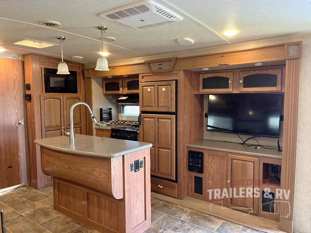 A kitchen island with large single bowl sink stands in the middle of the open living space. A slide out has an entertainment center with TV, optional fireplace, overhead cabinets, a refrigerator, and three burner range. A microwave and pantry are on an inside wall.